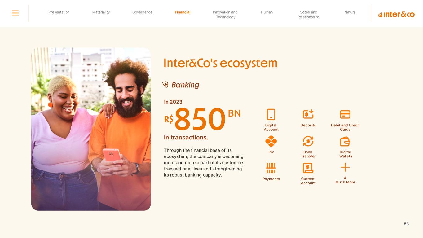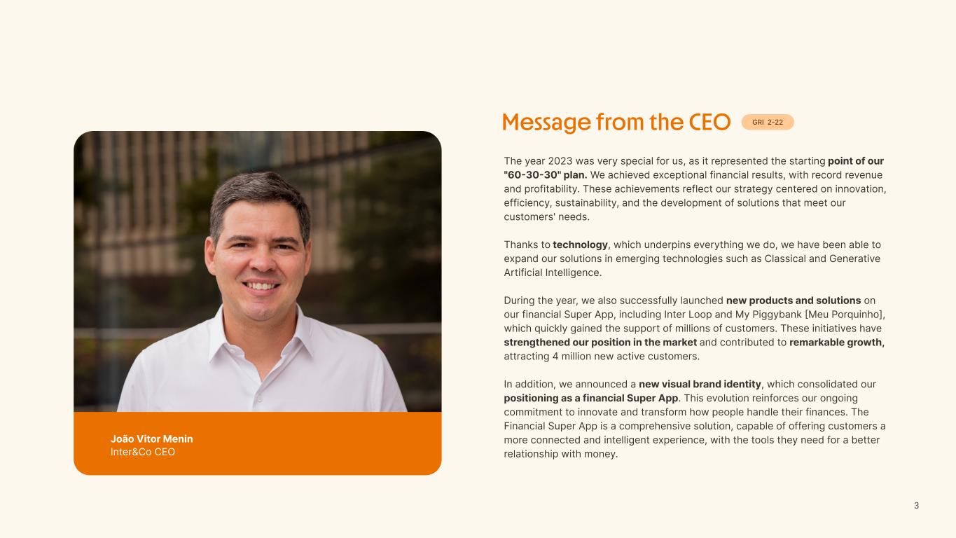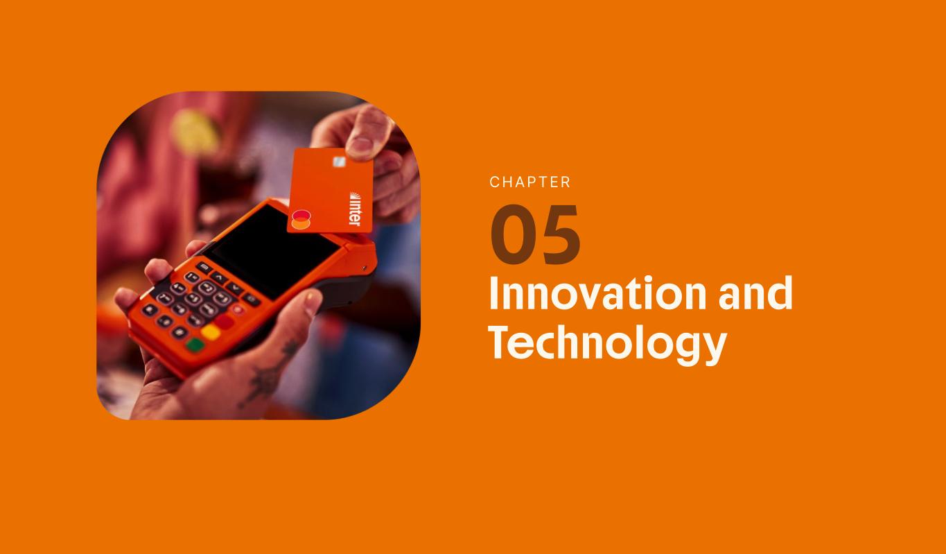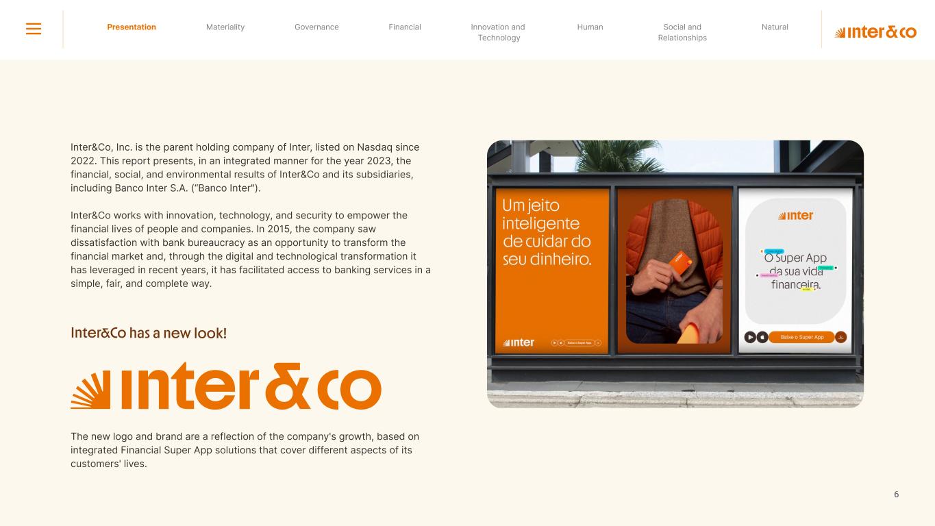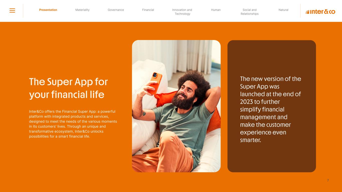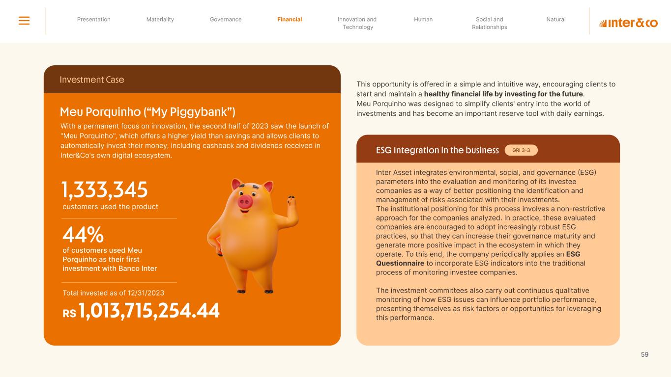 Insurance Health Through the Financial Super App, Inter&Co's activities transcend banking barriers and reach the generation of positive impact on several fronts and for multiple audiences, for society, and the environment. Digital account Corporate account Pix Kids Account Credit card Banking Pay order on credit Digital credit card Pix on credit Real Estate Credit Advance of FGTS Payroll Loan Credit More limit savings Vehicle financing Consortiums Credit Investment platform Meu Porquinho (“My Piggybank”) Investe Fácil (“Invest Easy”) Savings Private pension Investments Exchange points for miles Exchange points for dollars Exchange points for a discount on your bill Exchange points for extra cashback Exchange points for cashback directly on your bill Exchange points for investments in Meu Porquinho (“My Piggybank”) Loop Life insurance Pix Insurance More protected card Travel insurance Home insurance Dental plan Pet health plan Telemedicine Shopping Travel Duo Gourmet Recharge Shell Box Cell Phone Plans Gift Card Sustainable Living Shopping & experiences Inter&Co's Annual Report presents the company's results in generating shared value for its various stakeholder groups, contributing to advancement of the ESG agenda by strengthening the integration of governance, people, and environmental issues at the company and its purpose of unlocking possibilities for an intelligent financial life. Looking beyond the horizon, we are excited about the prospects for 2024. We are focused on delivering the second year of our "60-30-30 Plan". Our ongoing quest to drive innovation and technology, which was even the most popular material topic in our stakeholder survey in 2023, will unlock even more possibilities for a smarter financial life for our customers. ESG at Inter&Co Strategic vision driven by technology and innovation Inter&Co offers the Financial Super App: a powerful platform with integrated products and services, designed to meet the needs of the various moments in its customers' lives. Through an unique and transformative ecosystem, Inter&Co unlocks possibilities for a smart financial life. The Super App for your financial life João Vitor Menin Inter&Co CEO Banking products Non-banking products 01 2023 Annual Report | Pocket Version Download the full report