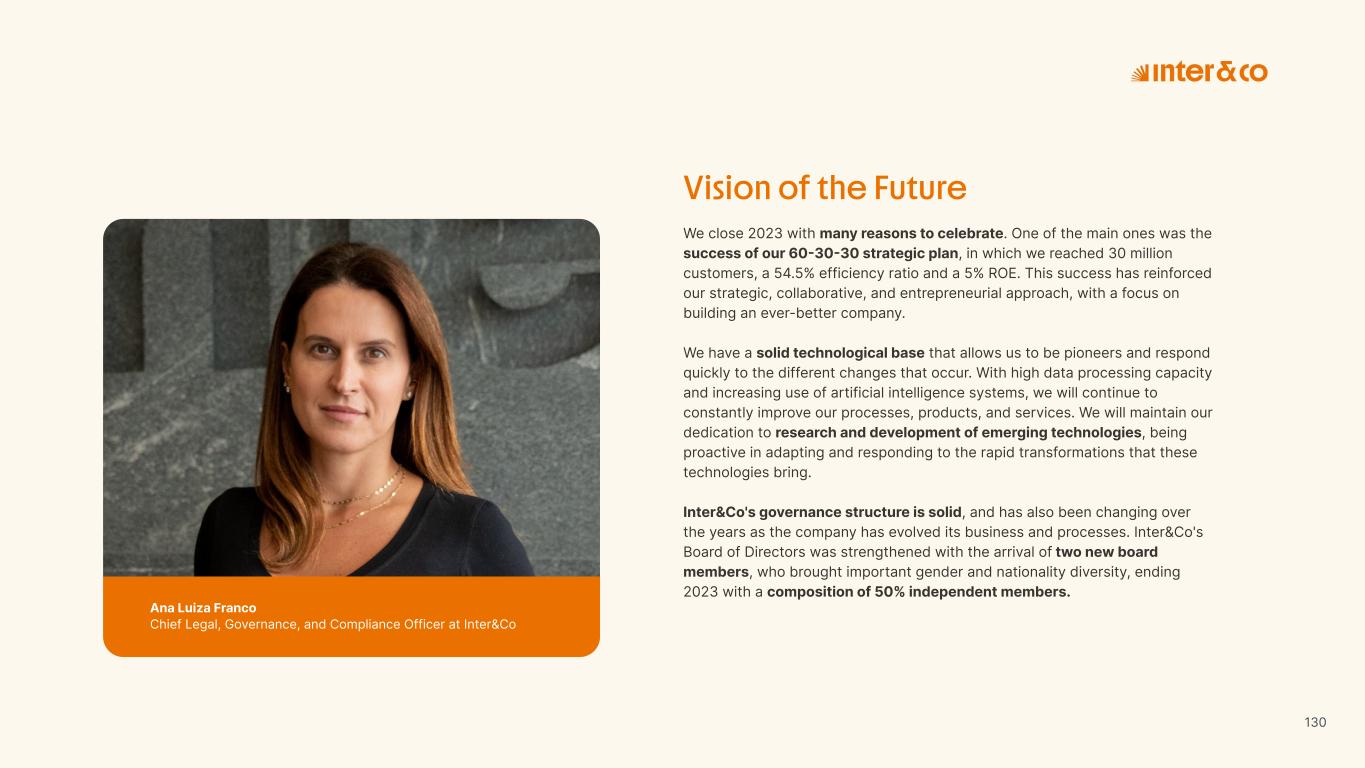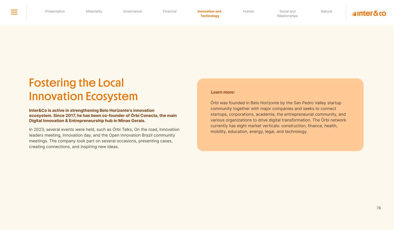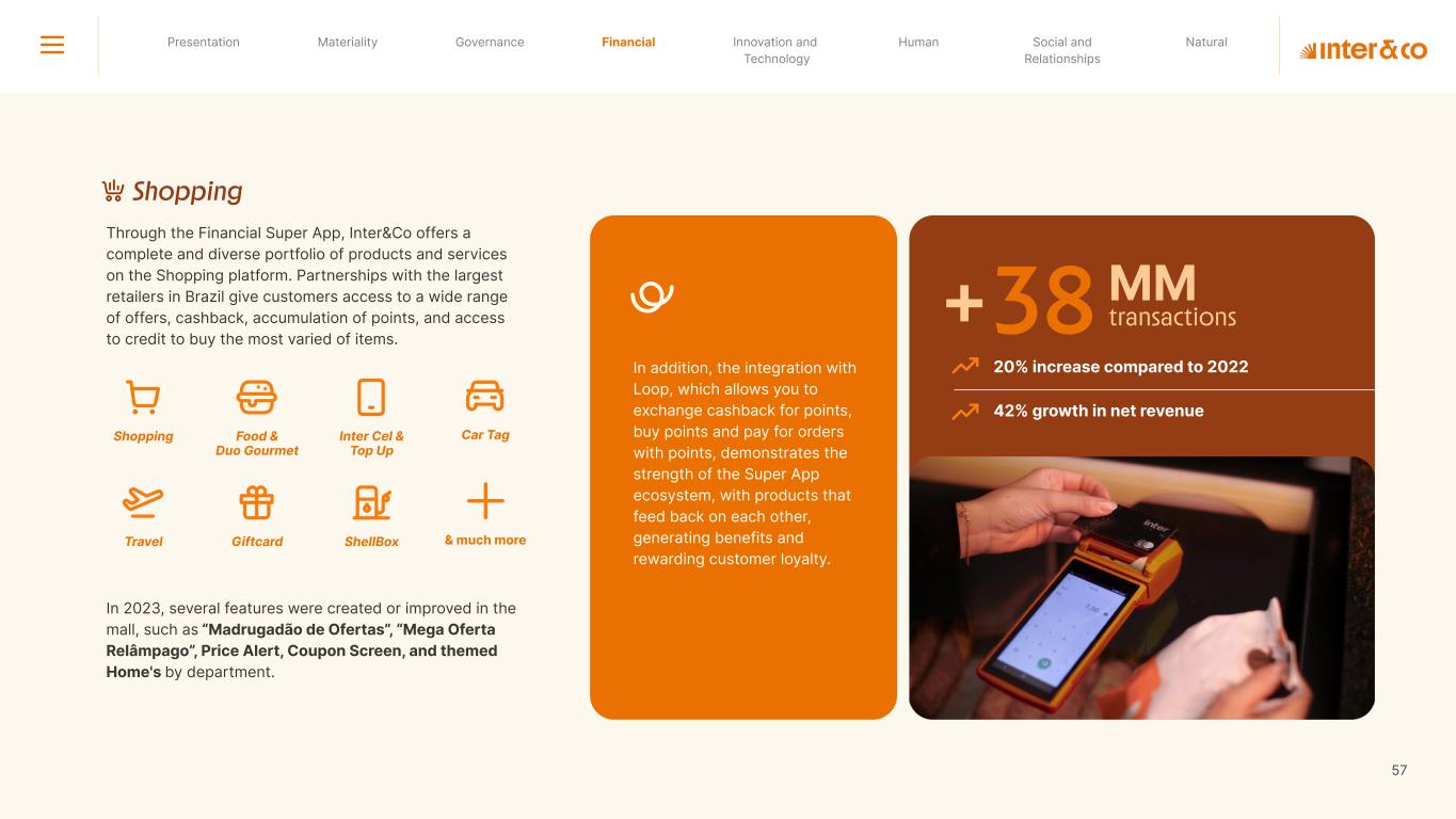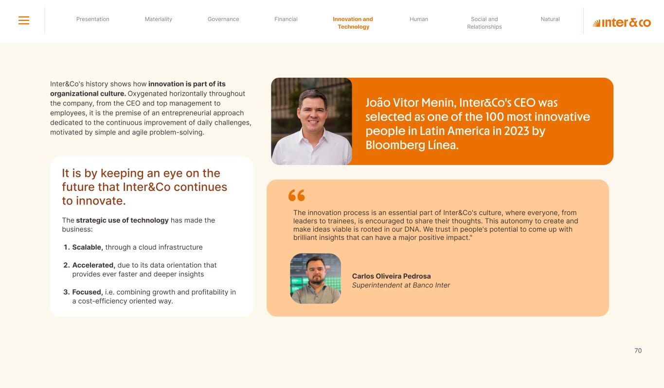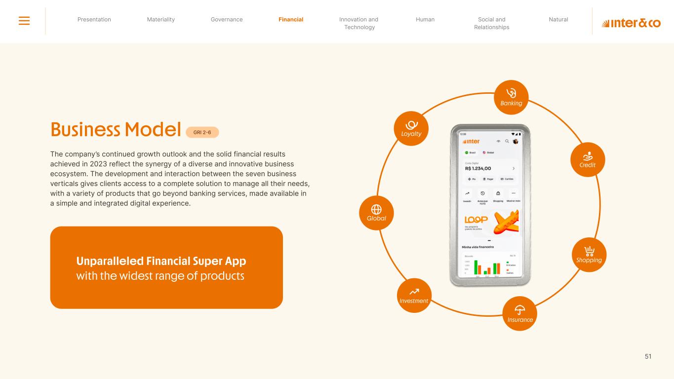 Insurance Health Through the Financial Super App, Inter&Co's activities transcend banking barriers and reach the generation of positive impact on several fronts and for multiple audiences, for society, and the environment. Digital account Corporate account Pix Kids Account Credit card Banking Pay order on credit Digital credit card Pix on credit Real Estate Credit Advance of FGTS Payroll Loan Credit More limit savings Vehicle financing Consortiums Credit Investment platform Meu Porquinho (“My Piggybank”) Investe Fácil (“Invest Easy”) Savings Private pension Investments Exchange points for miles Exchange points for dollars Exchange points for a discount on your bill Exchange points for extra cashback Exchange points for cashback directly on your bill Exchange points for investments in Meu Porquinho (“My Piggybank”) Loop Life insurance Pix Insurance More protected card Travel insurance Home insurance Dental plan Pet health plan Telemedicine Shopping Travel Duo Gourmet Recharge Shell Box Cell Phone Plans Gift Card Sustainable Living Shopping & experiences Inter&Co's Annual Report presents the company's results in generating shared value for its various stakeholder groups, contributing to advancement of the ESG agenda by strengthening the integration of governance, people, and environmental issues at the company and its purpose of unlocking possibilities for an intelligent financial life. Looking beyond the horizon, we are excited about the prospects for 2024. We are focused on delivering the second year of our "60-30-30 Plan". Our ongoing quest to drive innovation and technology, which was even the most popular material topic in our stakeholder survey in 2023, will unlock even more possibilities for a smarter financial life for our customers. ESG at Inter&Co Strategic vision driven by technology and innovation Inter&Co offers the Financial Super App: a powerful platform with integrated products and services, designed to meet the needs of the various moments in its customers' lives. Through an unique and transformative ecosystem, Inter&Co unlocks possibilities for a smart financial life. The Super App for your financial life João Vitor Menin Inter&Co CEO Banking products Non-banking products 01 2023 Annual Report | Pocket Version Download the full report