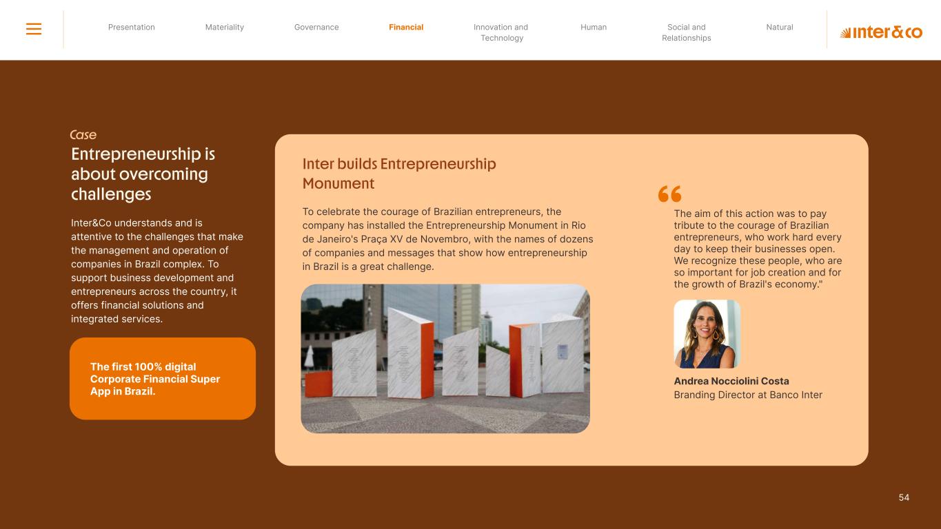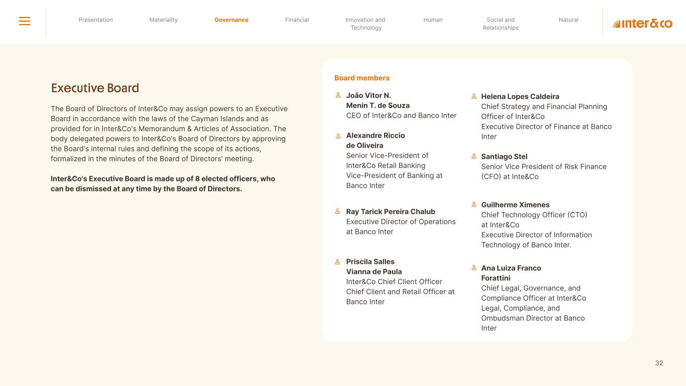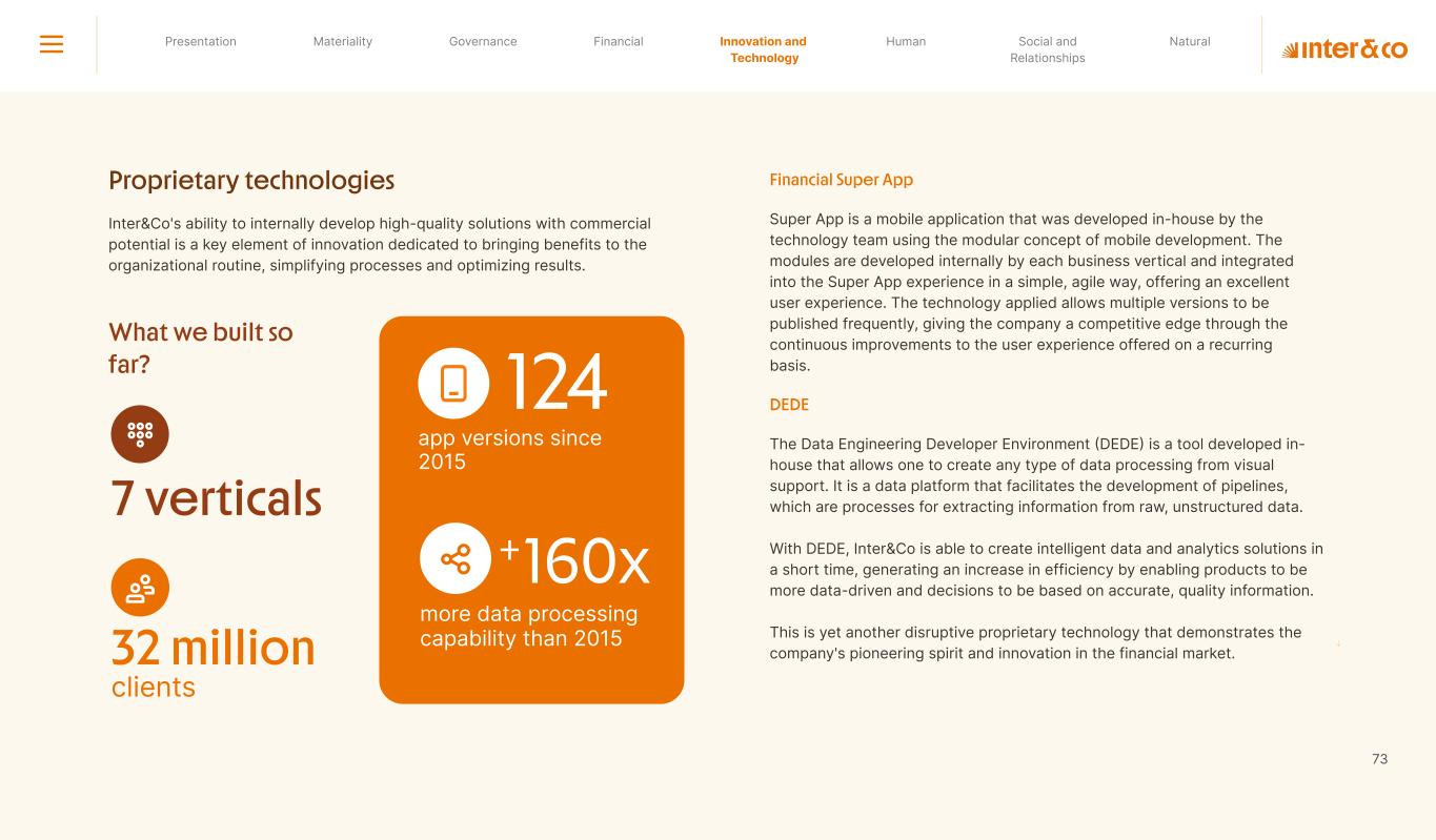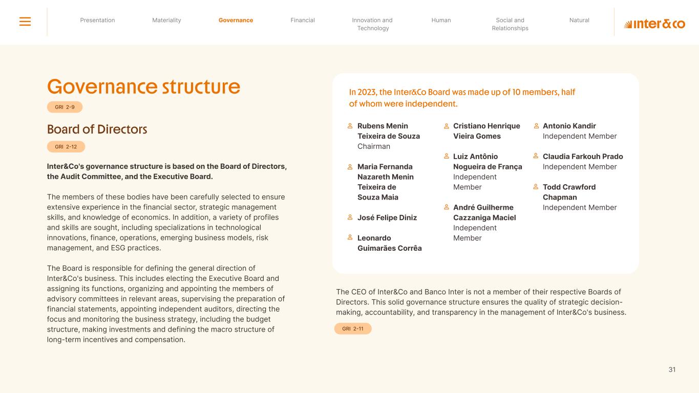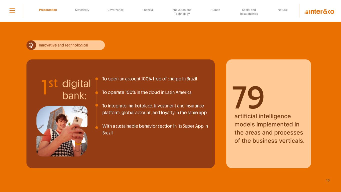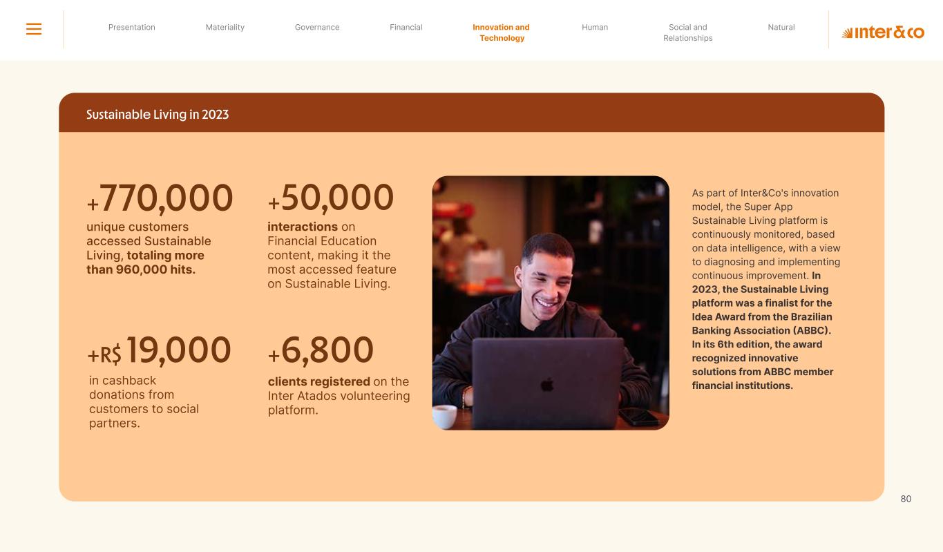 Insurance Health Through the Financial Super App, Inter&Co's activities transcend banking barriers and reach the generation of positive impact on several fronts and for multiple audiences, for society, and the environment. Digital account Corporate account Pix Kids Account Credit card Banking Pay order on credit Digital credit card Pix on credit Real Estate Credit Advance of FGTS Payroll Loan Credit More limit savings Vehicle financing Consortiums Credit Investment platform Meu Porquinho (“My Piggybank”) Investe Fácil (“Invest Easy”) Savings Private pension Investments Exchange points for miles Exchange points for dollars Exchange points for a discount on your bill Exchange points for extra cashback Exchange points for cashback directly on your bill Exchange points for investments in Meu Porquinho (“My Piggybank”) Loop Life insurance Pix Insurance More protected card Travel insurance Home insurance Dental plan Pet health plan Telemedicine Shopping Travel Duo Gourmet Recharge Shell Box Cell Phone Plans Gift Card Sustainable Living Shopping & experiences Inter&Co's Annual Report presents the company's results in generating shared value for its various stakeholder groups, contributing to advancement of the ESG agenda by strengthening the integration of governance, people, and environmental issues at the company and its purpose of unlocking possibilities for an intelligent financial life. Looking beyond the horizon, we are excited about the prospects for 2024. We are focused on delivering the second year of our "60-30-30 Plan". Our ongoing quest to drive innovation and technology, which was even the most popular material topic in our stakeholder survey in 2023, will unlock even more possibilities for a smarter financial life for our customers. ESG at Inter&Co Strategic vision driven by technology and innovation Inter&Co offers the Financial Super App: a powerful platform with integrated products and services, designed to meet the needs of the various moments in its customers' lives. Through an unique and transformative ecosystem, Inter&Co unlocks possibilities for a smart financial life. The Super App for your financial life João Vitor Menin Inter&Co CEO Banking products Non-banking products 01 2023 Annual Report | Pocket Version Download the full report