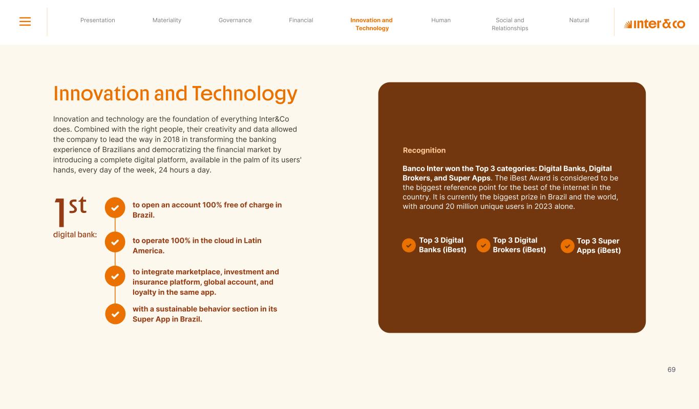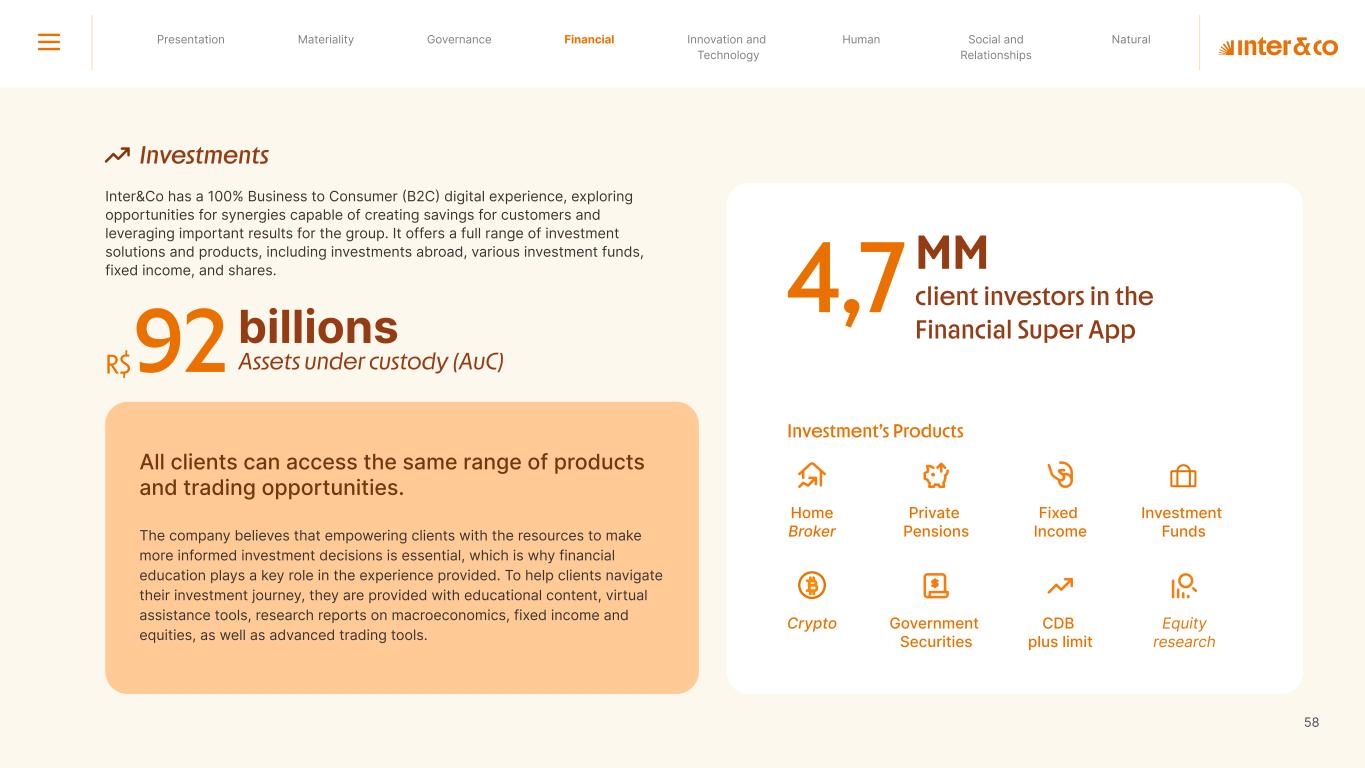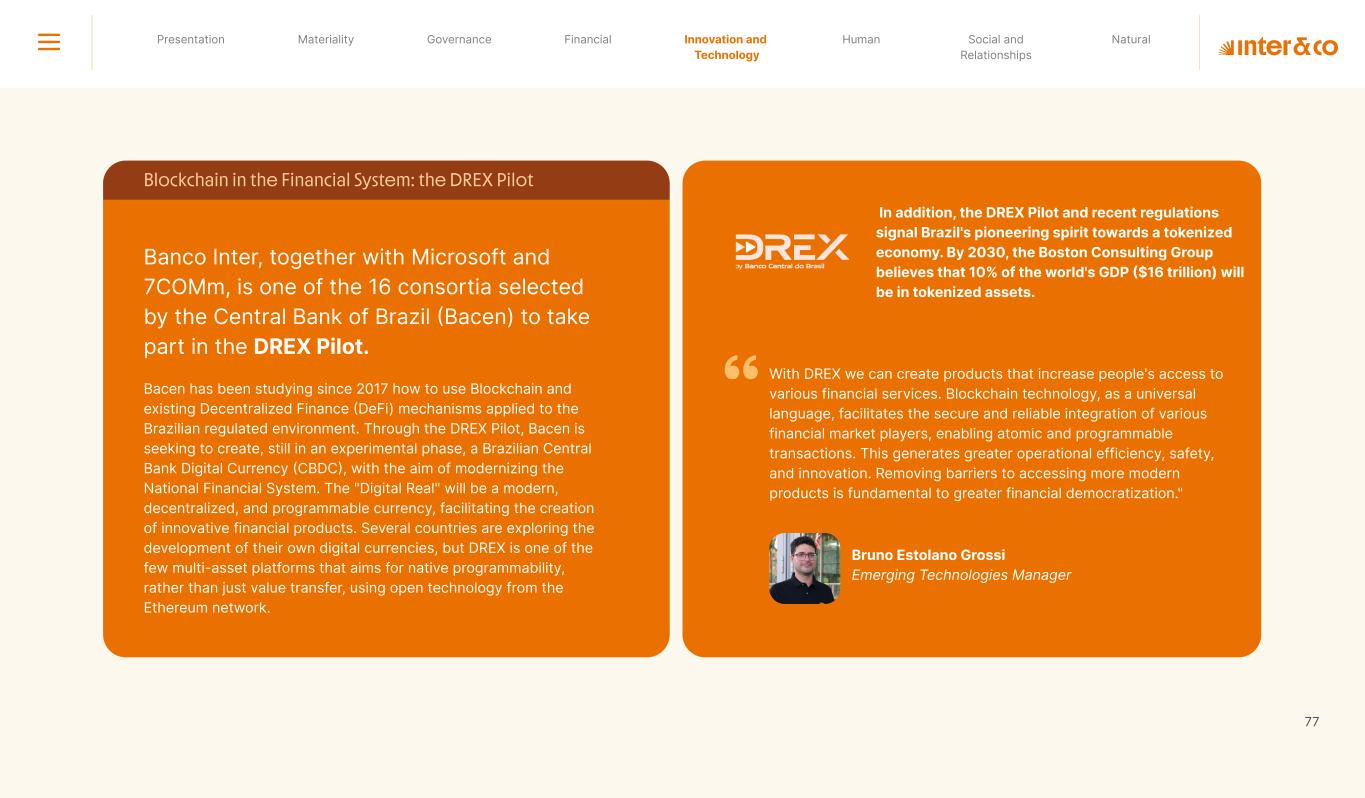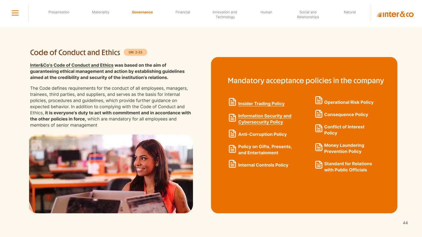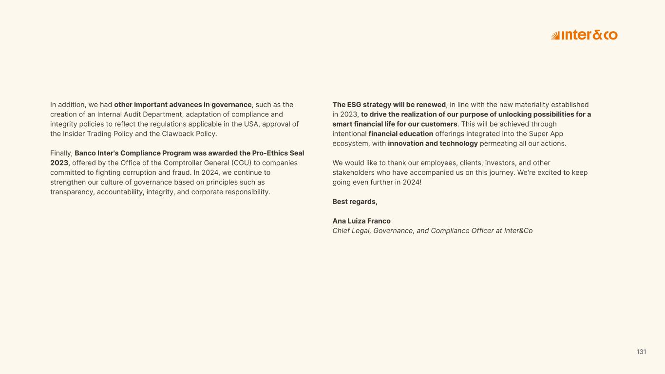 Insurance Health Through the Financial Super App, Inter&Co's activities transcend banking barriers and reach the generation of positive impact on several fronts and for multiple audiences, for society, and the environment. Digital account Corporate account Pix Kids Account Credit card Banking Pay order on credit Digital credit card Pix on credit Real Estate Credit Advance of FGTS Payroll Loan Credit More limit savings Vehicle financing Consortiums Credit Investment platform Meu Porquinho (“My Piggybank”) Investe Fácil (“Invest Easy”) Savings Private pension Investments Exchange points for miles Exchange points for dollars Exchange points for a discount on your bill Exchange points for extra cashback Exchange points for cashback directly on your bill Exchange points for investments in Meu Porquinho (“My Piggybank”) Loop Life insurance Pix Insurance More protected card Travel insurance Home insurance Dental plan Pet health plan Telemedicine Shopping Travel Duo Gourmet Recharge Shell Box Cell Phone Plans Gift Card Sustainable Living Shopping & experiences Inter&Co's Annual Report presents the company's results in generating shared value for its various stakeholder groups, contributing to advancement of the ESG agenda by strengthening the integration of governance, people, and environmental issues at the company and its purpose of unlocking possibilities for an intelligent financial life. Looking beyond the horizon, we are excited about the prospects for 2024. We are focused on delivering the second year of our "60-30-30 Plan". Our ongoing quest to drive innovation and technology, which was even the most popular material topic in our stakeholder survey in 2023, will unlock even more possibilities for a smarter financial life for our customers. ESG at Inter&Co Strategic vision driven by technology and innovation Inter&Co offers the Financial Super App: a powerful platform with integrated products and services, designed to meet the needs of the various moments in its customers' lives. Through an unique and transformative ecosystem, Inter&Co unlocks possibilities for a smart financial life. The Super App for your financial life João Vitor Menin Inter&Co CEO Banking products Non-banking products 01 2023 Annual Report | Pocket Version Download the full report