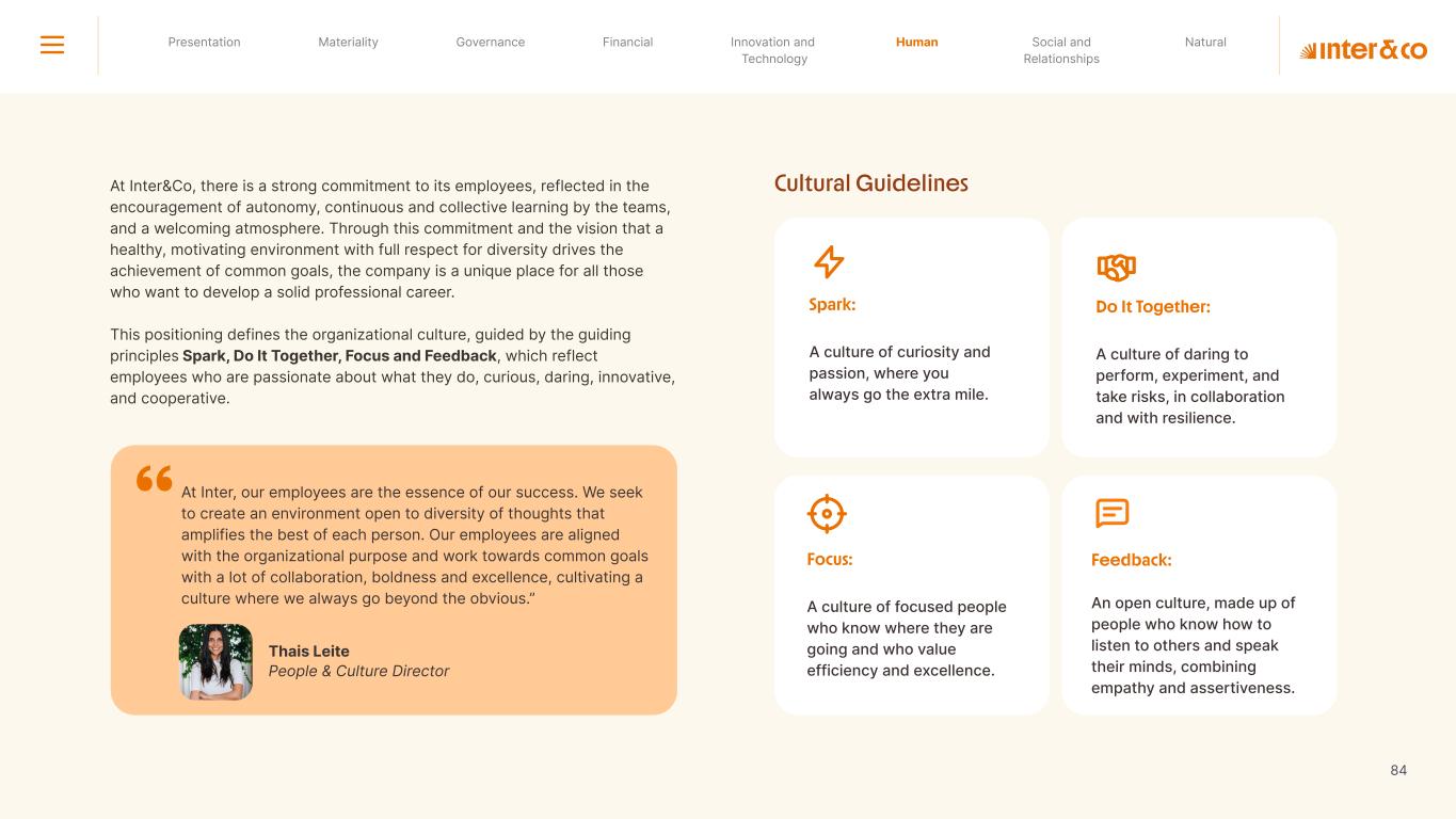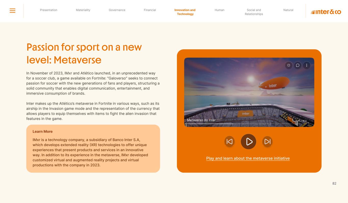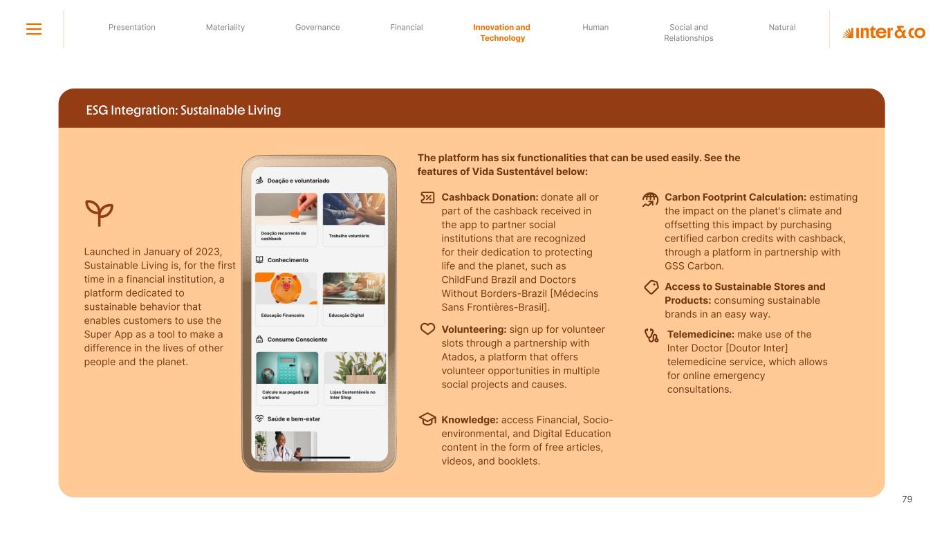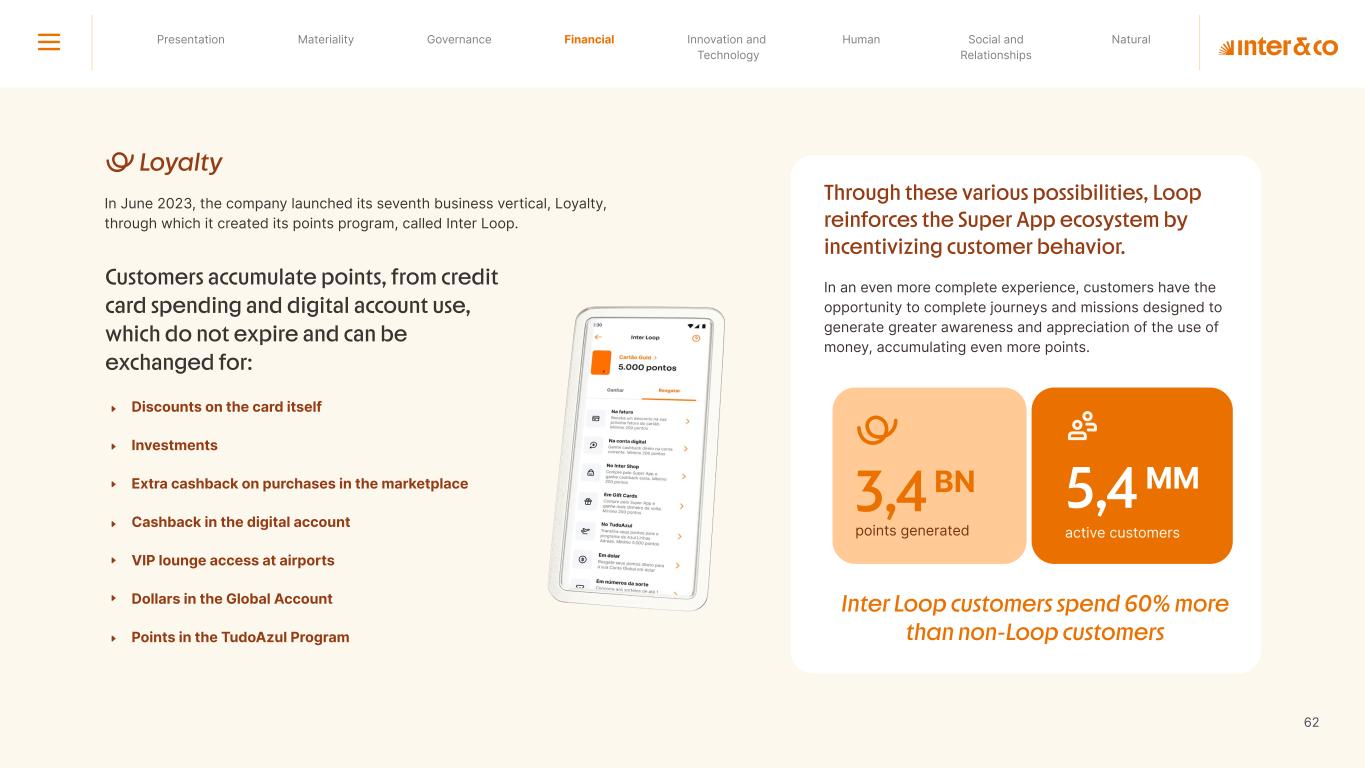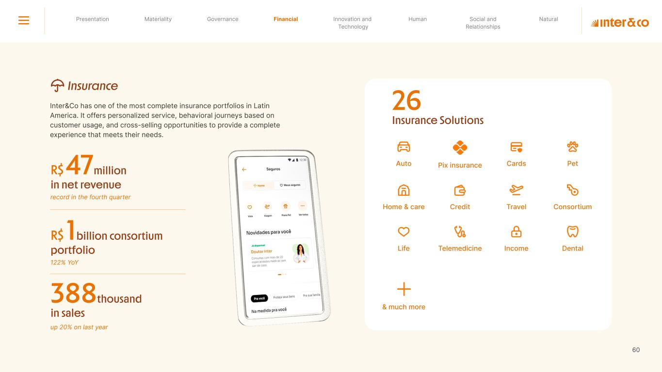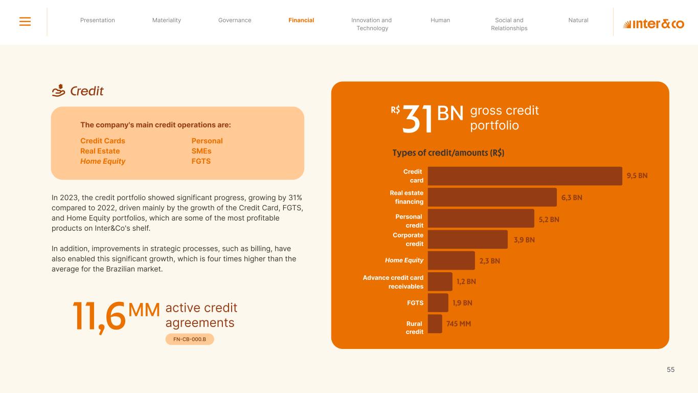 Insurance Health Through the Financial Super App, Inter&Co's activities transcend banking barriers and reach the generation of positive impact on several fronts and for multiple audiences, for society, and the environment. Digital account Corporate account Pix Kids Account Credit card Banking Pay order on credit Digital credit card Pix on credit Real Estate Credit Advance of FGTS Payroll Loan Credit More limit savings Vehicle financing Consortiums Credit Investment platform Meu Porquinho (“My Piggybank”) Investe Fácil (“Invest Easy”) Savings Private pension Investments Exchange points for miles Exchange points for dollars Exchange points for a discount on your bill Exchange points for extra cashback Exchange points for cashback directly on your bill Exchange points for investments in Meu Porquinho (“My Piggybank”) Loop Life insurance Pix Insurance More protected card Travel insurance Home insurance Dental plan Pet health plan Telemedicine Shopping Travel Duo Gourmet Recharge Shell Box Cell Phone Plans Gift Card Sustainable Living Shopping & experiences Inter&Co's Annual Report presents the company's results in generating shared value for its various stakeholder groups, contributing to advancement of the ESG agenda by strengthening the integration of governance, people, and environmental issues at the company and its purpose of unlocking possibilities for an intelligent financial life. Looking beyond the horizon, we are excited about the prospects for 2024. We are focused on delivering the second year of our "60-30-30 Plan". Our ongoing quest to drive innovation and technology, which was even the most popular material topic in our stakeholder survey in 2023, will unlock even more possibilities for a smarter financial life for our customers. ESG at Inter&Co Strategic vision driven by technology and innovation Inter&Co offers the Financial Super App: a powerful platform with integrated products and services, designed to meet the needs of the various moments in its customers' lives. Through an unique and transformative ecosystem, Inter&Co unlocks possibilities for a smart financial life. The Super App for your financial life João Vitor Menin Inter&Co CEO Banking products Non-banking products 01 2023 Annual Report | Pocket Version Download the full report