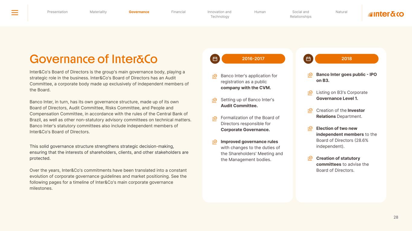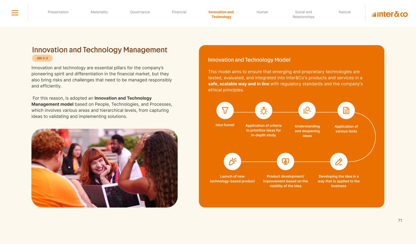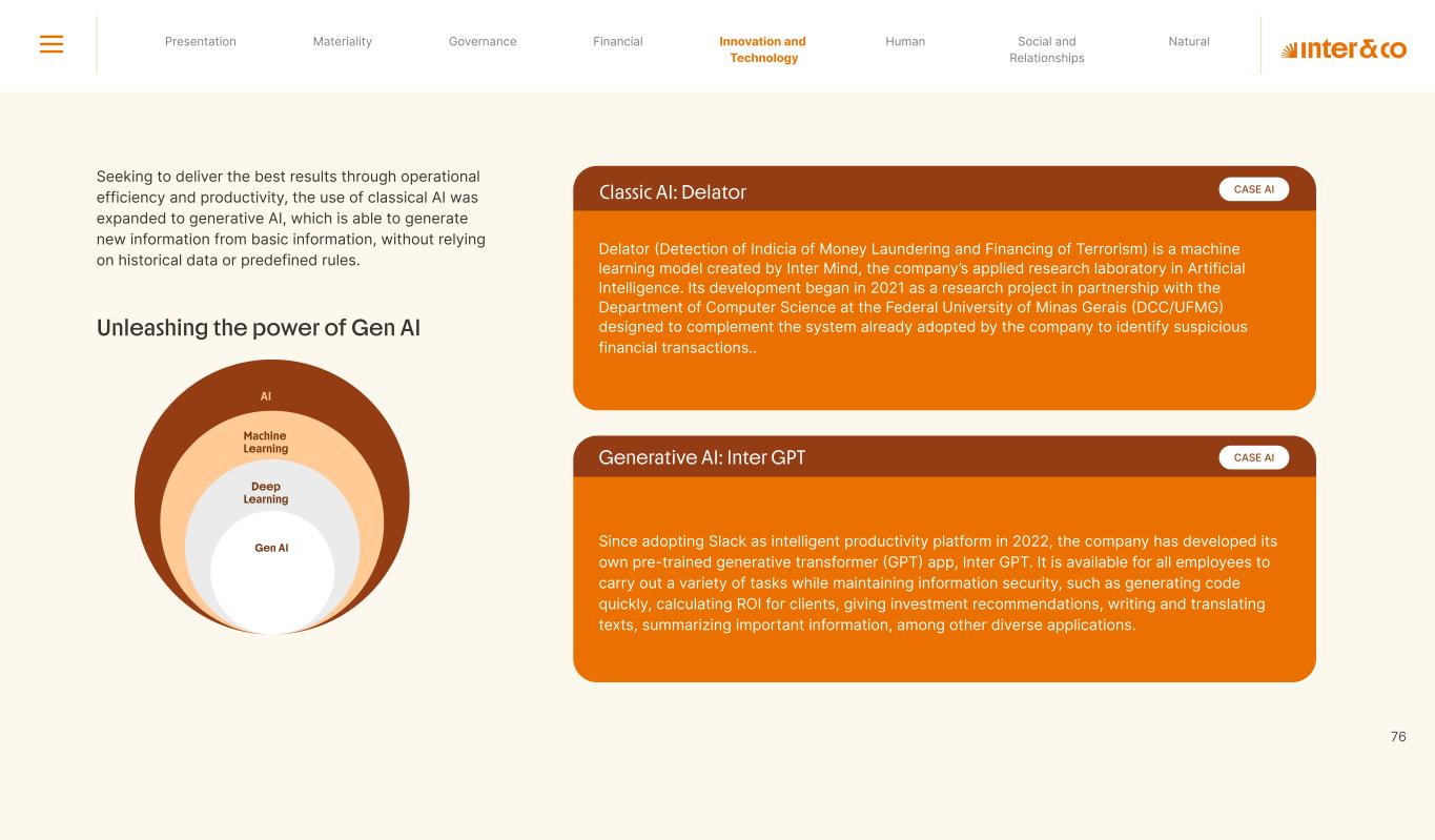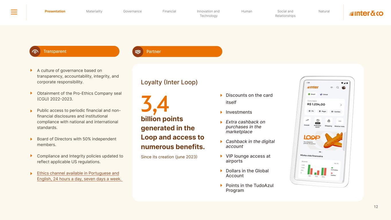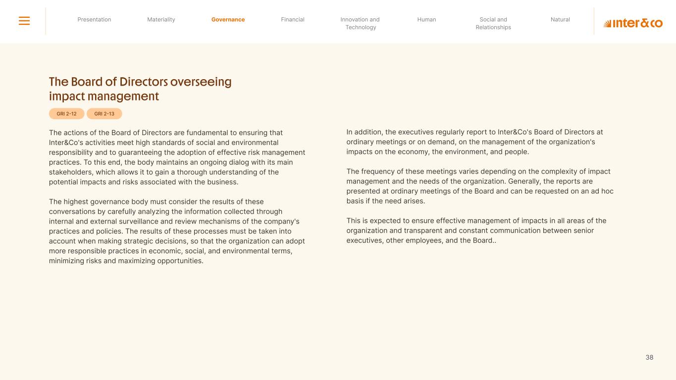 Insurance Health Through the Financial Super App, Inter&Co's activities transcend banking barriers and reach the generation of positive impact on several fronts and for multiple audiences, for society, and the environment. Digital account Corporate account Pix Kids Account Credit card Banking Pay order on credit Digital credit card Pix on credit Real Estate Credit Advance of FGTS Payroll Loan Credit More limit savings Vehicle financing Consortiums Credit Investment platform Meu Porquinho (“My Piggybank”) Investe Fácil (“Invest Easy”) Savings Private pension Investments Exchange points for miles Exchange points for dollars Exchange points for a discount on your bill Exchange points for extra cashback Exchange points for cashback directly on your bill Exchange points for investments in Meu Porquinho (“My Piggybank”) Loop Life insurance Pix Insurance More protected card Travel insurance Home insurance Dental plan Pet health plan Telemedicine Shopping Travel Duo Gourmet Recharge Shell Box Cell Phone Plans Gift Card Sustainable Living Shopping & experiences Inter&Co's Annual Report presents the company's results in generating shared value for its various stakeholder groups, contributing to advancement of the ESG agenda by strengthening the integration of governance, people, and environmental issues at the company and its purpose of unlocking possibilities for an intelligent financial life. Looking beyond the horizon, we are excited about the prospects for 2024. We are focused on delivering the second year of our "60-30-30 Plan". Our ongoing quest to drive innovation and technology, which was even the most popular material topic in our stakeholder survey in 2023, will unlock even more possibilities for a smarter financial life for our customers. ESG at Inter&Co Strategic vision driven by technology and innovation Inter&Co offers the Financial Super App: a powerful platform with integrated products and services, designed to meet the needs of the various moments in its customers' lives. Through an unique and transformative ecosystem, Inter&Co unlocks possibilities for a smart financial life. The Super App for your financial life João Vitor Menin Inter&Co CEO Banking products Non-banking products 01 2023 Annual Report | Pocket Version Download the full report