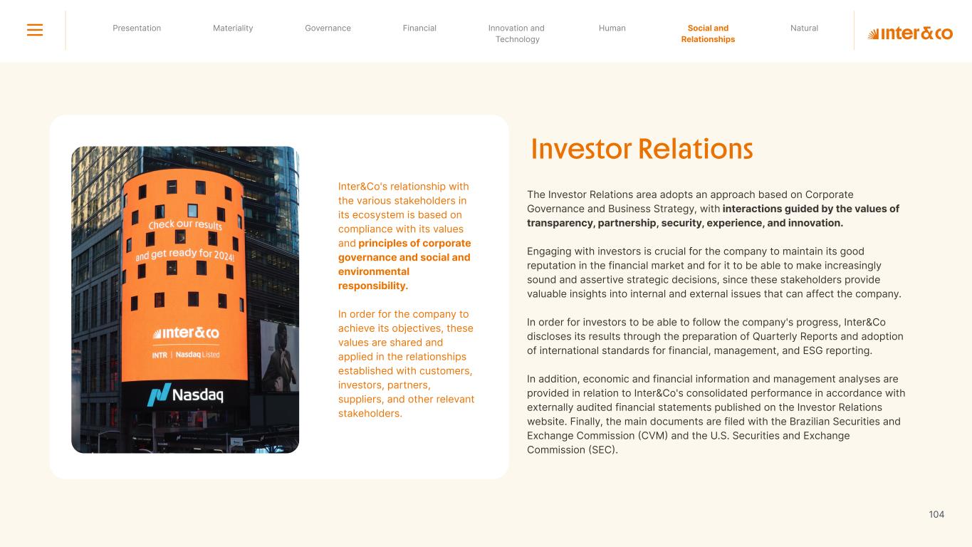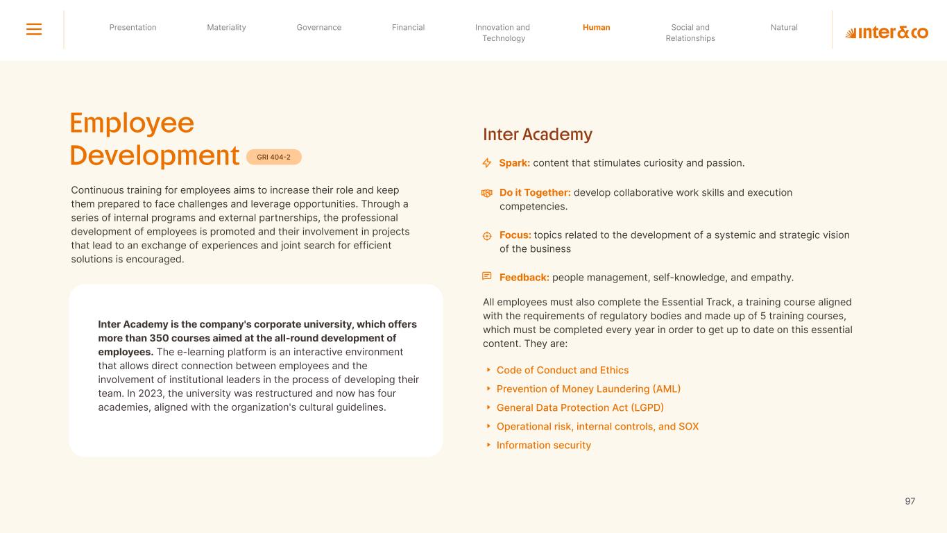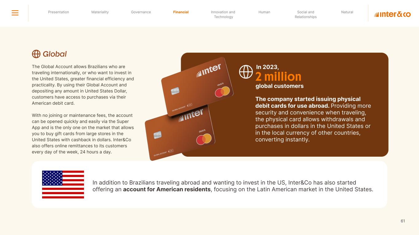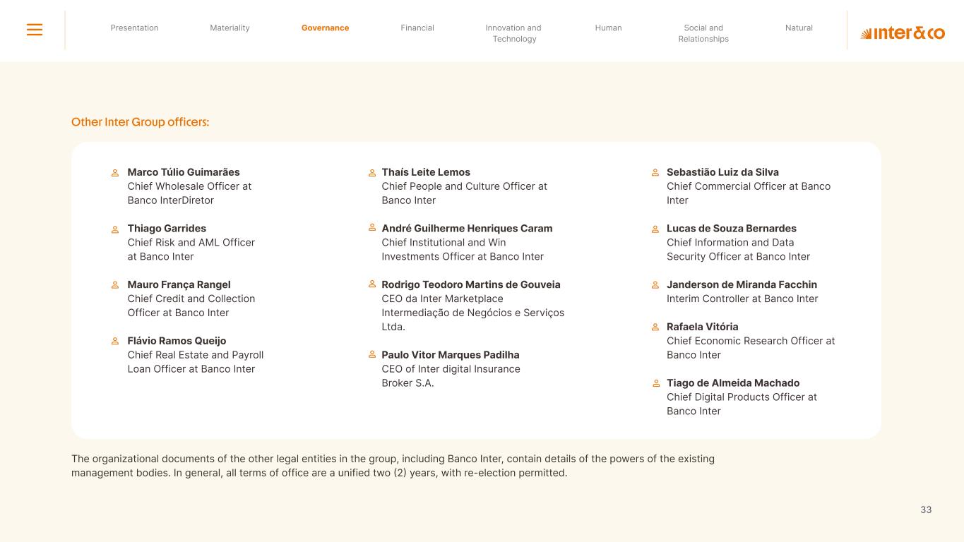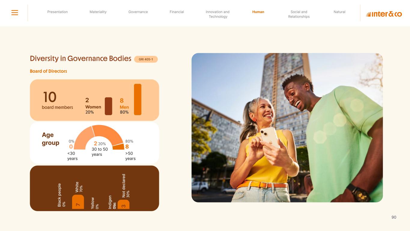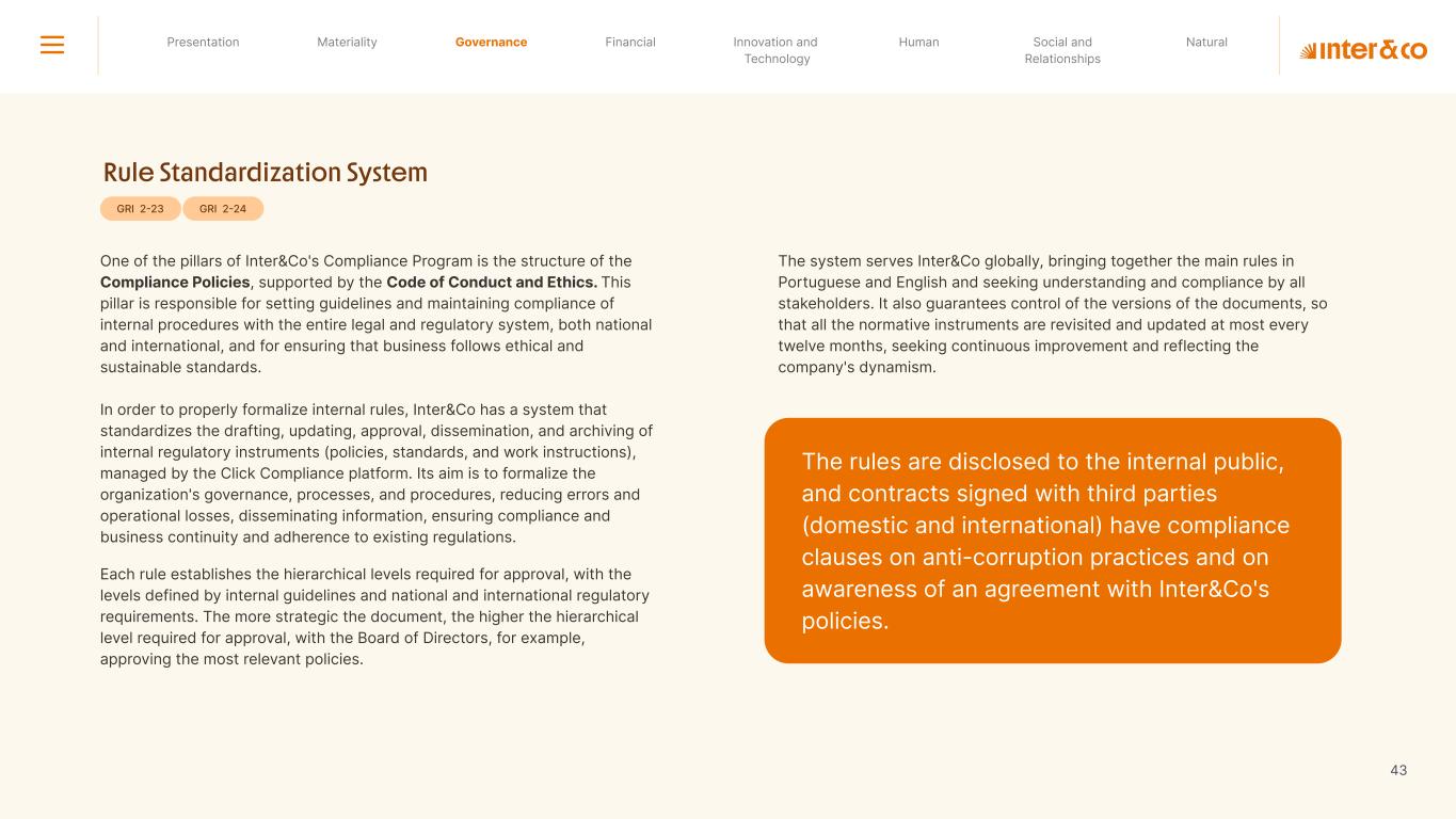 Insurance Health Through the Financial Super App, Inter&Co's activities transcend banking barriers and reach the generation of positive impact on several fronts and for multiple audiences, for society, and the environment. Digital account Corporate account Pix Kids Account Credit card Banking Pay order on credit Digital credit card Pix on credit Real Estate Credit Advance of FGTS Payroll Loan Credit More limit savings Vehicle financing Consortiums Credit Investment platform Meu Porquinho (“My Piggybank”) Investe Fácil (“Invest Easy”) Savings Private pension Investments Exchange points for miles Exchange points for dollars Exchange points for a discount on your bill Exchange points for extra cashback Exchange points for cashback directly on your bill Exchange points for investments in Meu Porquinho (“My Piggybank”) Loop Life insurance Pix Insurance More protected card Travel insurance Home insurance Dental plan Pet health plan Telemedicine Shopping Travel Duo Gourmet Recharge Shell Box Cell Phone Plans Gift Card Sustainable Living Shopping & experiences Inter&Co's Annual Report presents the company's results in generating shared value for its various stakeholder groups, contributing to advancement of the ESG agenda by strengthening the integration of governance, people, and environmental issues at the company and its purpose of unlocking possibilities for an intelligent financial life. Looking beyond the horizon, we are excited about the prospects for 2024. We are focused on delivering the second year of our "60-30-30 Plan". Our ongoing quest to drive innovation and technology, which was even the most popular material topic in our stakeholder survey in 2023, will unlock even more possibilities for a smarter financial life for our customers. ESG at Inter&Co Strategic vision driven by technology and innovation Inter&Co offers the Financial Super App: a powerful platform with integrated products and services, designed to meet the needs of the various moments in its customers' lives. Through an unique and transformative ecosystem, Inter&Co unlocks possibilities for a smart financial life. The Super App for your financial life João Vitor Menin Inter&Co CEO Banking products Non-banking products 01 2023 Annual Report | Pocket Version Download the full report
