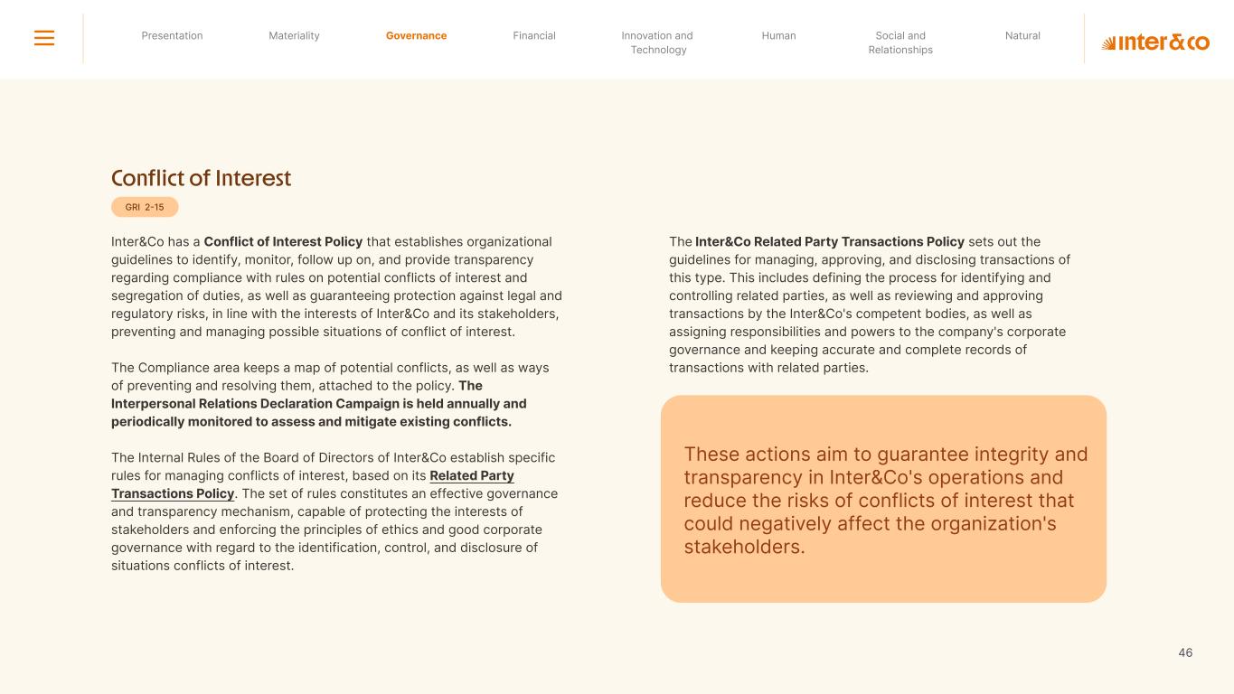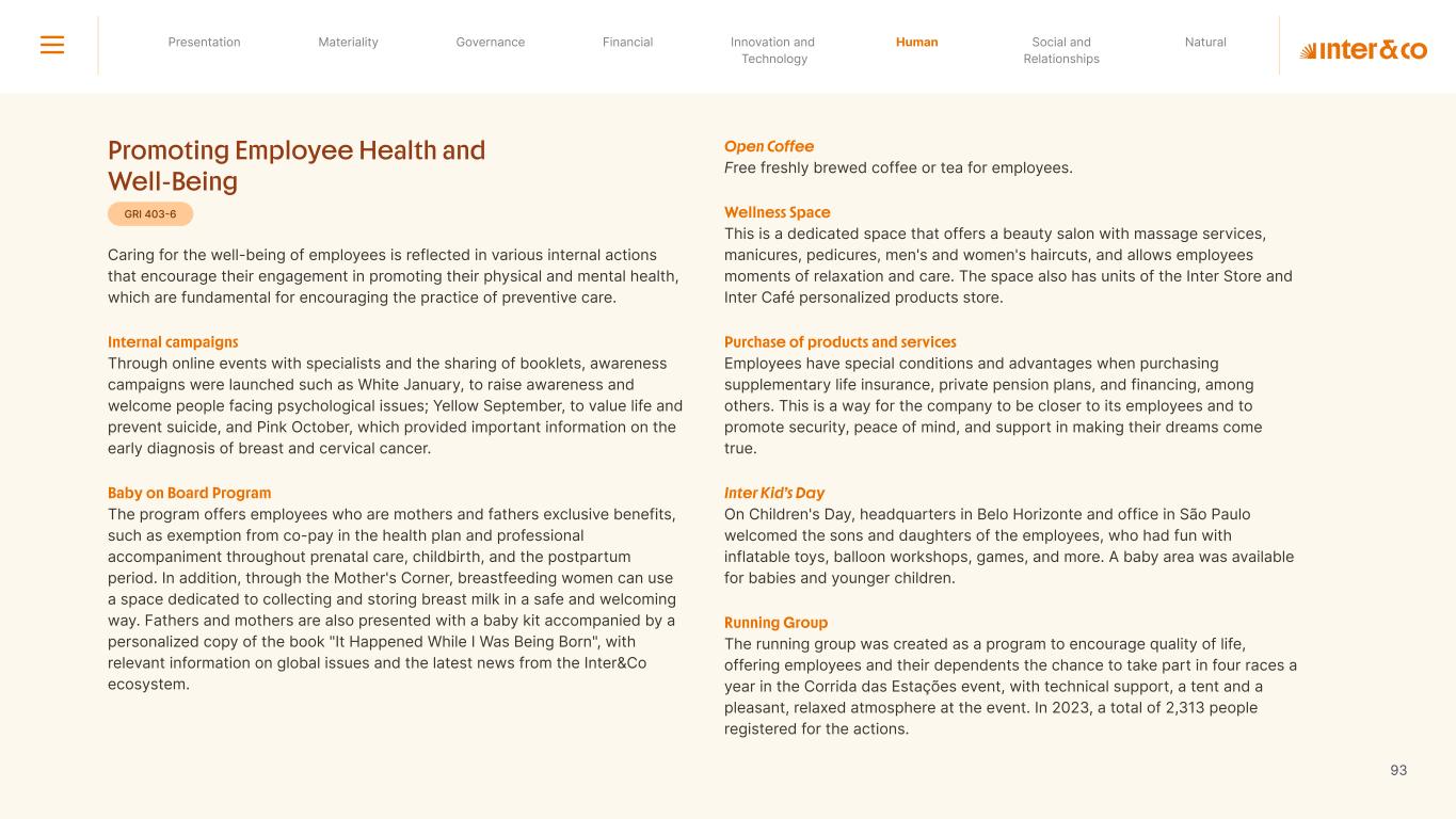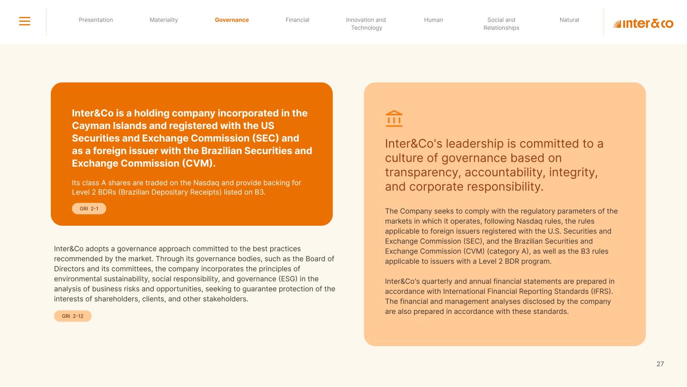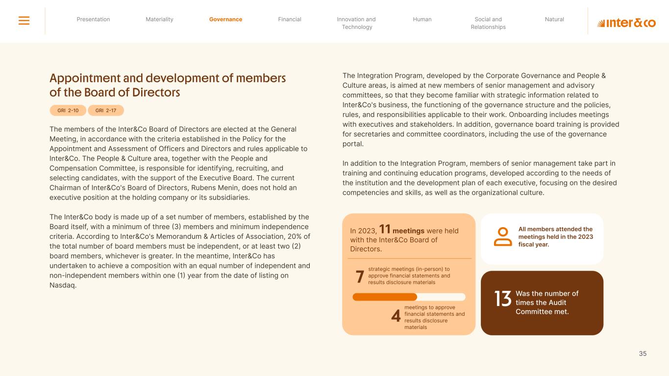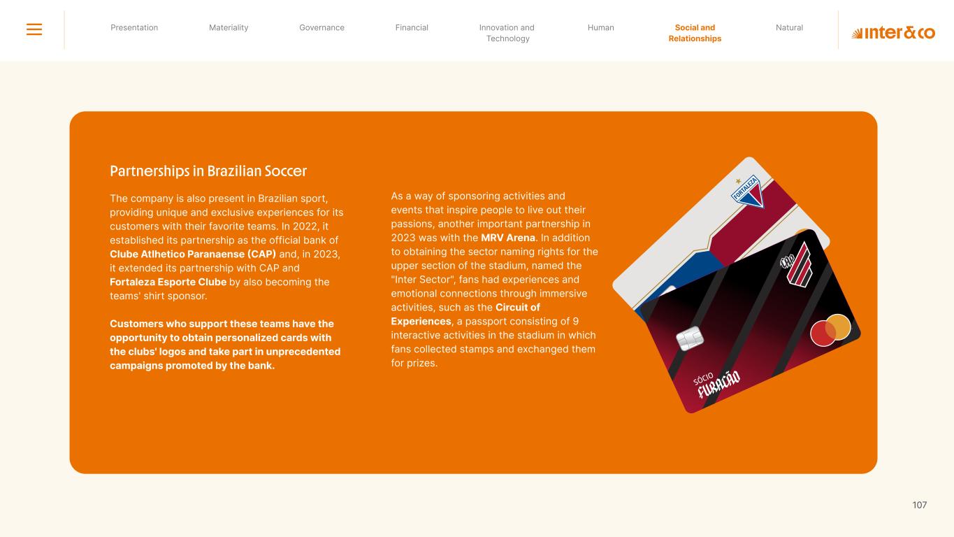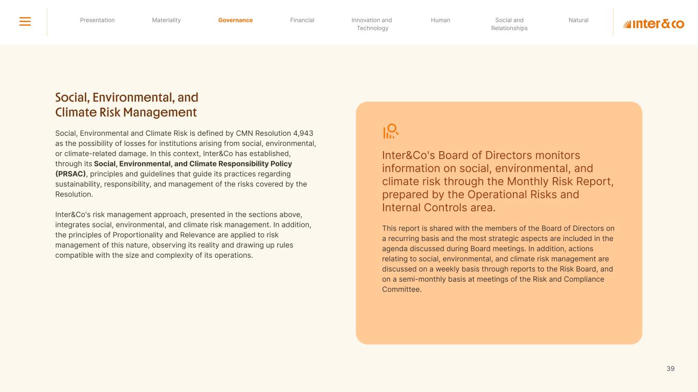 Insurance Health Through the Financial Super App, Inter&Co's activities transcend banking barriers and reach the generation of positive impact on several fronts and for multiple audiences, for society, and the environment. Digital account Corporate account Pix Kids Account Credit card Banking Pay order on credit Digital credit card Pix on credit Real Estate Credit Advance of FGTS Payroll Loan Credit More limit savings Vehicle financing Consortiums Credit Investment platform Meu Porquinho (“My Piggybank”) Investe Fácil (“Invest Easy”) Savings Private pension Investments Exchange points for miles Exchange points for dollars Exchange points for a discount on your bill Exchange points for extra cashback Exchange points for cashback directly on your bill Exchange points for investments in Meu Porquinho (“My Piggybank”) Loop Life insurance Pix Insurance More protected card Travel insurance Home insurance Dental plan Pet health plan Telemedicine Shopping Travel Duo Gourmet Recharge Shell Box Cell Phone Plans Gift Card Sustainable Living Shopping & experiences Inter&Co's Annual Report presents the company's results in generating shared value for its various stakeholder groups, contributing to advancement of the ESG agenda by strengthening the integration of governance, people, and environmental issues at the company and its purpose of unlocking possibilities for an intelligent financial life. Looking beyond the horizon, we are excited about the prospects for 2024. We are focused on delivering the second year of our "60-30-30 Plan". Our ongoing quest to drive innovation and technology, which was even the most popular material topic in our stakeholder survey in 2023, will unlock even more possibilities for a smarter financial life for our customers. ESG at Inter&Co Strategic vision driven by technology and innovation Inter&Co offers the Financial Super App: a powerful platform with integrated products and services, designed to meet the needs of the various moments in its customers' lives. Through an unique and transformative ecosystem, Inter&Co unlocks possibilities for a smart financial life. The Super App for your financial life João Vitor Menin Inter&Co CEO Banking products Non-banking products 01 2023 Annual Report | Pocket Version Download the full report