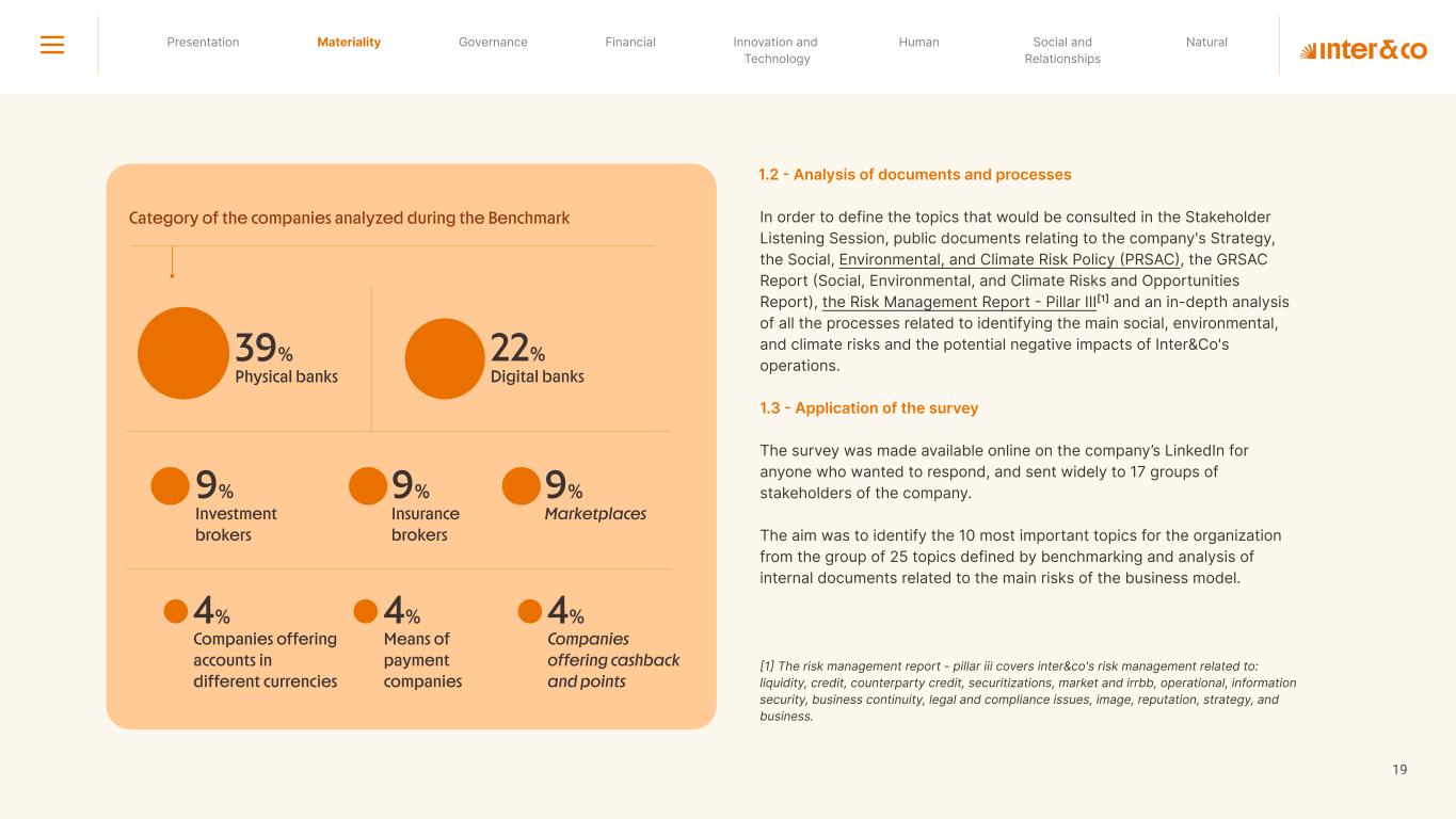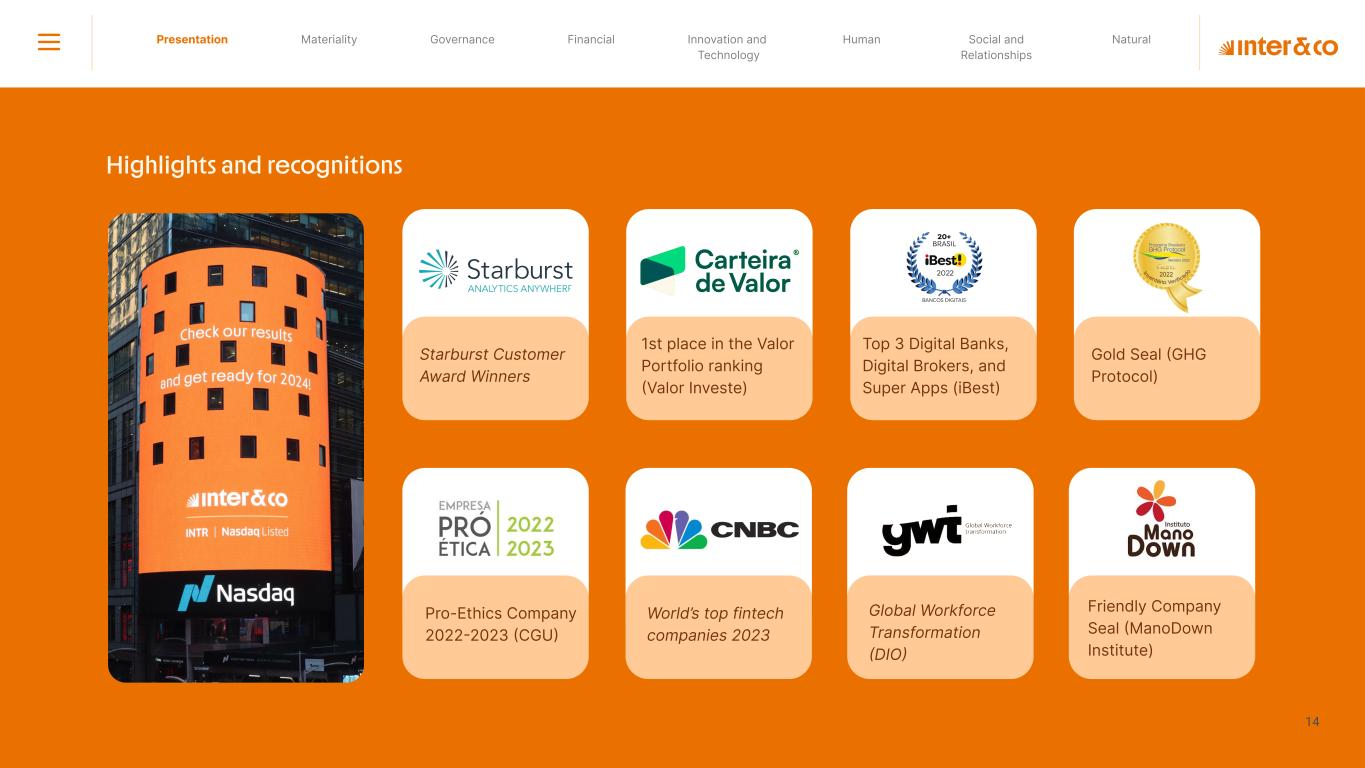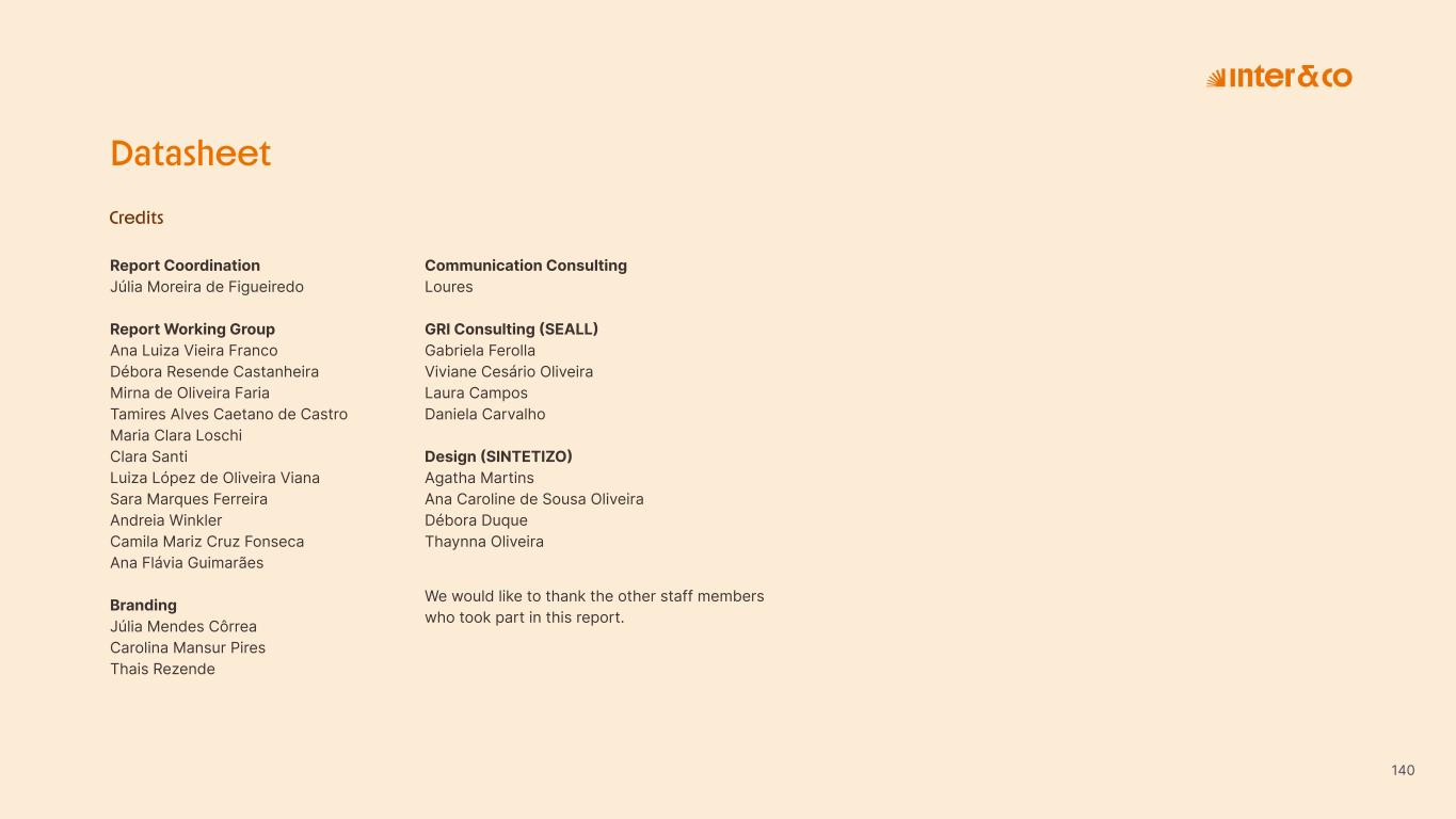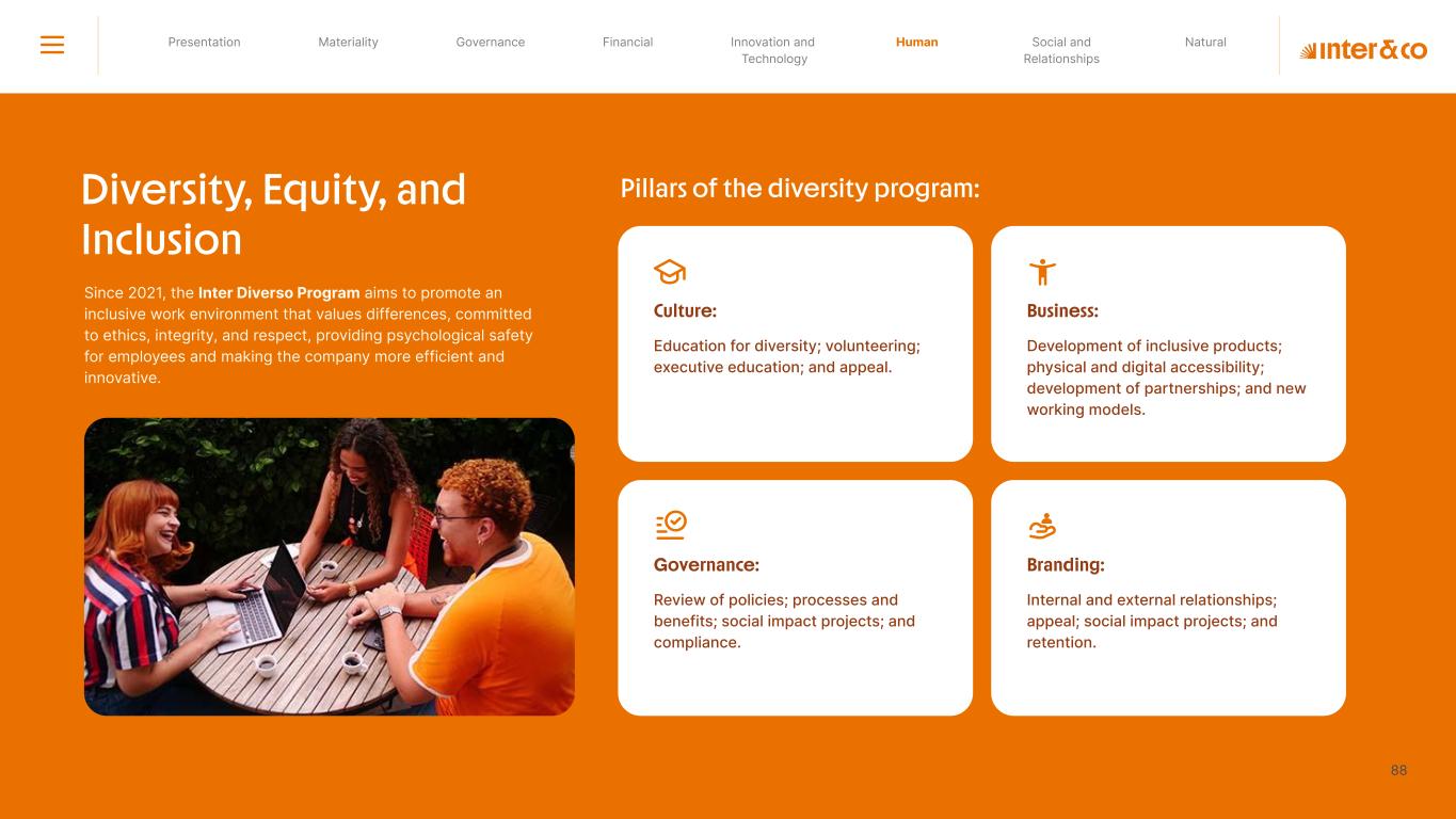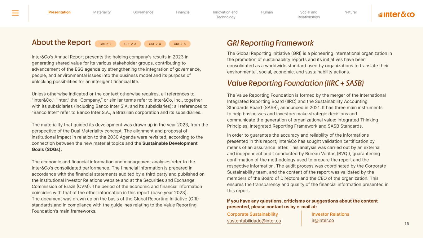 Insurance Health Through the Financial Super App, Inter&Co's activities transcend banking barriers and reach the generation of positive impact on several fronts and for multiple audiences, for society, and the environment. Digital account Corporate account Pix Kids Account Credit card Banking Pay order on credit Digital credit card Pix on credit Real Estate Credit Advance of FGTS Payroll Loan Credit More limit savings Vehicle financing Consortiums Credit Investment platform Meu Porquinho (“My Piggybank”) Investe Fácil (“Invest Easy”) Savings Private pension Investments Exchange points for miles Exchange points for dollars Exchange points for a discount on your bill Exchange points for extra cashback Exchange points for cashback directly on your bill Exchange points for investments in Meu Porquinho (“My Piggybank”) Loop Life insurance Pix Insurance More protected card Travel insurance Home insurance Dental plan Pet health plan Telemedicine Shopping Travel Duo Gourmet Recharge Shell Box Cell Phone Plans Gift Card Sustainable Living Shopping & experiences Inter&Co's Annual Report presents the company's results in generating shared value for its various stakeholder groups, contributing to advancement of the ESG agenda by strengthening the integration of governance, people, and environmental issues at the company and its purpose of unlocking possibilities for an intelligent financial life. Looking beyond the horizon, we are excited about the prospects for 2024. We are focused on delivering the second year of our "60-30-30 Plan". Our ongoing quest to drive innovation and technology, which was even the most popular material topic in our stakeholder survey in 2023, will unlock even more possibilities for a smarter financial life for our customers. ESG at Inter&Co Strategic vision driven by technology and innovation Inter&Co offers the Financial Super App: a powerful platform with integrated products and services, designed to meet the needs of the various moments in its customers' lives. Through an unique and transformative ecosystem, Inter&Co unlocks possibilities for a smart financial life. The Super App for your financial life João Vitor Menin Inter&Co CEO Banking products Non-banking products 01 2023 Annual Report | Pocket Version Download the full report