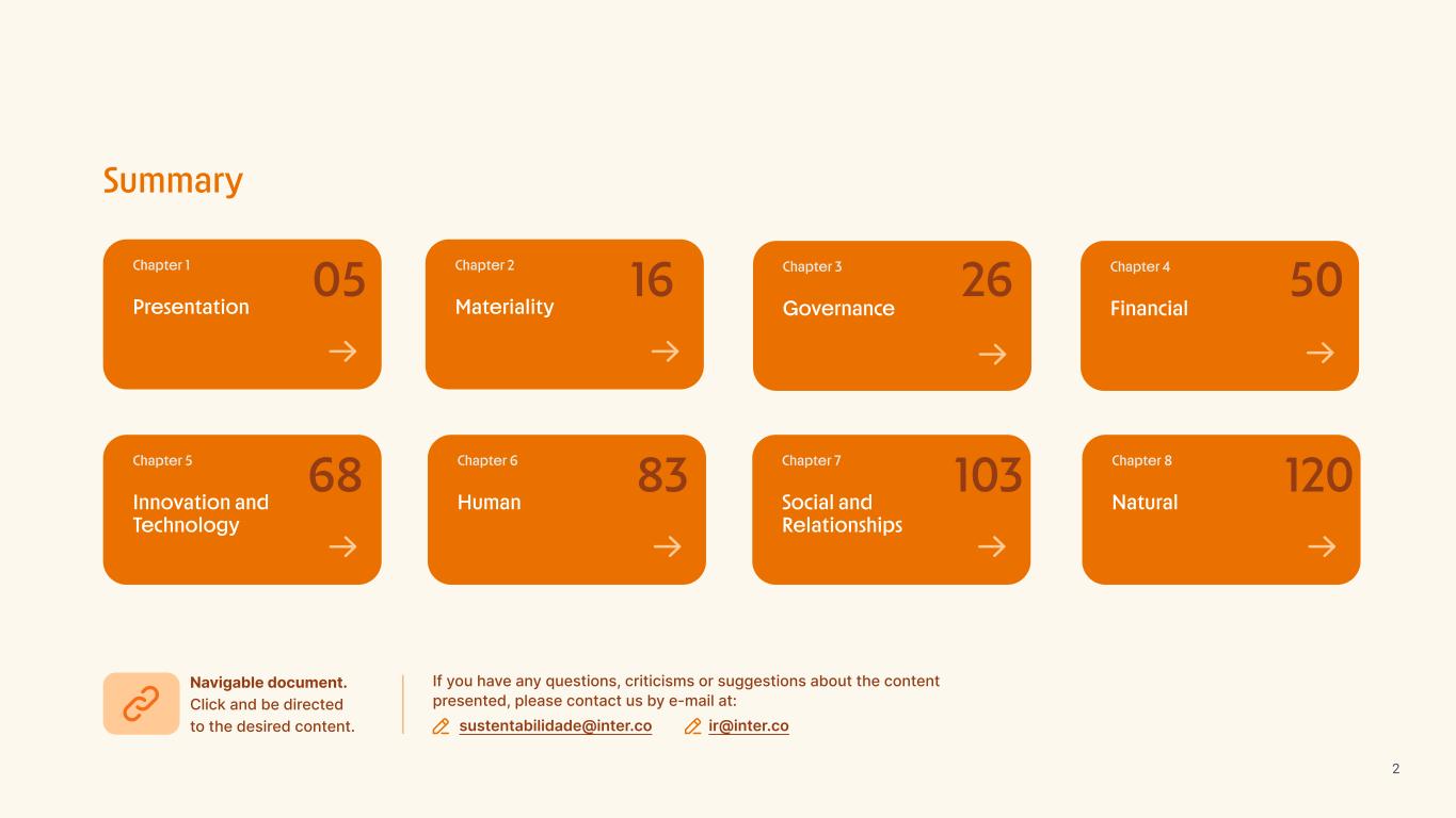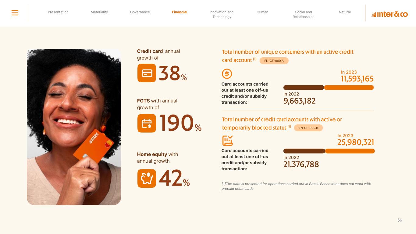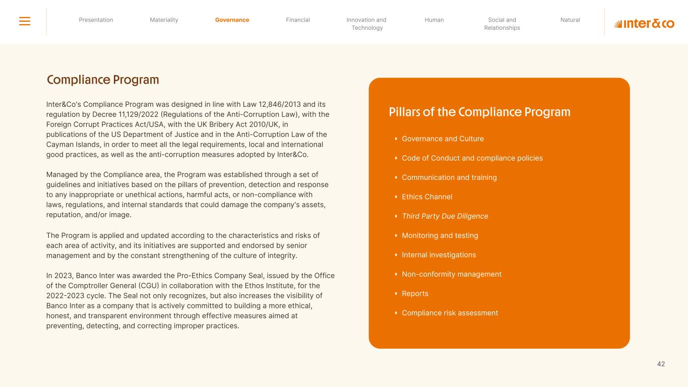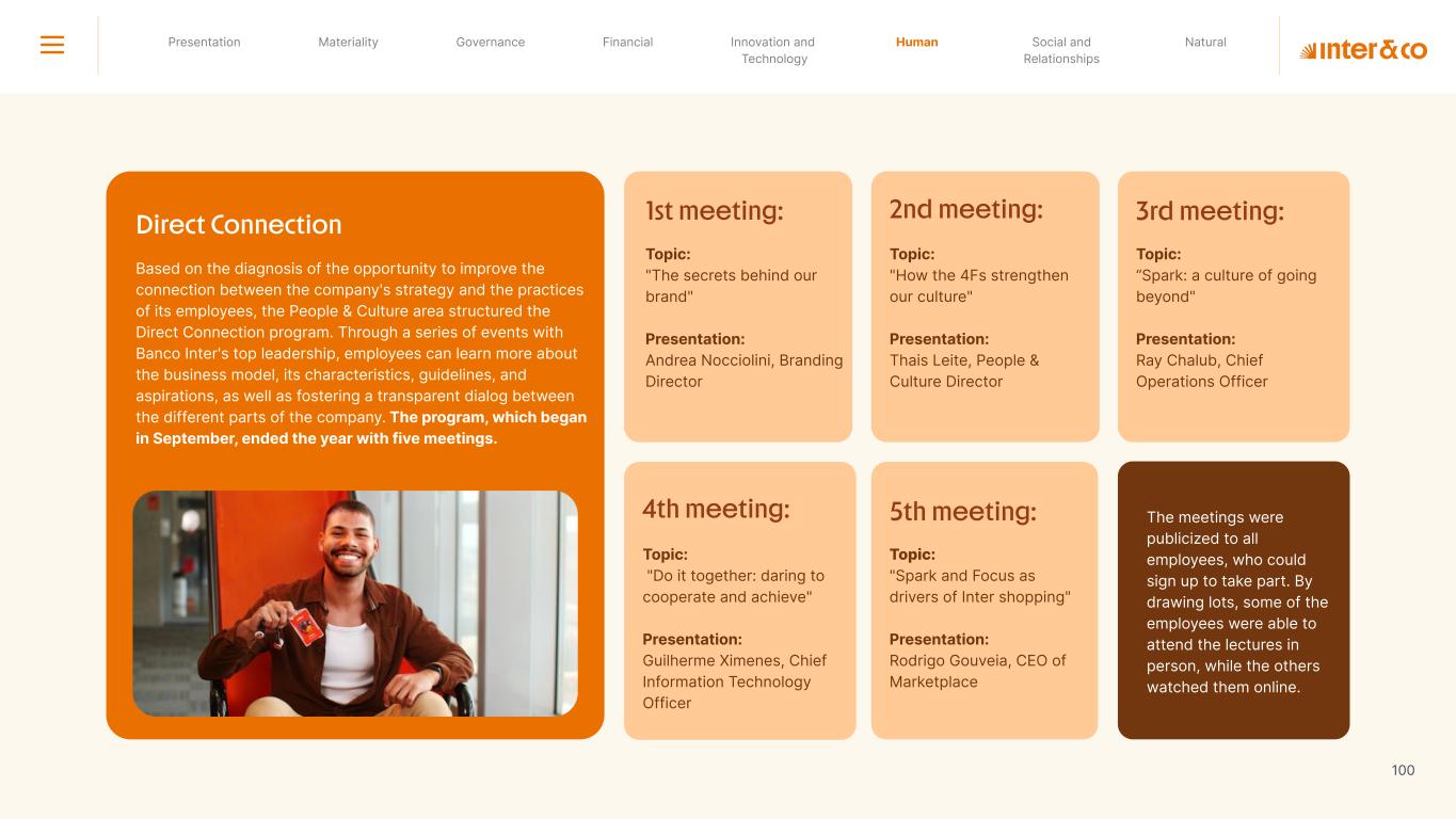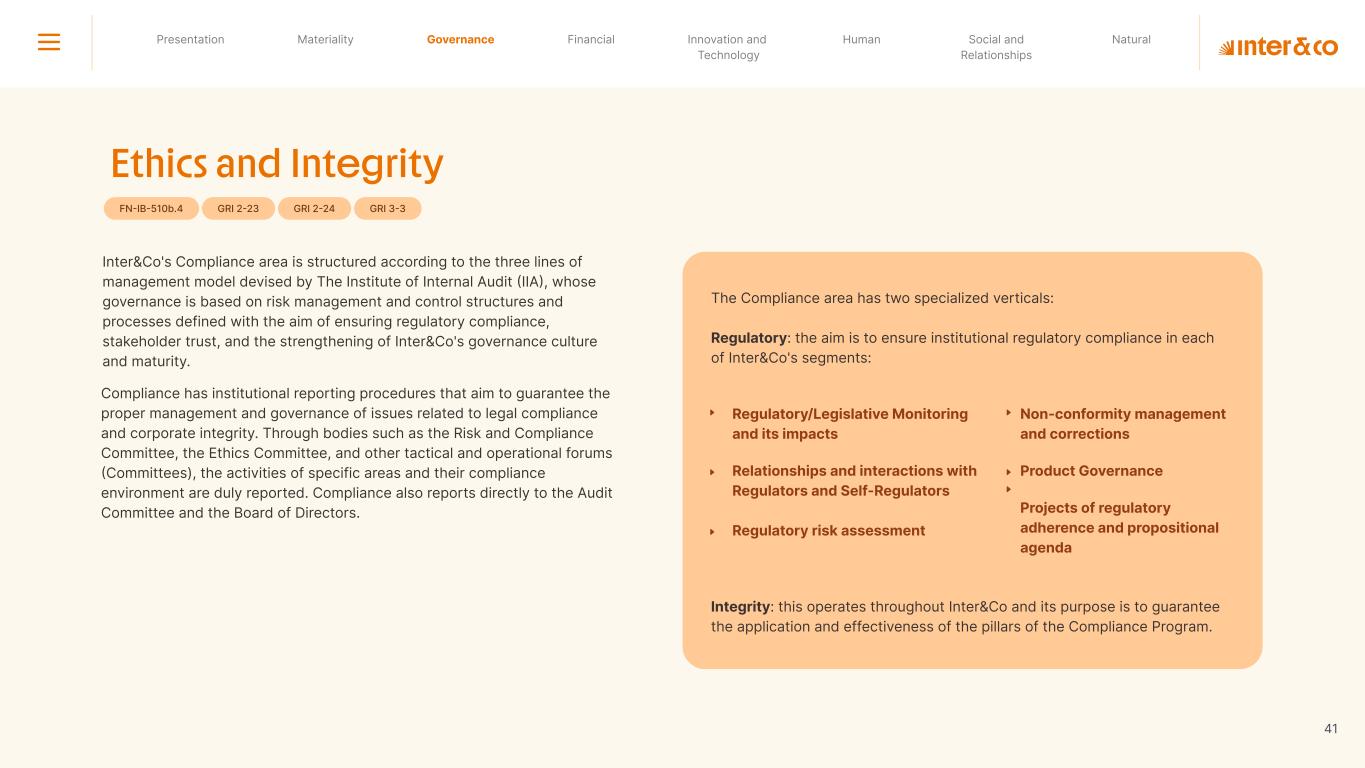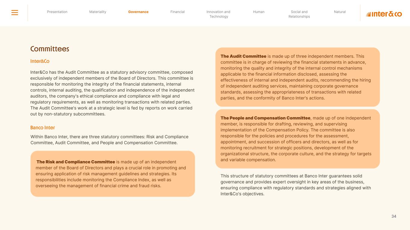 Insurance Health Through the Financial Super App, Inter&Co's activities transcend banking barriers and reach the generation of positive impact on several fronts and for multiple audiences, for society, and the environment. Digital account Corporate account Pix Kids Account Credit card Banking Pay order on credit Digital credit card Pix on credit Real Estate Credit Advance of FGTS Payroll Loan Credit More limit savings Vehicle financing Consortiums Credit Investment platform Meu Porquinho (“My Piggybank”) Investe Fácil (“Invest Easy”) Savings Private pension Investments Exchange points for miles Exchange points for dollars Exchange points for a discount on your bill Exchange points for extra cashback Exchange points for cashback directly on your bill Exchange points for investments in Meu Porquinho (“My Piggybank”) Loop Life insurance Pix Insurance More protected card Travel insurance Home insurance Dental plan Pet health plan Telemedicine Shopping Travel Duo Gourmet Recharge Shell Box Cell Phone Plans Gift Card Sustainable Living Shopping & experiences Inter&Co's Annual Report presents the company's results in generating shared value for its various stakeholder groups, contributing to advancement of the ESG agenda by strengthening the integration of governance, people, and environmental issues at the company and its purpose of unlocking possibilities for an intelligent financial life. Looking beyond the horizon, we are excited about the prospects for 2024. We are focused on delivering the second year of our "60-30-30 Plan". Our ongoing quest to drive innovation and technology, which was even the most popular material topic in our stakeholder survey in 2023, will unlock even more possibilities for a smarter financial life for our customers. ESG at Inter&Co Strategic vision driven by technology and innovation Inter&Co offers the Financial Super App: a powerful platform with integrated products and services, designed to meet the needs of the various moments in its customers' lives. Through an unique and transformative ecosystem, Inter&Co unlocks possibilities for a smart financial life. The Super App for your financial life João Vitor Menin Inter&Co CEO Banking products Non-banking products 01 2023 Annual Report | Pocket Version Download the full report