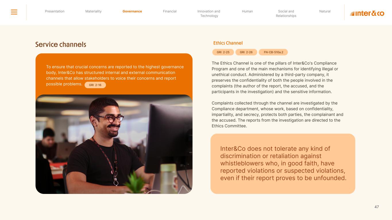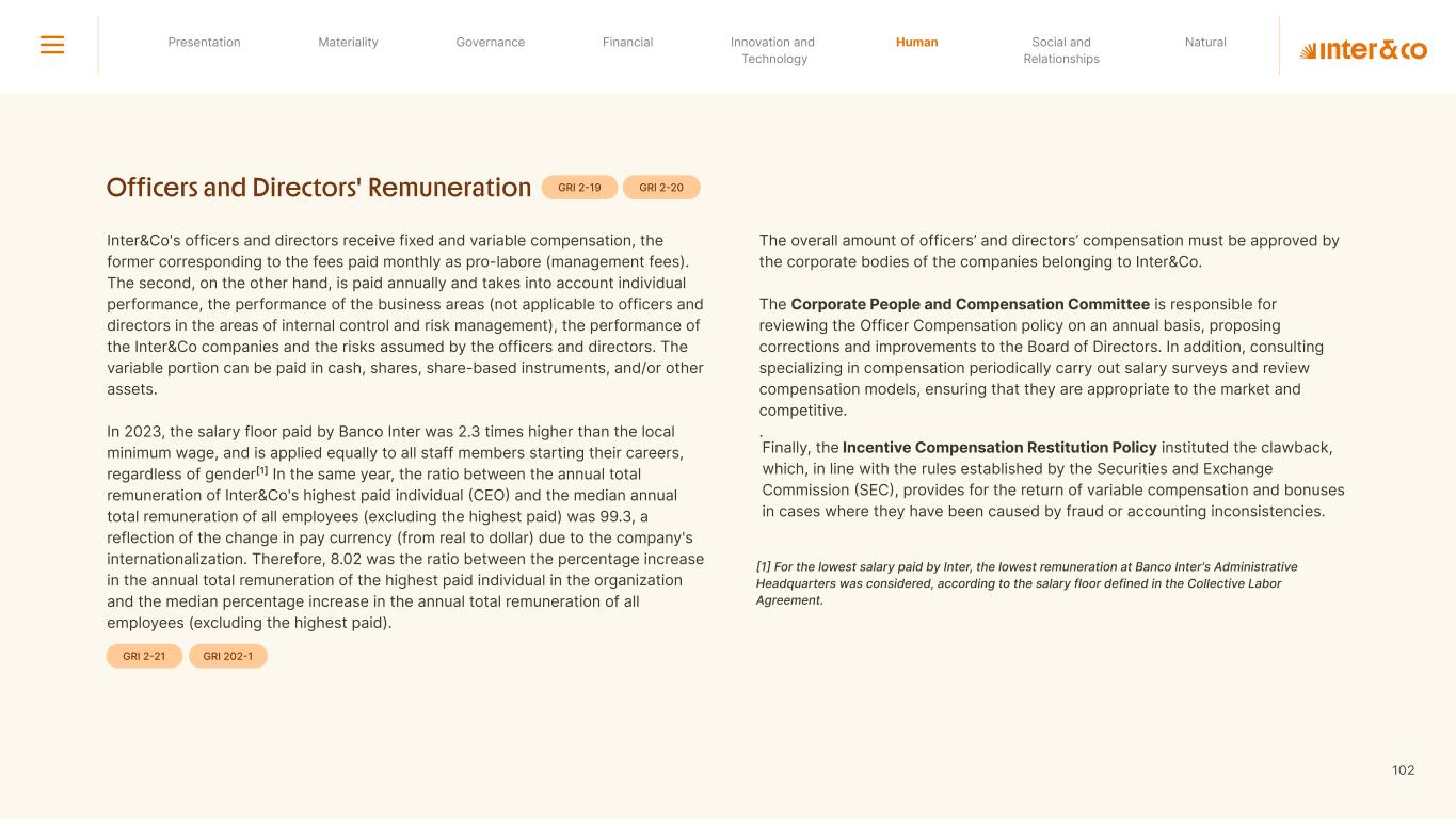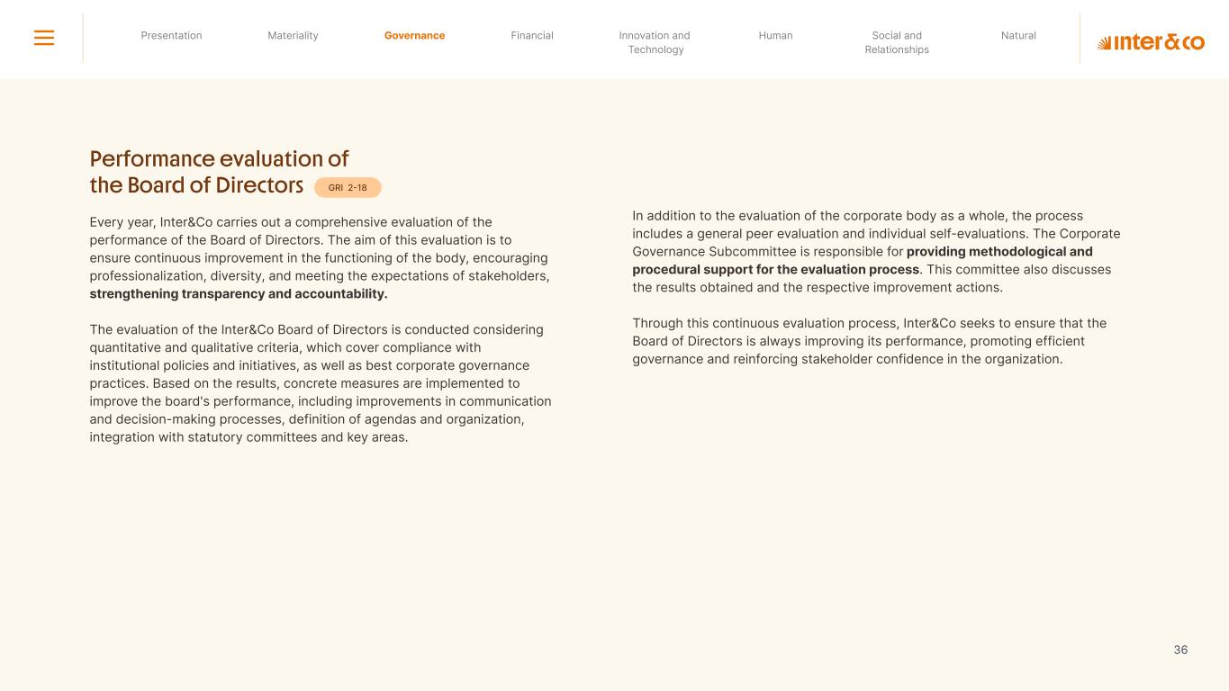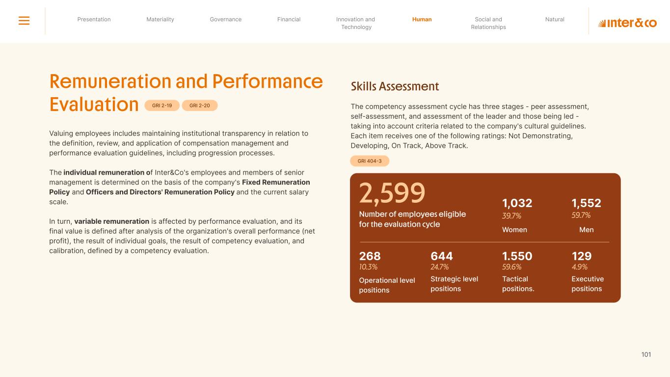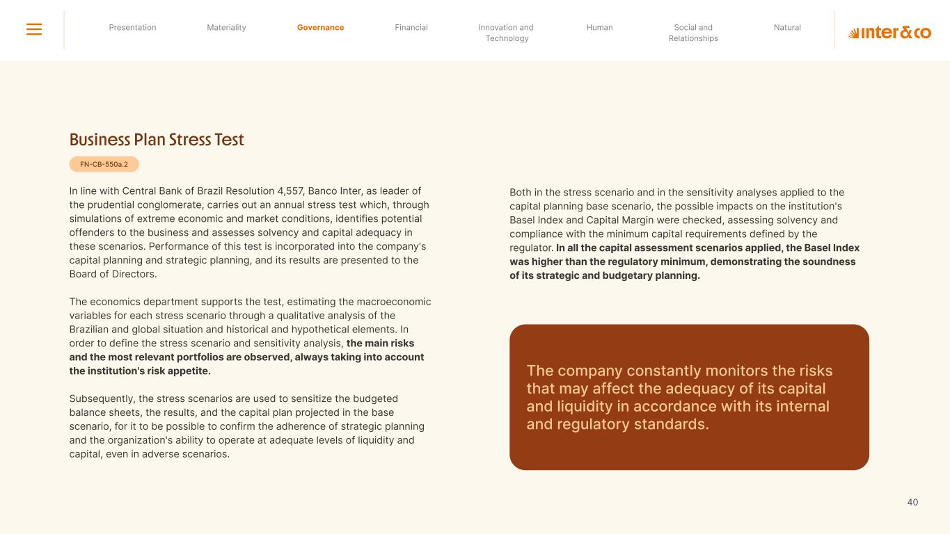 Insurance Health Through the Financial Super App, Inter&Co's activities transcend banking barriers and reach the generation of positive impact on several fronts and for multiple audiences, for society, and the environment. Digital account Corporate account Pix Kids Account Credit card Banking Pay order on credit Digital credit card Pix on credit Real Estate Credit Advance of FGTS Payroll Loan Credit More limit savings Vehicle financing Consortiums Credit Investment platform Meu Porquinho (“My Piggybank”) Investe Fácil (“Invest Easy”) Savings Private pension Investments Exchange points for miles Exchange points for dollars Exchange points for a discount on your bill Exchange points for extra cashback Exchange points for cashback directly on your bill Exchange points for investments in Meu Porquinho (“My Piggybank”) Loop Life insurance Pix Insurance More protected card Travel insurance Home insurance Dental plan Pet health plan Telemedicine Shopping Travel Duo Gourmet Recharge Shell Box Cell Phone Plans Gift Card Sustainable Living Shopping & experiences Inter&Co's Annual Report presents the company's results in generating shared value for its various stakeholder groups, contributing to advancement of the ESG agenda by strengthening the integration of governance, people, and environmental issues at the company and its purpose of unlocking possibilities for an intelligent financial life. Looking beyond the horizon, we are excited about the prospects for 2024. We are focused on delivering the second year of our "60-30-30 Plan". Our ongoing quest to drive innovation and technology, which was even the most popular material topic in our stakeholder survey in 2023, will unlock even more possibilities for a smarter financial life for our customers. ESG at Inter&Co Strategic vision driven by technology and innovation Inter&Co offers the Financial Super App: a powerful platform with integrated products and services, designed to meet the needs of the various moments in its customers' lives. Through an unique and transformative ecosystem, Inter&Co unlocks possibilities for a smart financial life. The Super App for your financial life João Vitor Menin Inter&Co CEO Banking products Non-banking products 01 2023 Annual Report | Pocket Version Download the full report