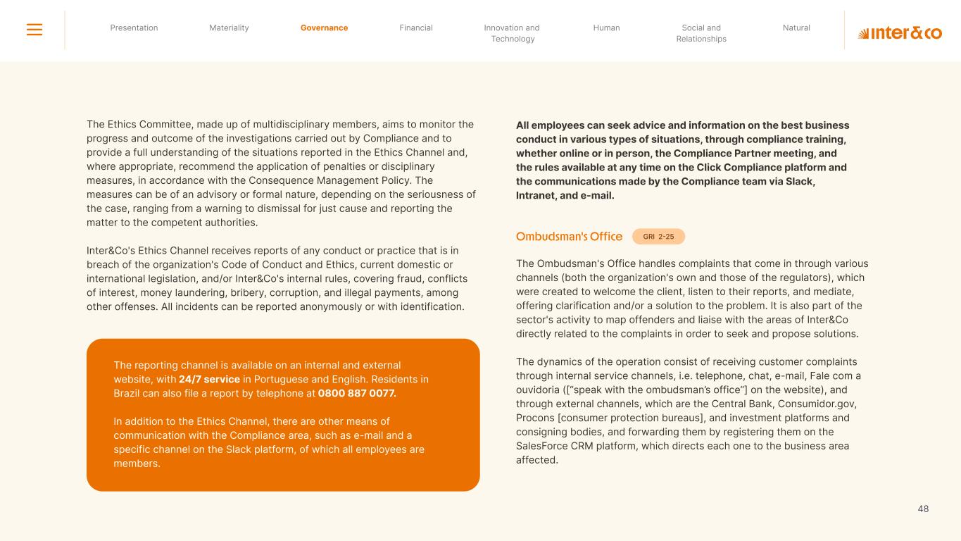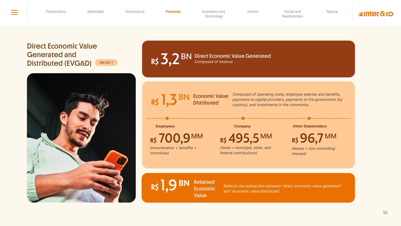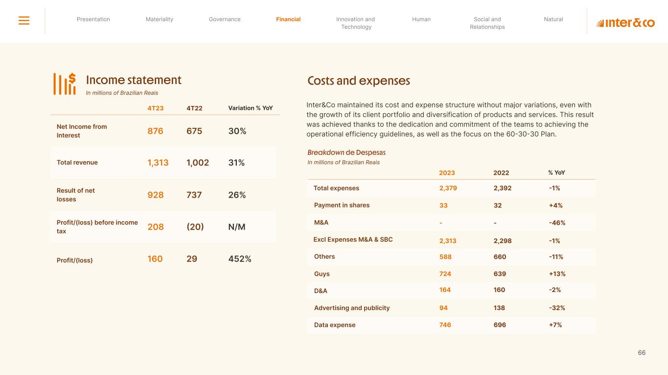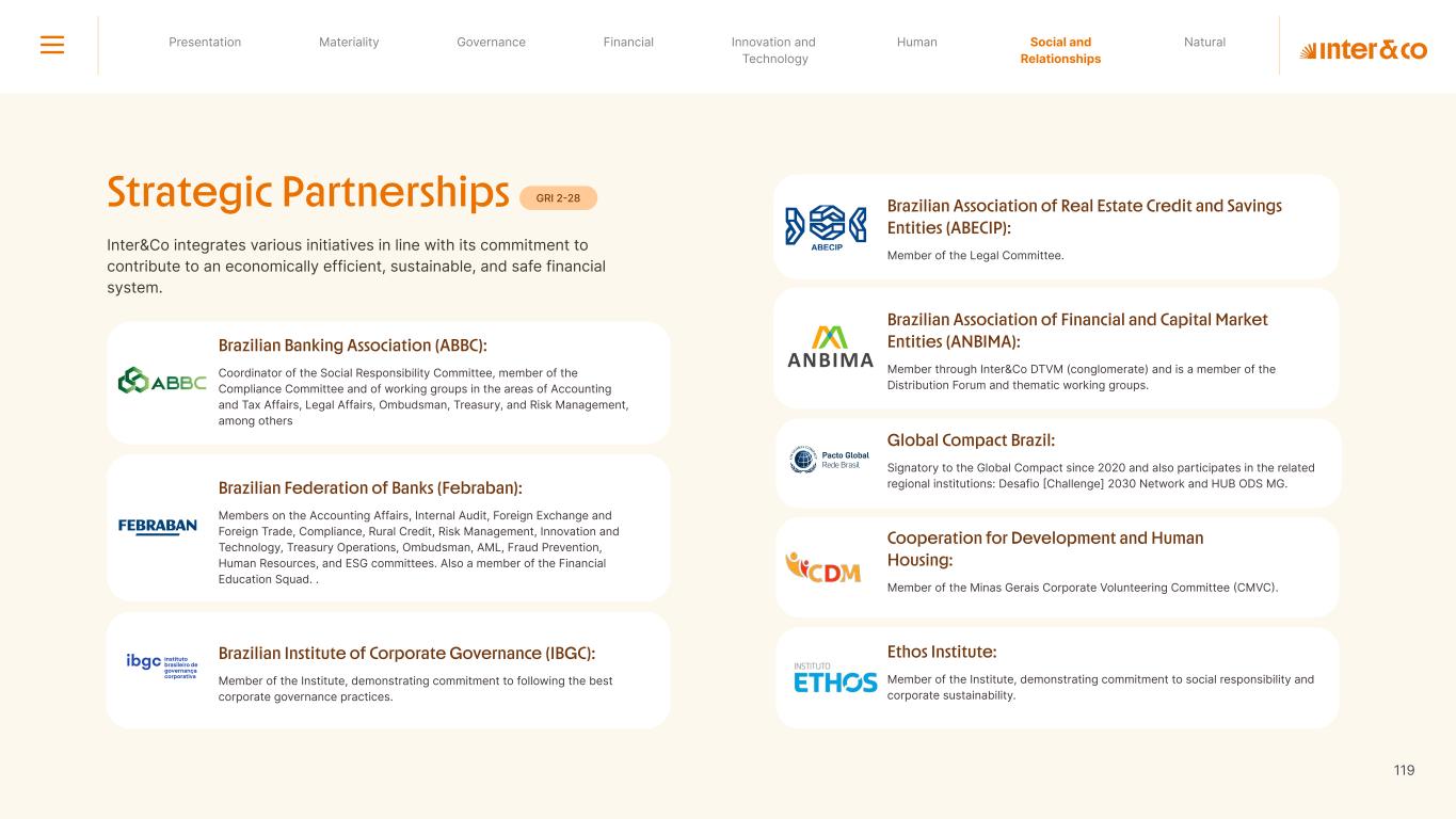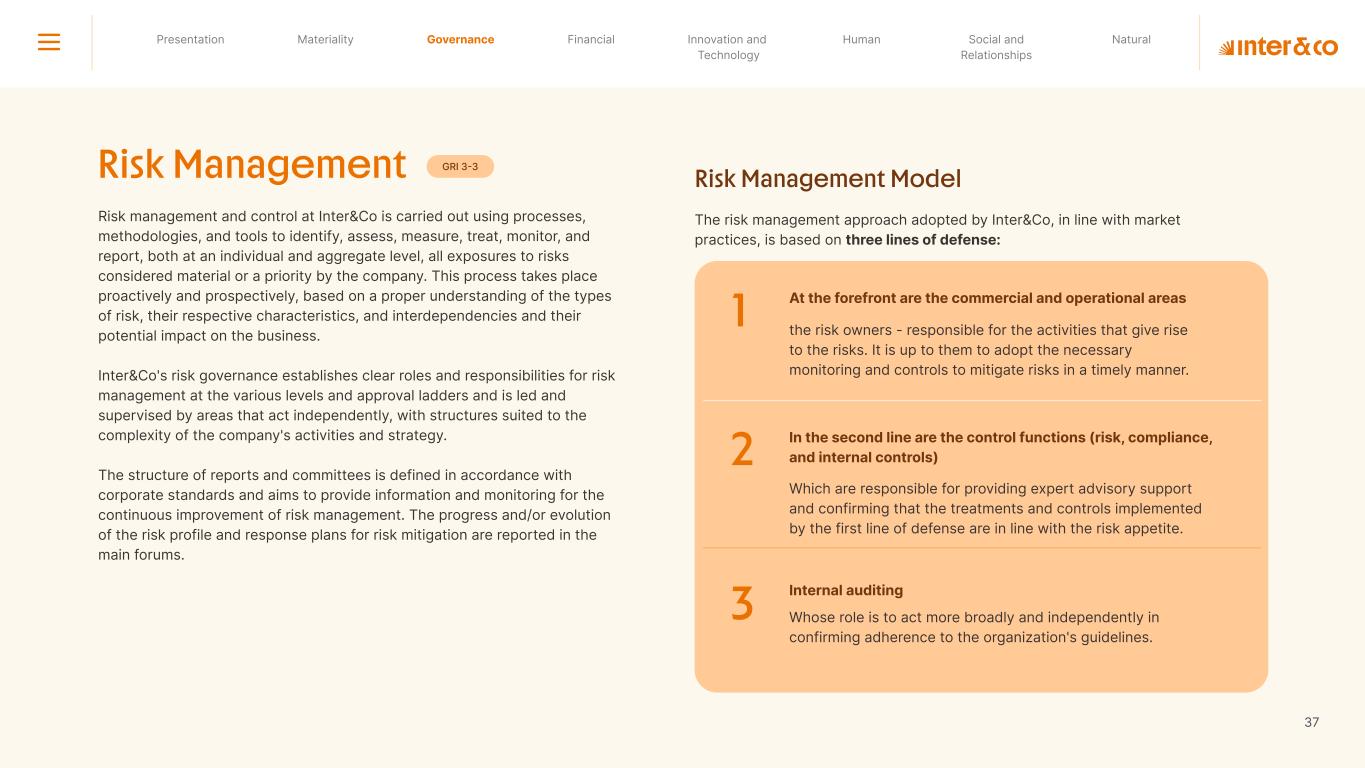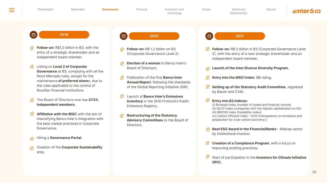 Insurance Health Through the Financial Super App, Inter&Co's activities transcend banking barriers and reach the generation of positive impact on several fronts and for multiple audiences, for society, and the environment. Digital account Corporate account Pix Kids Account Credit card Banking Pay order on credit Digital credit card Pix on credit Real Estate Credit Advance of FGTS Payroll Loan Credit More limit savings Vehicle financing Consortiums Credit Investment platform Meu Porquinho (“My Piggybank”) Investe Fácil (“Invest Easy”) Savings Private pension Investments Exchange points for miles Exchange points for dollars Exchange points for a discount on your bill Exchange points for extra cashback Exchange points for cashback directly on your bill Exchange points for investments in Meu Porquinho (“My Piggybank”) Loop Life insurance Pix Insurance More protected card Travel insurance Home insurance Dental plan Pet health plan Telemedicine Shopping Travel Duo Gourmet Recharge Shell Box Cell Phone Plans Gift Card Sustainable Living Shopping & experiences Inter&Co's Annual Report presents the company's results in generating shared value for its various stakeholder groups, contributing to advancement of the ESG agenda by strengthening the integration of governance, people, and environmental issues at the company and its purpose of unlocking possibilities for an intelligent financial life. Looking beyond the horizon, we are excited about the prospects for 2024. We are focused on delivering the second year of our "60-30-30 Plan". Our ongoing quest to drive innovation and technology, which was even the most popular material topic in our stakeholder survey in 2023, will unlock even more possibilities for a smarter financial life for our customers. ESG at Inter&Co Strategic vision driven by technology and innovation Inter&Co offers the Financial Super App: a powerful platform with integrated products and services, designed to meet the needs of the various moments in its customers' lives. Through an unique and transformative ecosystem, Inter&Co unlocks possibilities for a smart financial life. The Super App for your financial life João Vitor Menin Inter&Co CEO Banking products Non-banking products 01 2023 Annual Report | Pocket Version Download the full report