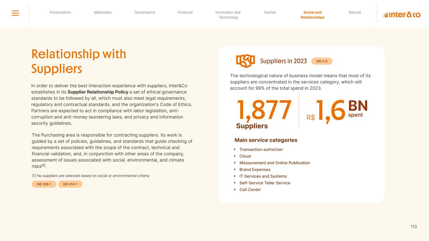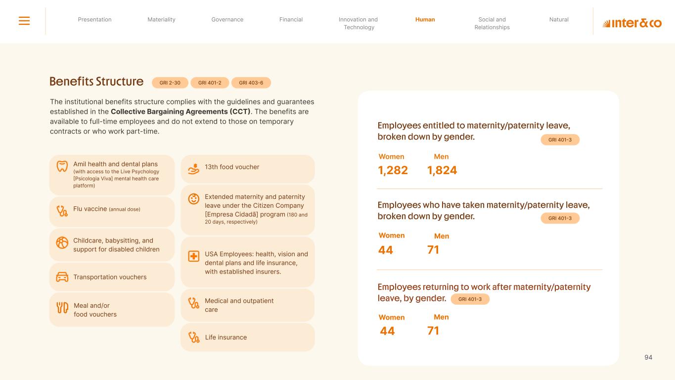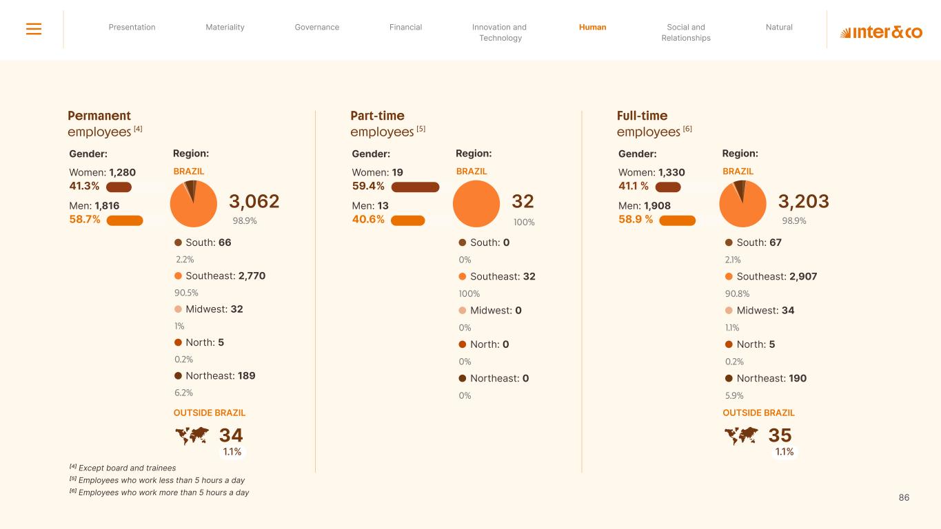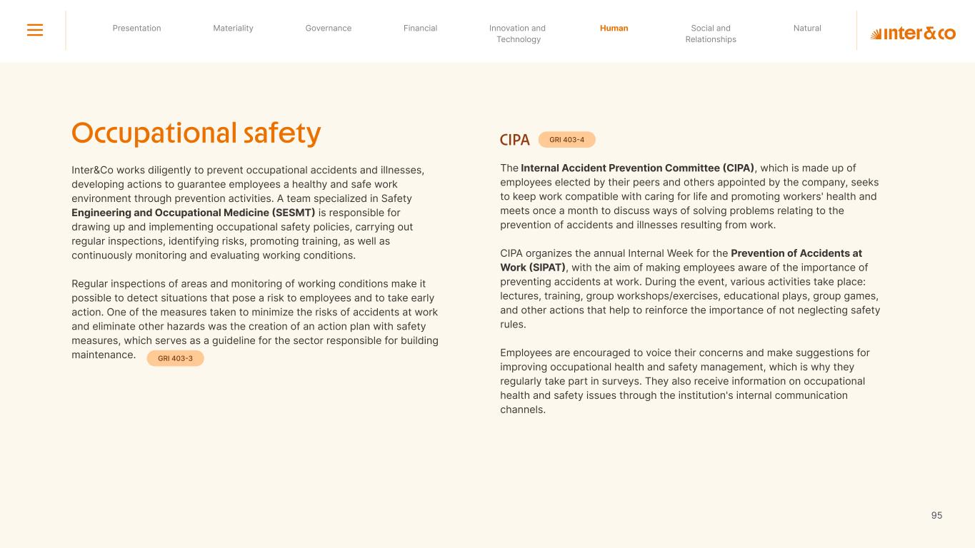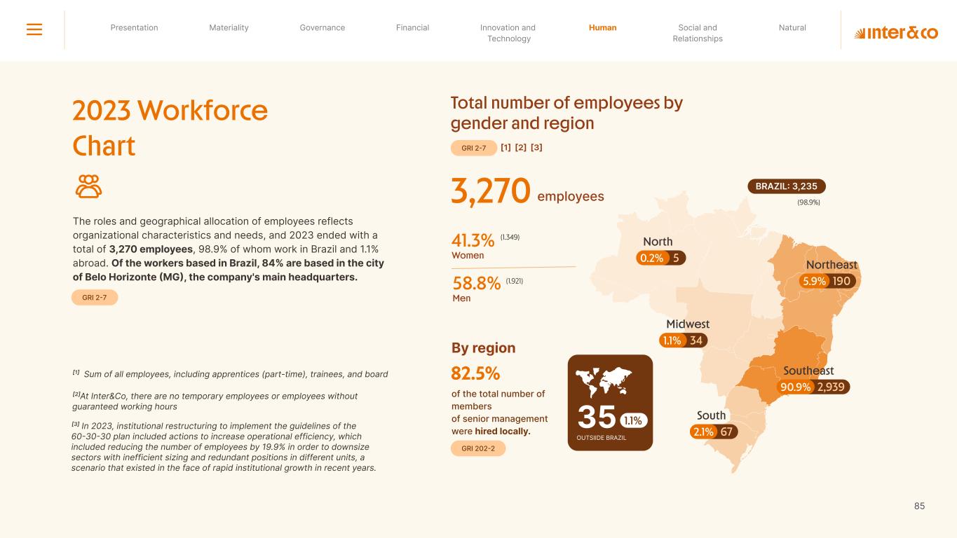 Insurance Health Through the Financial Super App, Inter&Co's activities transcend banking barriers and reach the generation of positive impact on several fronts and for multiple audiences, for society, and the environment. Digital account Corporate account Pix Kids Account Credit card Banking Pay order on credit Digital credit card Pix on credit Real Estate Credit Advance of FGTS Payroll Loan Credit More limit savings Vehicle financing Consortiums Credit Investment platform Meu Porquinho (“My Piggybank”) Investe Fácil (“Invest Easy”) Savings Private pension Investments Exchange points for miles Exchange points for dollars Exchange points for a discount on your bill Exchange points for extra cashback Exchange points for cashback directly on your bill Exchange points for investments in Meu Porquinho (“My Piggybank”) Loop Life insurance Pix Insurance More protected card Travel insurance Home insurance Dental plan Pet health plan Telemedicine Shopping Travel Duo Gourmet Recharge Shell Box Cell Phone Plans Gift Card Sustainable Living Shopping & experiences Inter&Co's Annual Report presents the company's results in generating shared value for its various stakeholder groups, contributing to advancement of the ESG agenda by strengthening the integration of governance, people, and environmental issues at the company and its purpose of unlocking possibilities for an intelligent financial life. Looking beyond the horizon, we are excited about the prospects for 2024. We are focused on delivering the second year of our "60-30-30 Plan". Our ongoing quest to drive innovation and technology, which was even the most popular material topic in our stakeholder survey in 2023, will unlock even more possibilities for a smarter financial life for our customers. ESG at Inter&Co Strategic vision driven by technology and innovation Inter&Co offers the Financial Super App: a powerful platform with integrated products and services, designed to meet the needs of the various moments in its customers' lives. Through an unique and transformative ecosystem, Inter&Co unlocks possibilities for a smart financial life. The Super App for your financial life João Vitor Menin Inter&Co CEO Banking products Non-banking products 01 2023 Annual Report | Pocket Version Download the full report