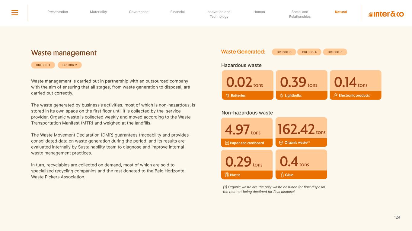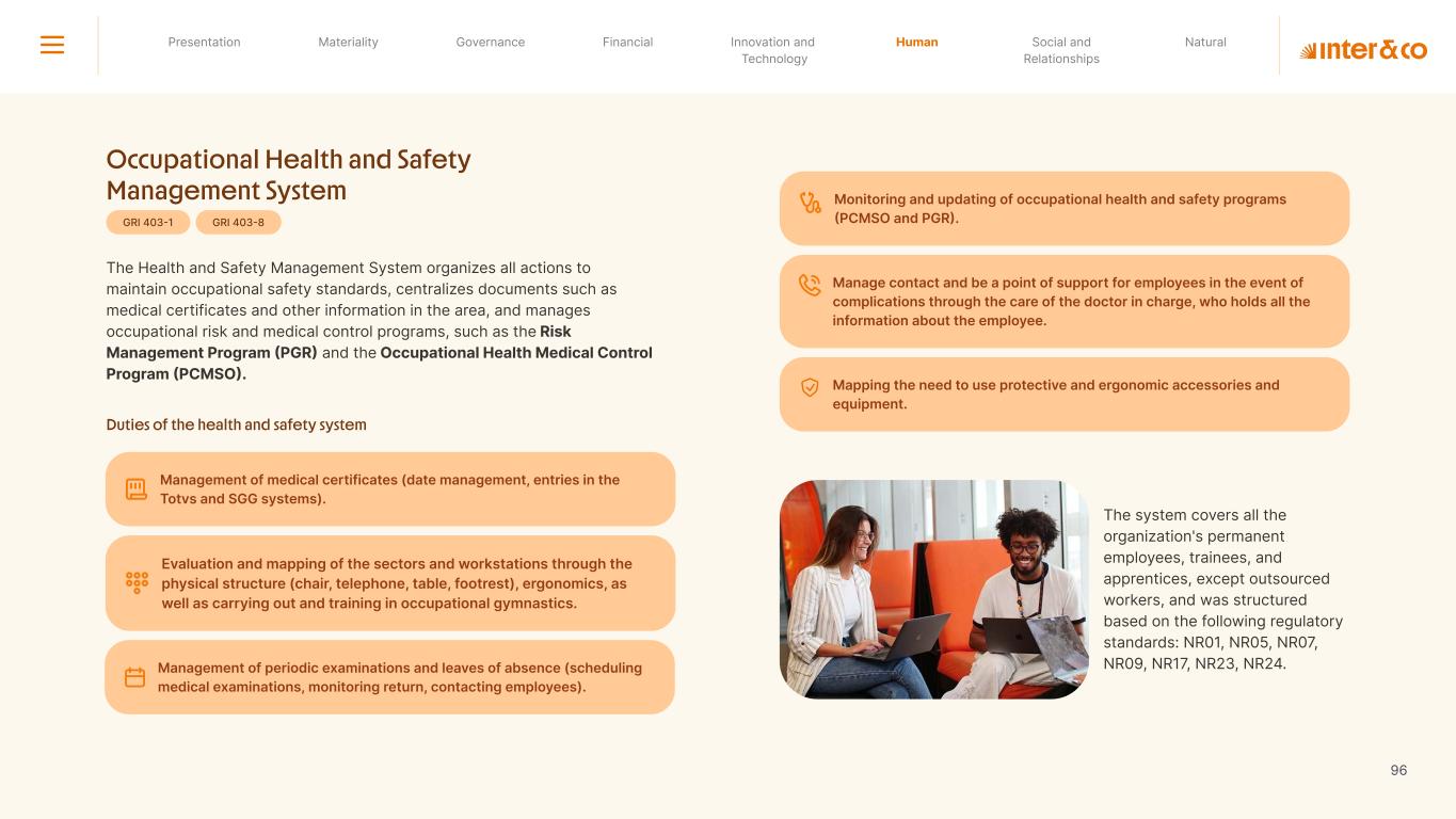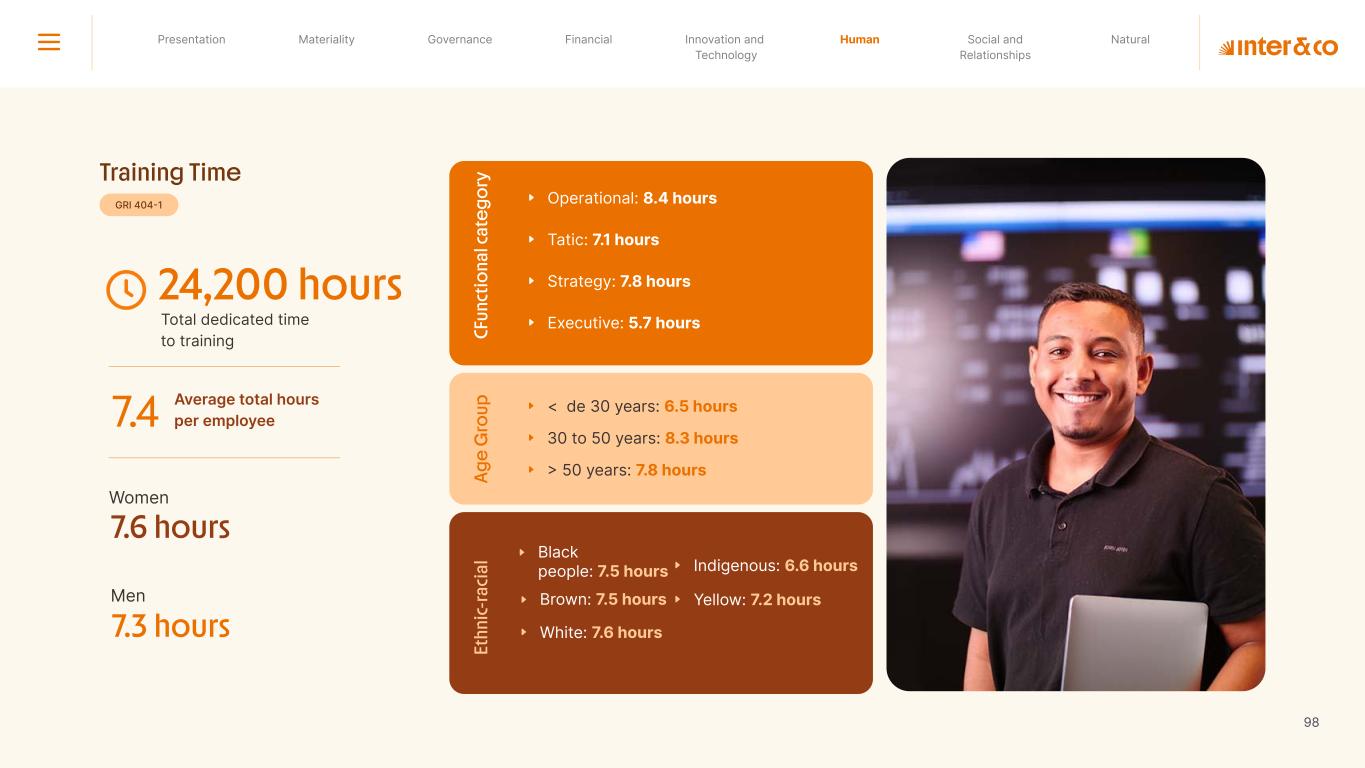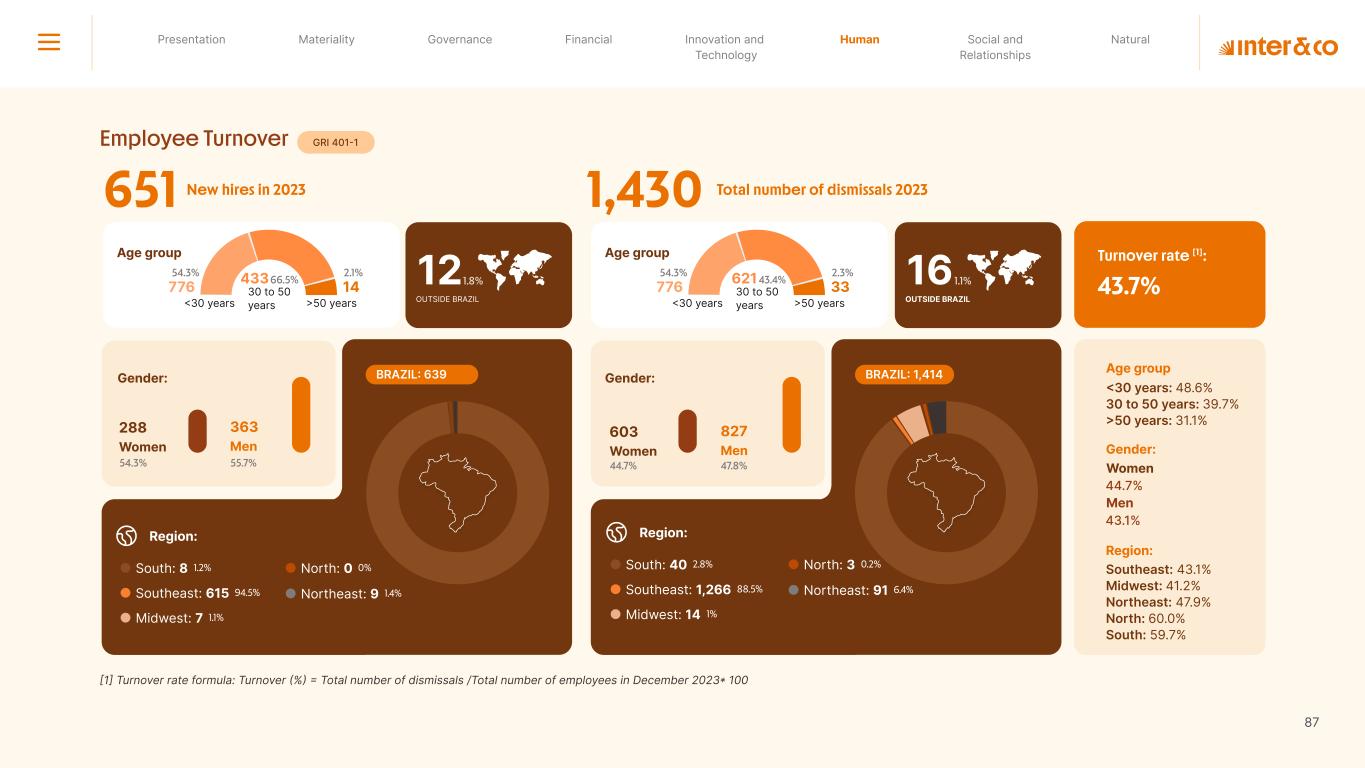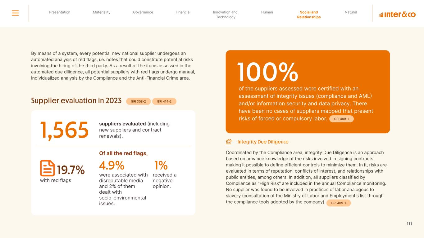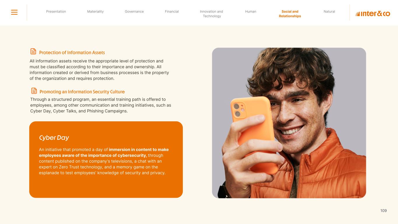Insurance Health Through the Financial Super App, Inter&Co's activities transcend banking barriers and reach the generation of positive impact on several fronts and for multiple audiences, for society, and the environment. Digital account Corporate account Pix Kids Account Credit card Banking Pay order on credit Digital credit card Pix on credit Real Estate Credit Advance of FGTS Payroll Loan Credit More limit savings Vehicle financing Consortiums Credit Investment platform Meu Porquinho (“My Piggybank”) Investe Fácil (“Invest Easy”) Savings Private pension Investments Exchange points for miles Exchange points for dollars Exchange points for a discount on your bill Exchange points for extra cashback Exchange points for cashback directly on your bill Exchange points for investments in Meu Porquinho (“My Piggybank”) Loop Life insurance Pix Insurance More protected card Travel insurance Home insurance Dental plan Pet health plan Telemedicine Shopping Travel Duo Gourmet Recharge Shell Box Cell Phone Plans Gift Card Sustainable Living Shopping & experiences Inter&Co's Annual Report presents the company's results in generating shared value for its various stakeholder groups, contributing to advancement of the ESG agenda by strengthening the integration of governance, people, and environmental issues at the company and its purpose of unlocking possibilities for an intelligent financial life. Looking beyond the horizon, we are excited about the prospects for 2024. We are focused on delivering the second year of our "60-30-30 Plan". Our ongoing quest to drive innovation and technology, which was even the most popular material topic in our stakeholder survey in 2023, will unlock even more possibilities for a smarter financial life for our customers. ESG at Inter&Co Strategic vision driven by technology and innovation Inter&Co offers the Financial Super App: a powerful platform with integrated products and services, designed to meet the needs of the various moments in its customers' lives. Through an unique and transformative ecosystem, Inter&Co unlocks possibilities for a smart financial life. The Super App for your financial life João Vitor Menin Inter&Co CEO Banking products Non-banking products 01 2023 Annual Report | Pocket Version Download the full report