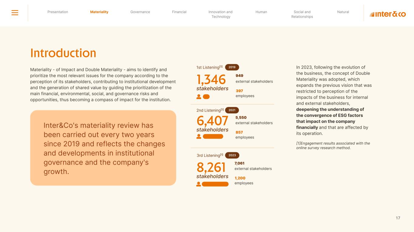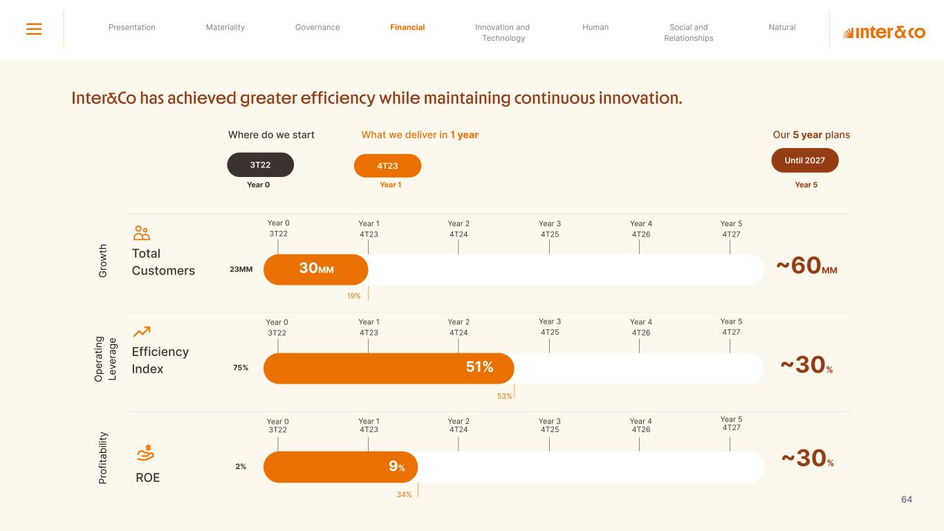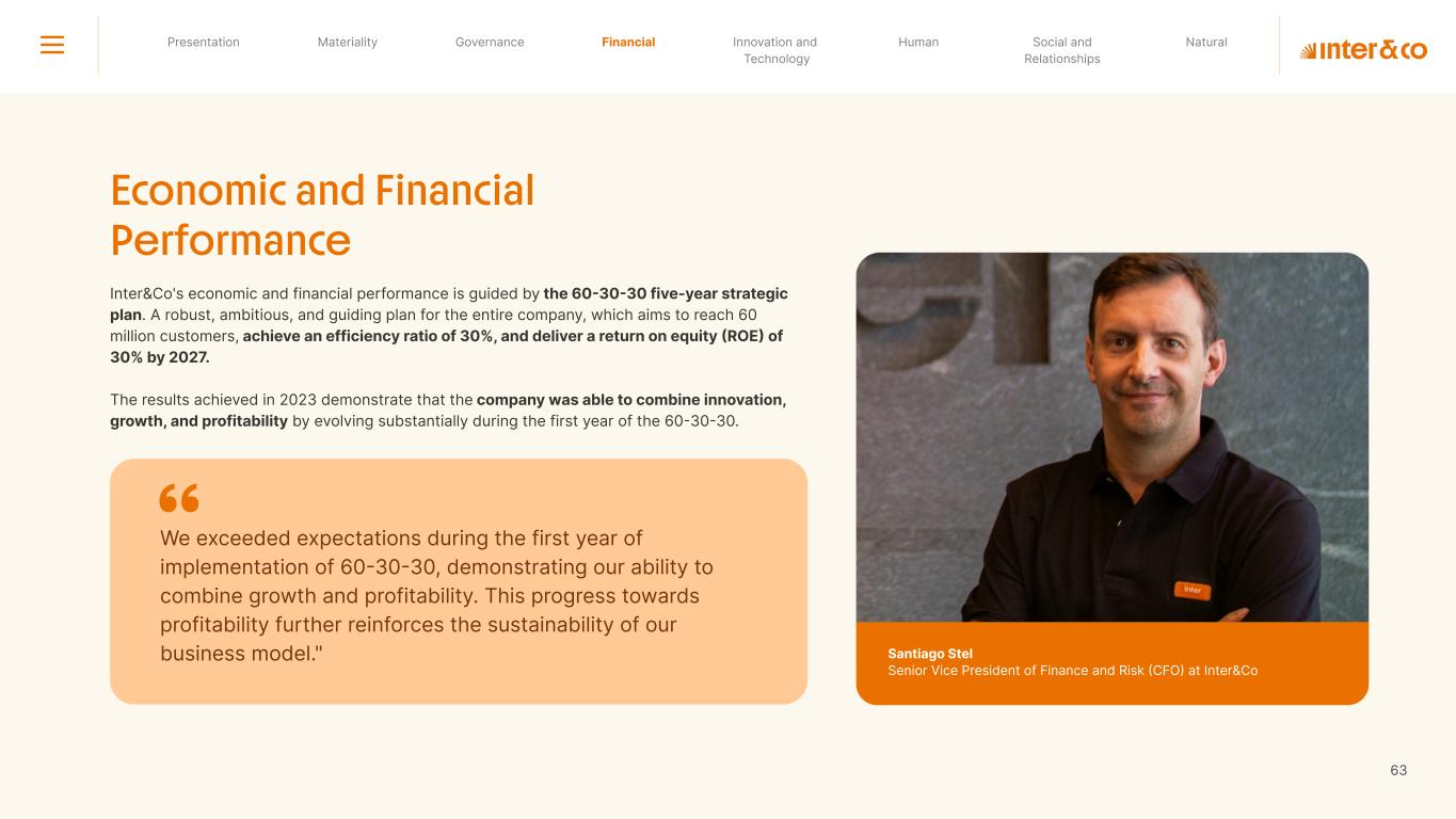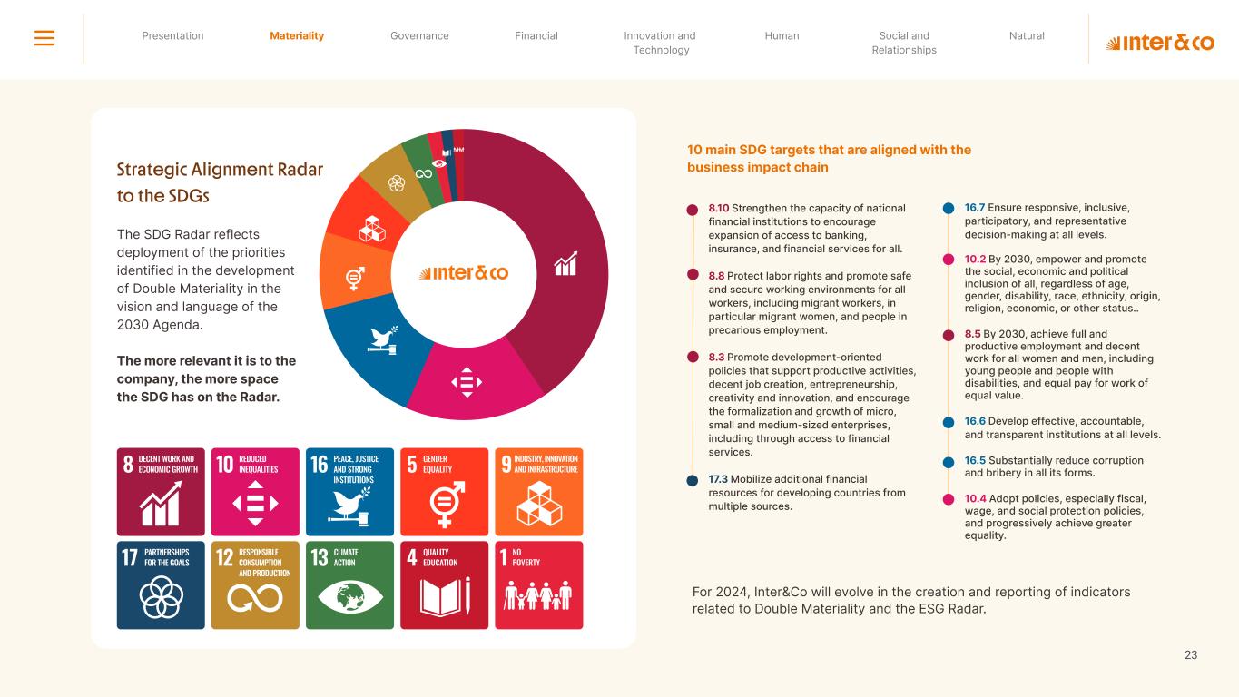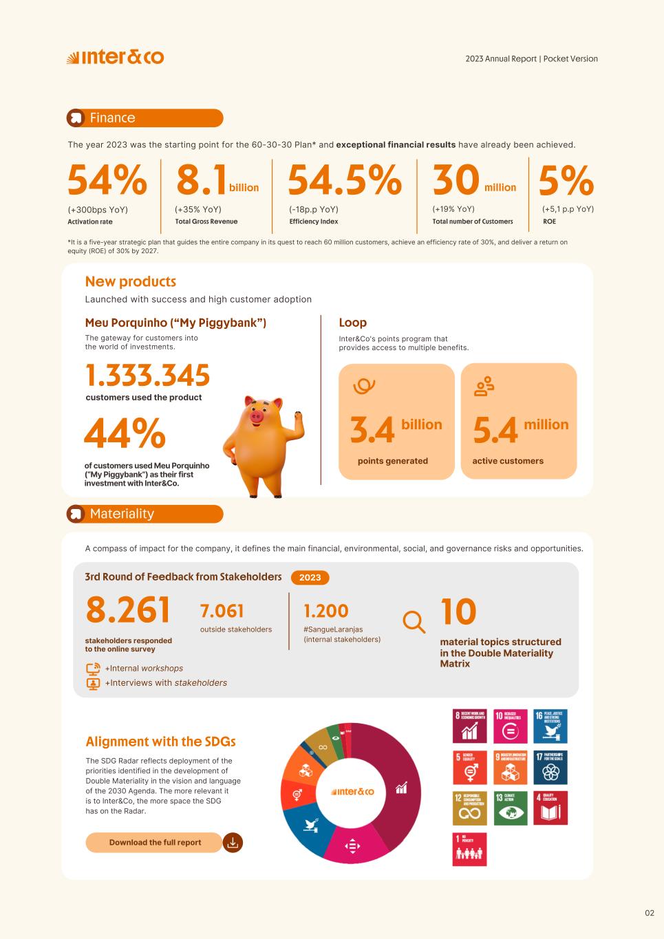 1.200 #SangueLaranjas (internal stakeholders) 3rd Round of Feedback from Stakeholders billion 54.5% 30 million54% 8.1 5% Activation rate (+300bps YoY) Total Gross Revenue (+35% YoY) (-18p.p YoY) Efficiency Index Total number of Customers (+19% YoY) (+5,1 p.p YoY) ROE billion points generated 3.4 5.4 active customers million +Internal workshops +Interviews with stakeholders Alignment with the SDGs The SDG Radar reflects deployment of the priorities identified in the development of Double Materiality in the vision and language of the 2030 Agenda. The more relevant it is to Inter&Co, the more space the SDG has on the Radar. 8.261 stakeholders responded to the online survey 7.061 outside stakeholders The year 2023 was the starting point for the 60-30-30 Plan* and exceptional financial results have already been achieved. The gateway for customers into the world of investments. Inter&Co's points program that provides access to multiple benefits. Meu Porquinho (“My Piggybank”) Loop 1.333.345 customers used the product 44% of customers used Meu Porquinho (“My Piggybank”) as their first investment with Inter&Co. A compass of impact for the company, it defines the main financial, environmental, social, and governance risks and opportunities. 02 2023 *It is a five-year strategic plan that guides the entire company in its quest to reach 60 million customers, achieve an efficiency rate of 30%, and deliver a return on equity (ROE) of 30% by 2027. Launched with success and high customer adoption New products Finance Materiality 2023 Annual Report | Pocket Version Download the full report 10 material topics structured in the Double Materiality Matrix