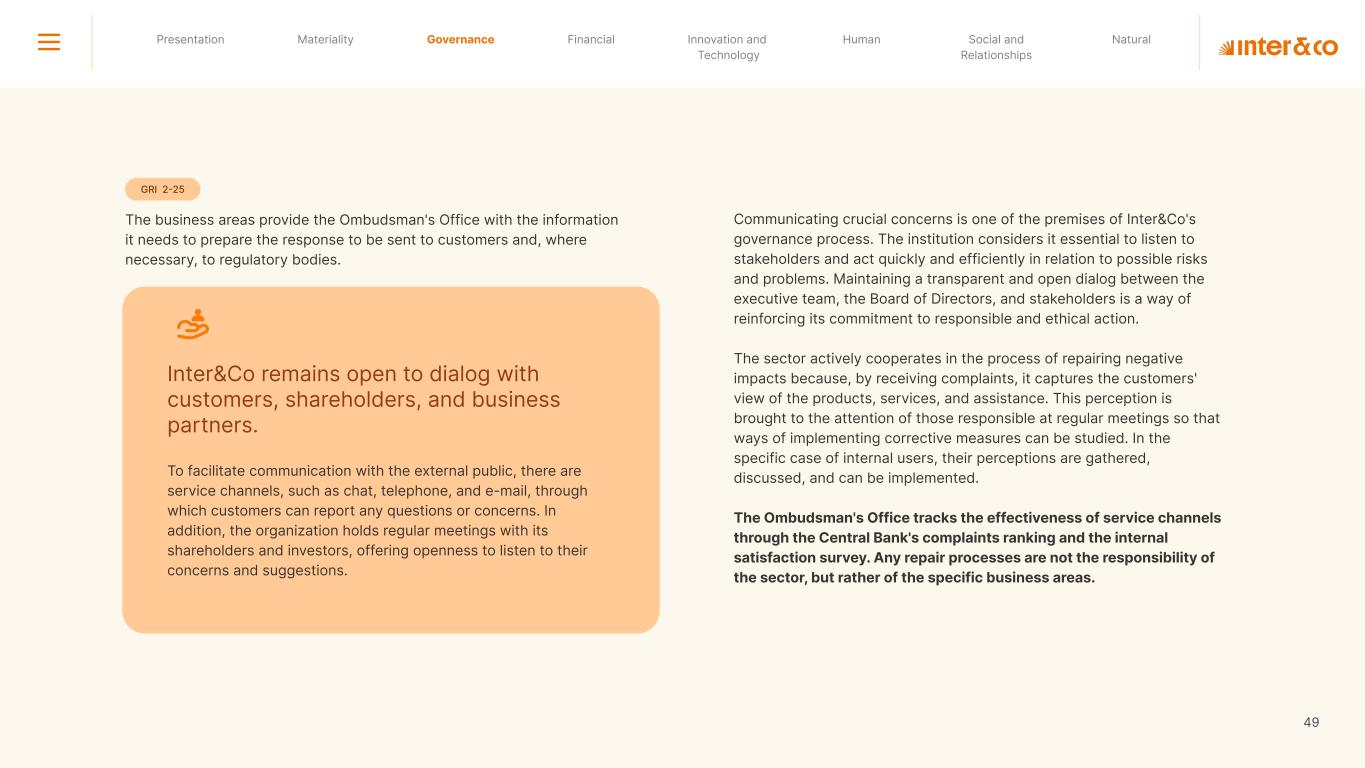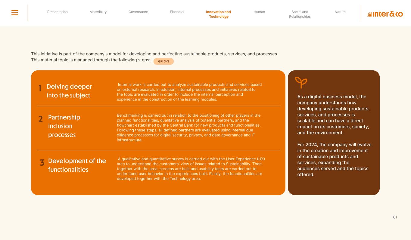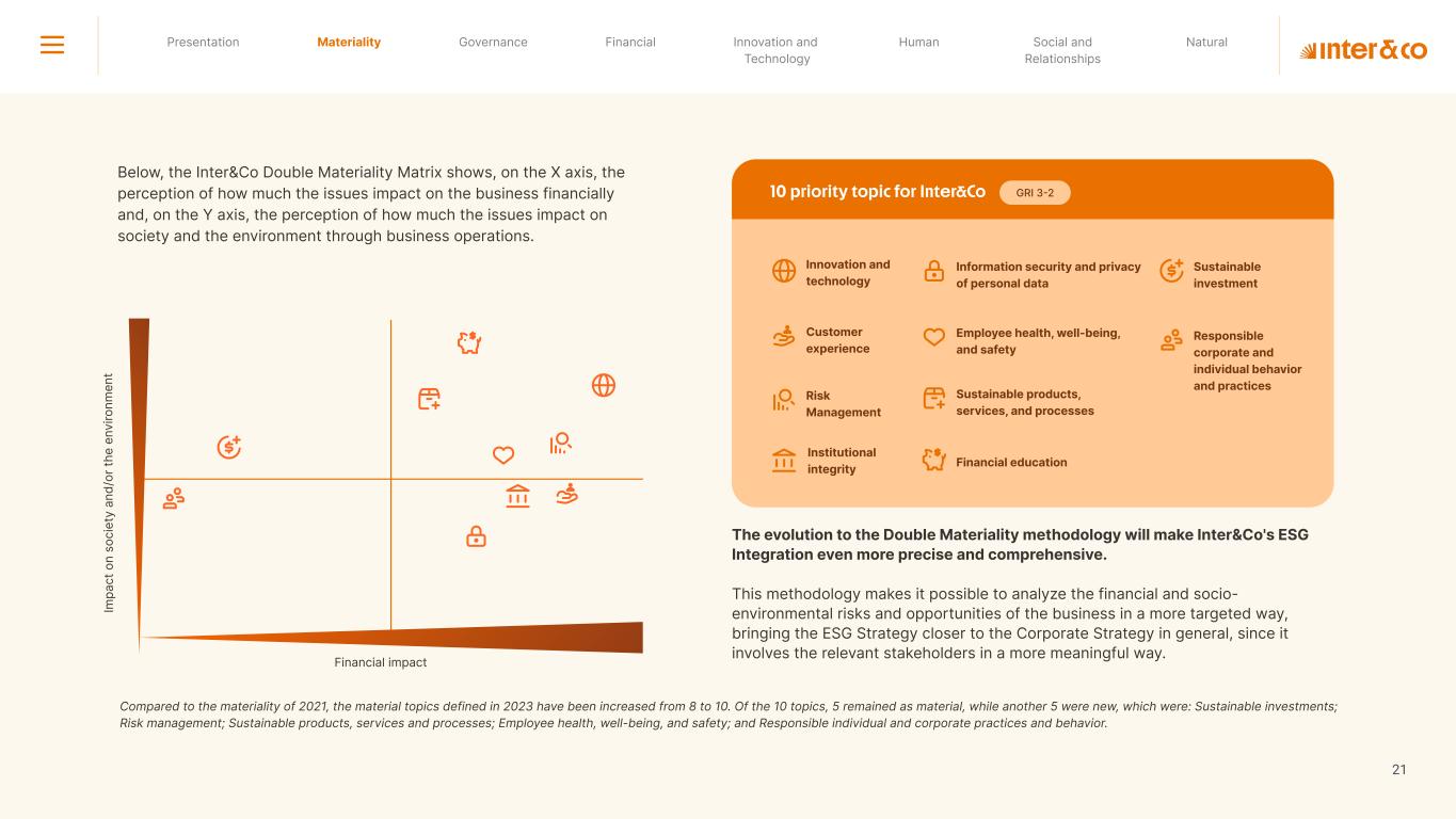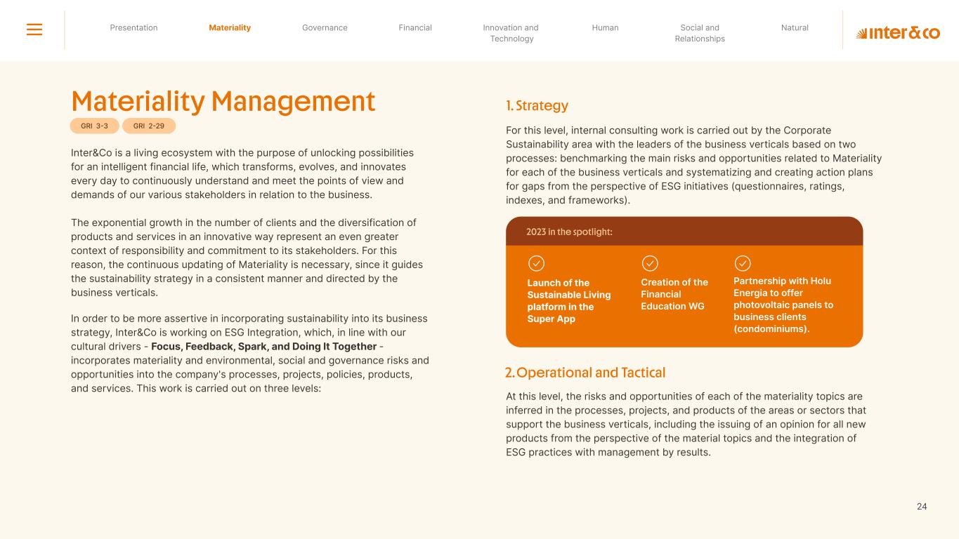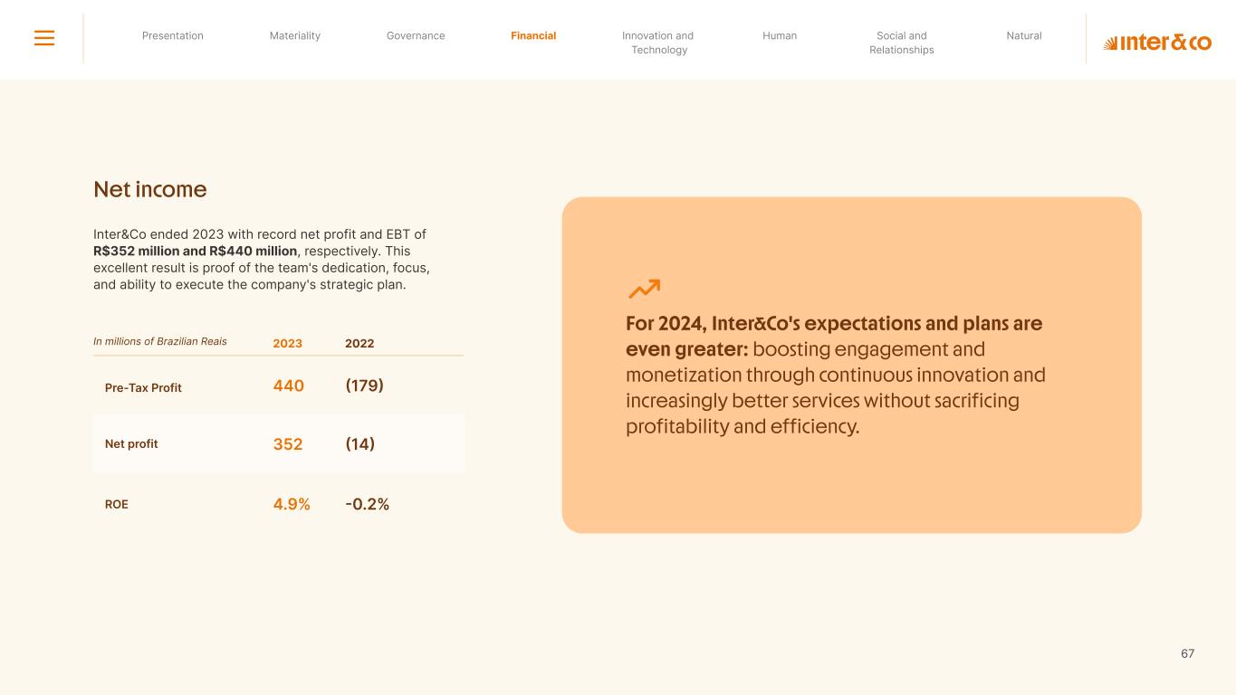 1.200 #SangueLaranjas (internal stakeholders) 3rd Round of Feedback from Stakeholders billion 54.5% 30 million54% 8.1 5% Activation rate (+300bps YoY) Total Gross Revenue (+35% YoY) (-18p.p YoY) Efficiency Index Total number of Customers (+19% YoY) (+5,1 p.p YoY) ROE billion points generated 3.4 5.4 active customers million +Internal workshops +Interviews with stakeholders Alignment with the SDGs The SDG Radar reflects deployment of the priorities identified in the development of Double Materiality in the vision and language of the 2030 Agenda. The more relevant it is to Inter&Co, the more space the SDG has on the Radar. 8.261 stakeholders responded to the online survey 7.061 outside stakeholders The year 2023 was the starting point for the 60-30-30 Plan* and exceptional financial results have already been achieved. The gateway for customers into the world of investments. Inter&Co's points program that provides access to multiple benefits. Meu Porquinho (“My Piggybank”) Loop 1.333.345 customers used the product 44% of customers used Meu Porquinho (“My Piggybank”) as their first investment with Inter&Co. A compass of impact for the company, it defines the main financial, environmental, social, and governance risks and opportunities. 02 2023 *It is a five-year strategic plan that guides the entire company in its quest to reach 60 million customers, achieve an efficiency rate of 30%, and deliver a return on equity (ROE) of 30% by 2027. Launched with success and high customer adoption New products Finance Materiality 2023 Annual Report | Pocket Version Download the full report 10 material topics structured in the Double Materiality Matrix
