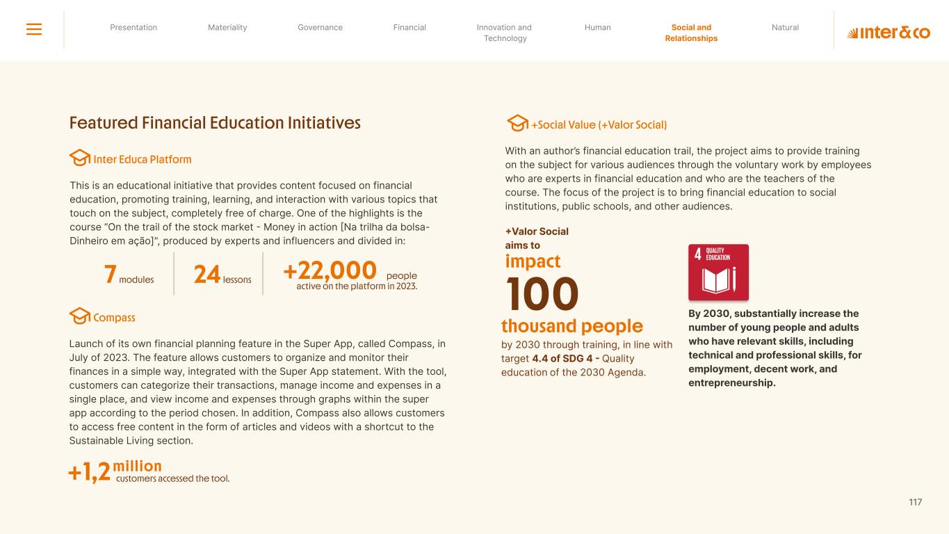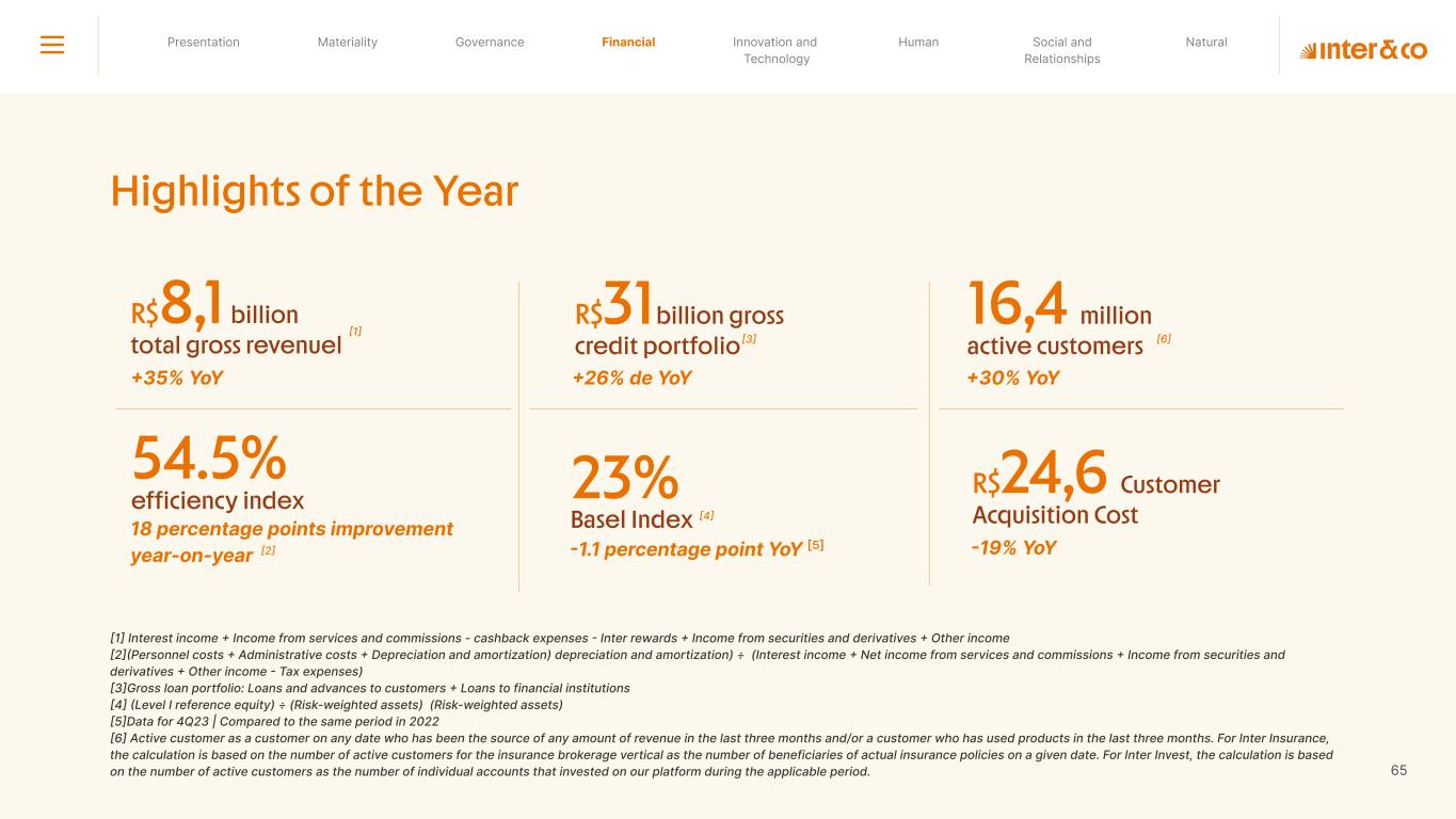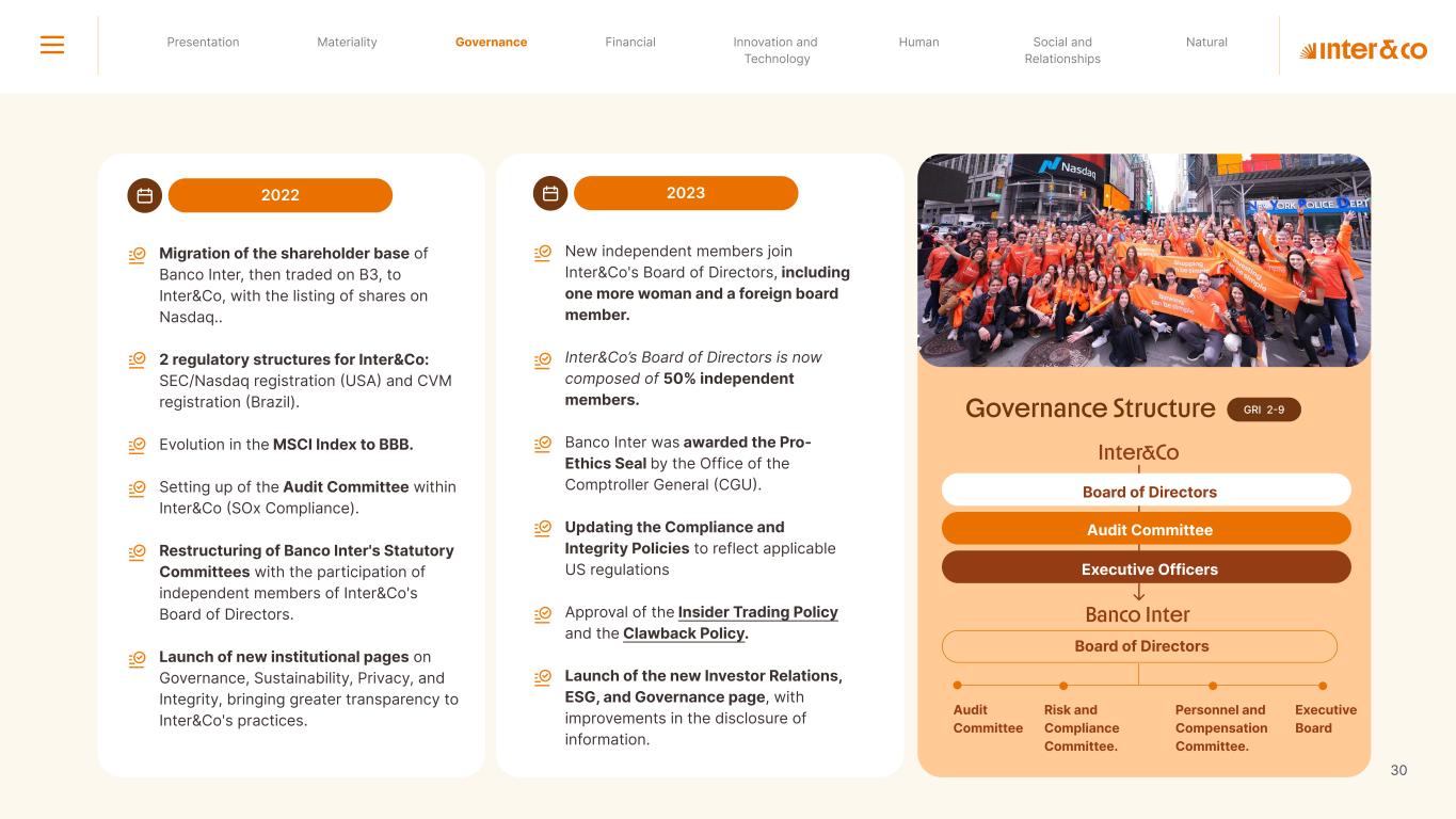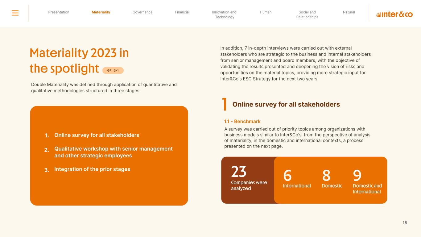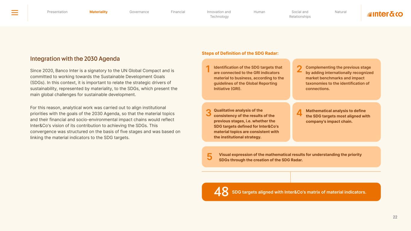 1.200 #SangueLaranjas (internal stakeholders) 3rd Round of Feedback from Stakeholders billion 54.5% 30 million54% 8.1 5% Activation rate (+300bps YoY) Total Gross Revenue (+35% YoY) (-18p.p YoY) Efficiency Index Total number of Customers (+19% YoY) (+5,1 p.p YoY) ROE billion points generated 3.4 5.4 active customers million +Internal workshops +Interviews with stakeholders Alignment with the SDGs The SDG Radar reflects deployment of the priorities identified in the development of Double Materiality in the vision and language of the 2030 Agenda. The more relevant it is to Inter&Co, the more space the SDG has on the Radar. 8.261 stakeholders responded to the online survey 7.061 outside stakeholders The year 2023 was the starting point for the 60-30-30 Plan* and exceptional financial results have already been achieved. The gateway for customers into the world of investments. Inter&Co's points program that provides access to multiple benefits. Meu Porquinho (“My Piggybank”) Loop 1.333.345 customers used the product 44% of customers used Meu Porquinho (“My Piggybank”) as their first investment with Inter&Co. A compass of impact for the company, it defines the main financial, environmental, social, and governance risks and opportunities. 02 2023 *It is a five-year strategic plan that guides the entire company in its quest to reach 60 million customers, achieve an efficiency rate of 30%, and deliver a return on equity (ROE) of 30% by 2027. Launched with success and high customer adoption New products Finance Materiality 2023 Annual Report | Pocket Version Download the full report 10 material topics structured in the Double Materiality Matrix
