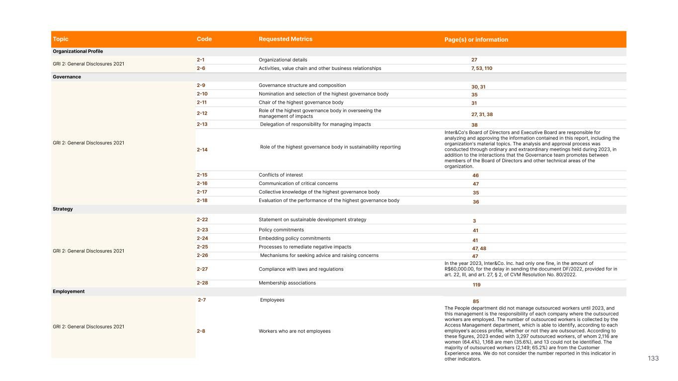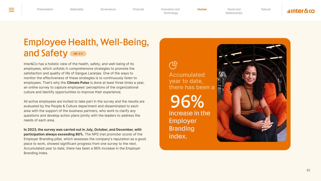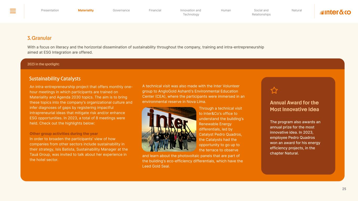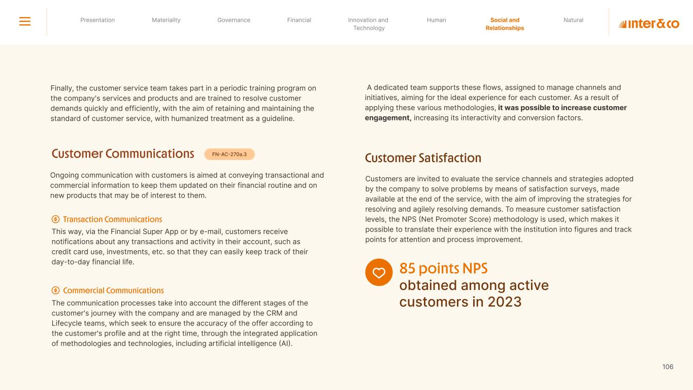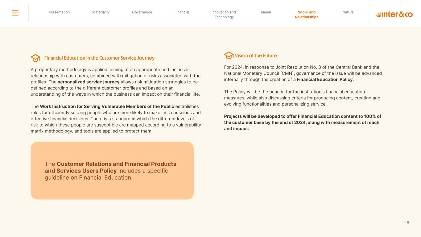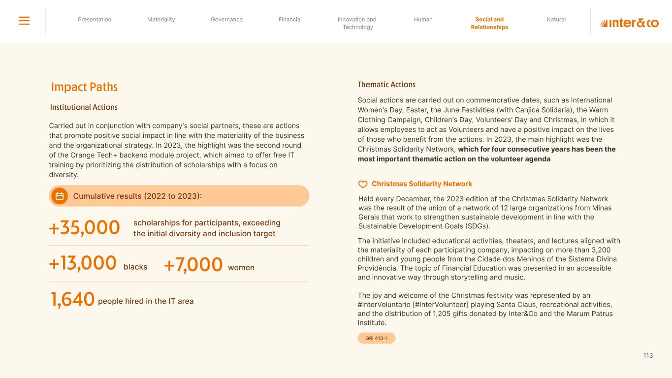 1.200 #SangueLaranjas (internal stakeholders) 3rd Round of Feedback from Stakeholders billion 54.5% 30 million54% 8.1 5% Activation rate (+300bps YoY) Total Gross Revenue (+35% YoY) (-18p.p YoY) Efficiency Index Total number of Customers (+19% YoY) (+5,1 p.p YoY) ROE billion points generated 3.4 5.4 active customers million +Internal workshops +Interviews with stakeholders Alignment with the SDGs The SDG Radar reflects deployment of the priorities identified in the development of Double Materiality in the vision and language of the 2030 Agenda. The more relevant it is to Inter&Co, the more space the SDG has on the Radar. 8.261 stakeholders responded to the online survey 7.061 outside stakeholders The year 2023 was the starting point for the 60-30-30 Plan* and exceptional financial results have already been achieved. The gateway for customers into the world of investments. Inter&Co's points program that provides access to multiple benefits. Meu Porquinho (“My Piggybank”) Loop 1.333.345 customers used the product 44% of customers used Meu Porquinho (“My Piggybank”) as their first investment with Inter&Co. A compass of impact for the company, it defines the main financial, environmental, social, and governance risks and opportunities. 02 2023 *It is a five-year strategic plan that guides the entire company in its quest to reach 60 million customers, achieve an efficiency rate of 30%, and deliver a return on equity (ROE) of 30% by 2027. Launched with success and high customer adoption New products Finance Materiality 2023 Annual Report | Pocket Version Download the full report 10 material topics structured in the Double Materiality Matrix
