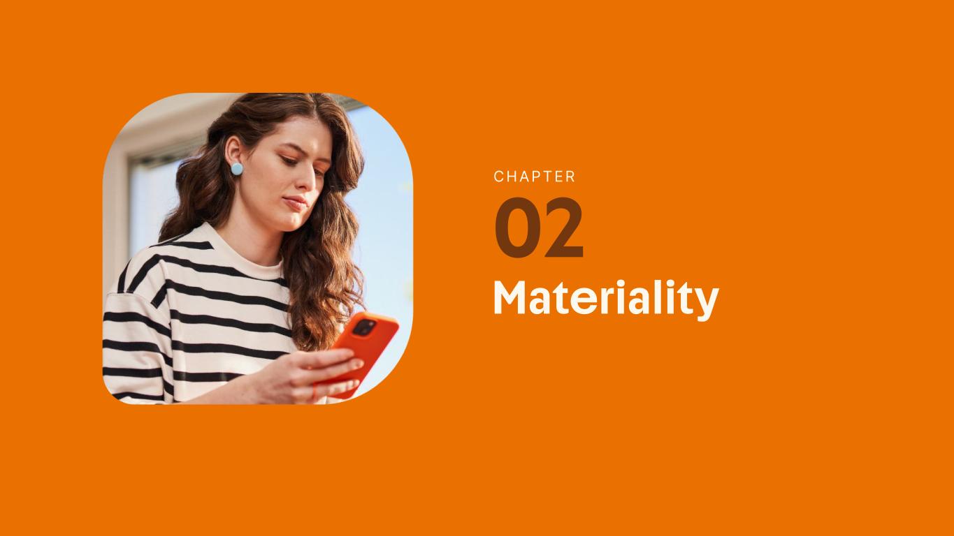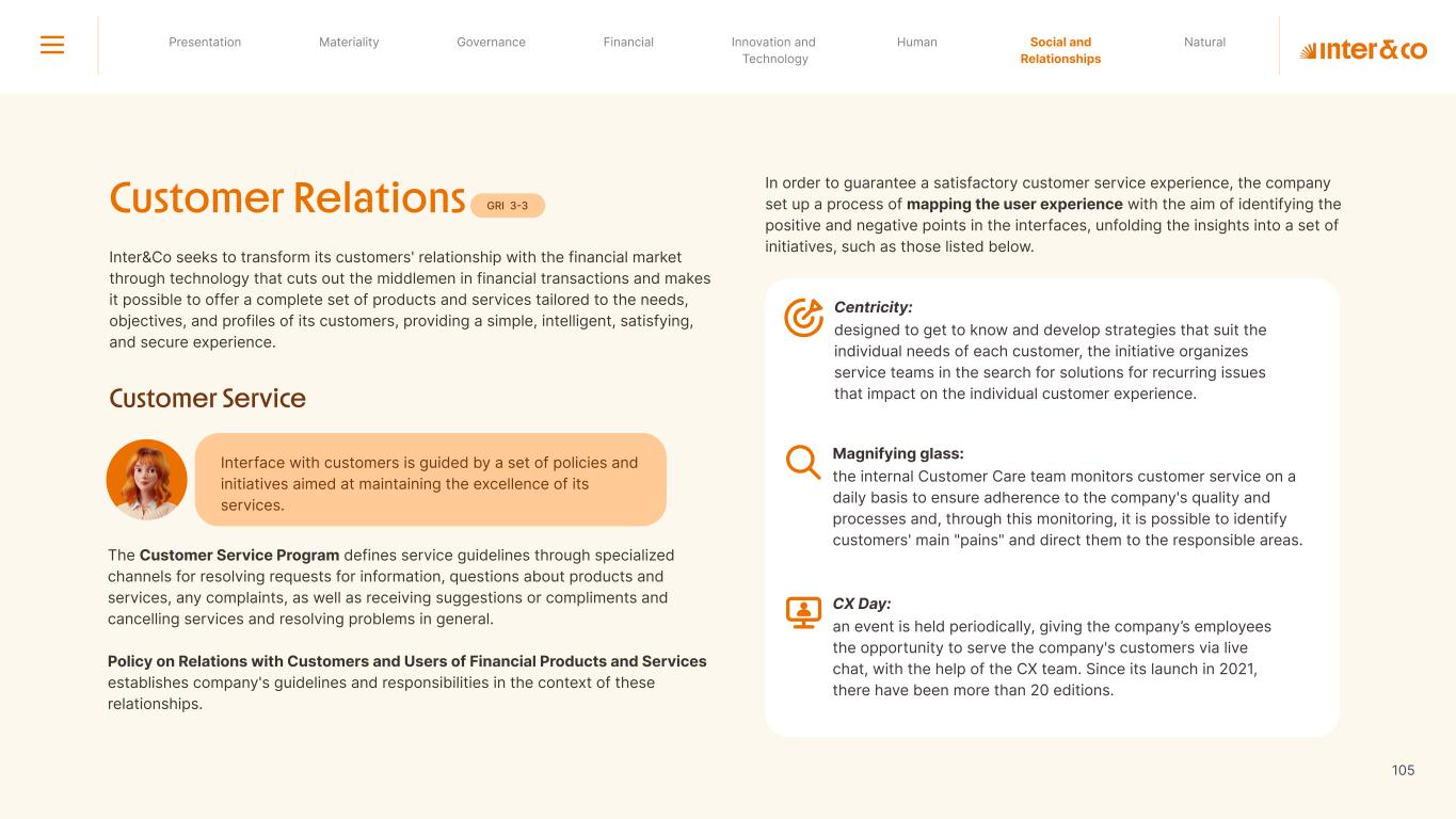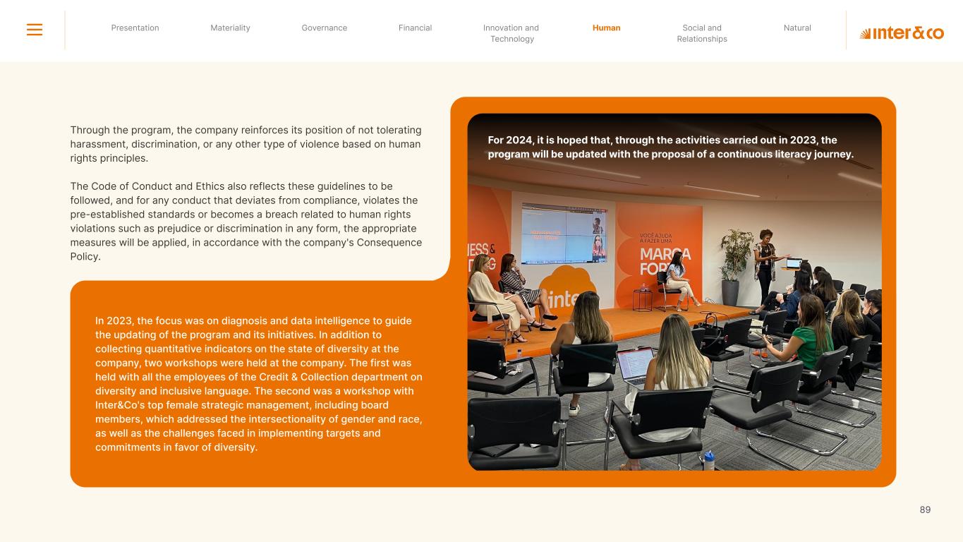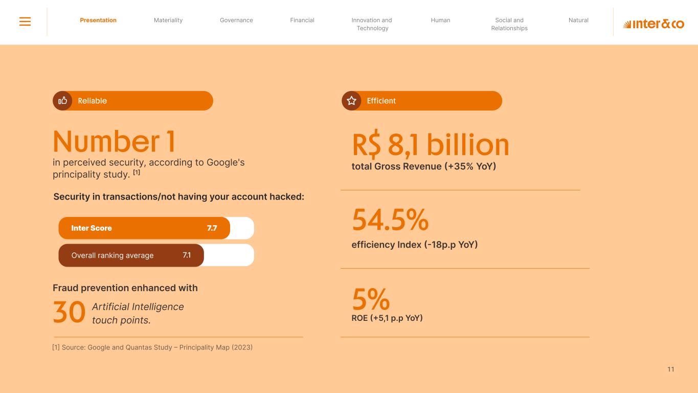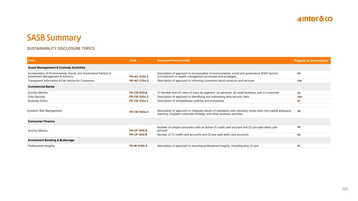 1.200 #SangueLaranjas (internal stakeholders) 3rd Round of Feedback from Stakeholders billion 54.5% 30 million54% 8.1 5% Activation rate (+300bps YoY) Total Gross Revenue (+35% YoY) (-18p.p YoY) Efficiency Index Total number of Customers (+19% YoY) (+5,1 p.p YoY) ROE billion points generated 3.4 5.4 active customers million +Internal workshops +Interviews with stakeholders Alignment with the SDGs The SDG Radar reflects deployment of the priorities identified in the development of Double Materiality in the vision and language of the 2030 Agenda. The more relevant it is to Inter&Co, the more space the SDG has on the Radar. 8.261 stakeholders responded to the online survey 7.061 outside stakeholders The year 2023 was the starting point for the 60-30-30 Plan* and exceptional financial results have already been achieved. The gateway for customers into the world of investments. Inter&Co's points program that provides access to multiple benefits. Meu Porquinho (“My Piggybank”) Loop 1.333.345 customers used the product 44% of customers used Meu Porquinho (“My Piggybank”) as their first investment with Inter&Co. A compass of impact for the company, it defines the main financial, environmental, social, and governance risks and opportunities. 02 2023 *It is a five-year strategic plan that guides the entire company in its quest to reach 60 million customers, achieve an efficiency rate of 30%, and deliver a return on equity (ROE) of 30% by 2027. Launched with success and high customer adoption New products Finance Materiality 2023 Annual Report | Pocket Version Download the full report 10 material topics structured in the Double Materiality Matrix