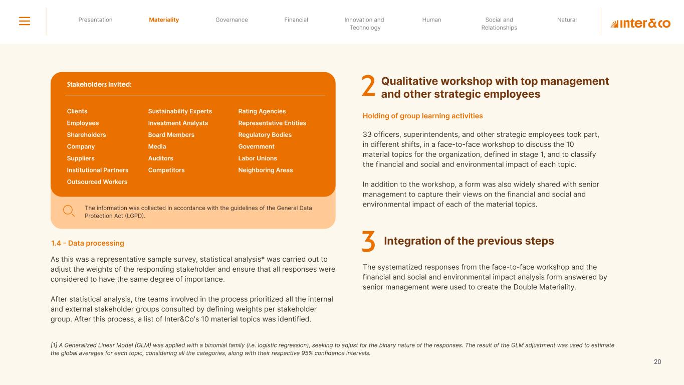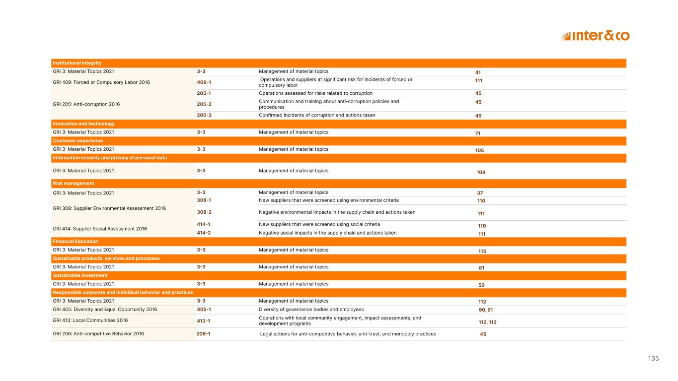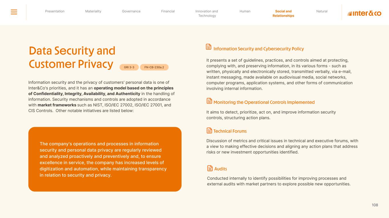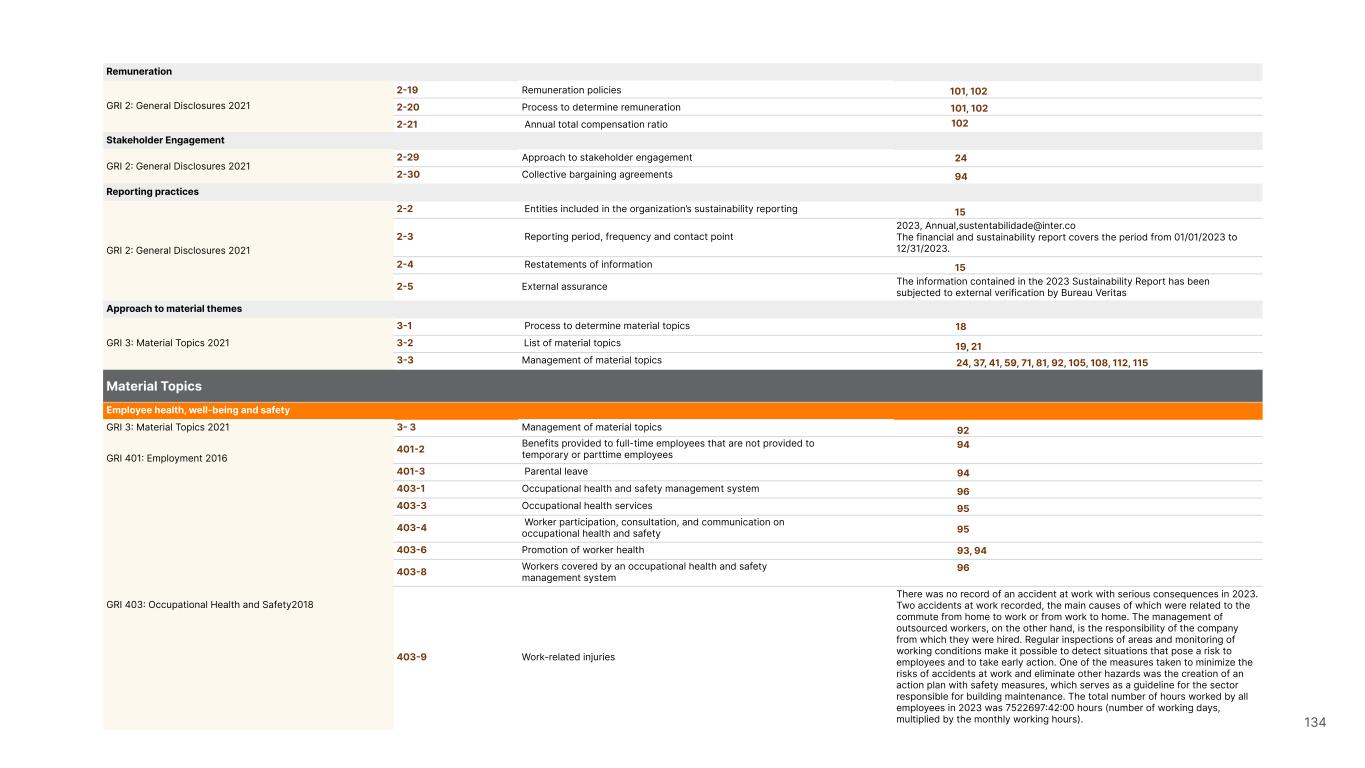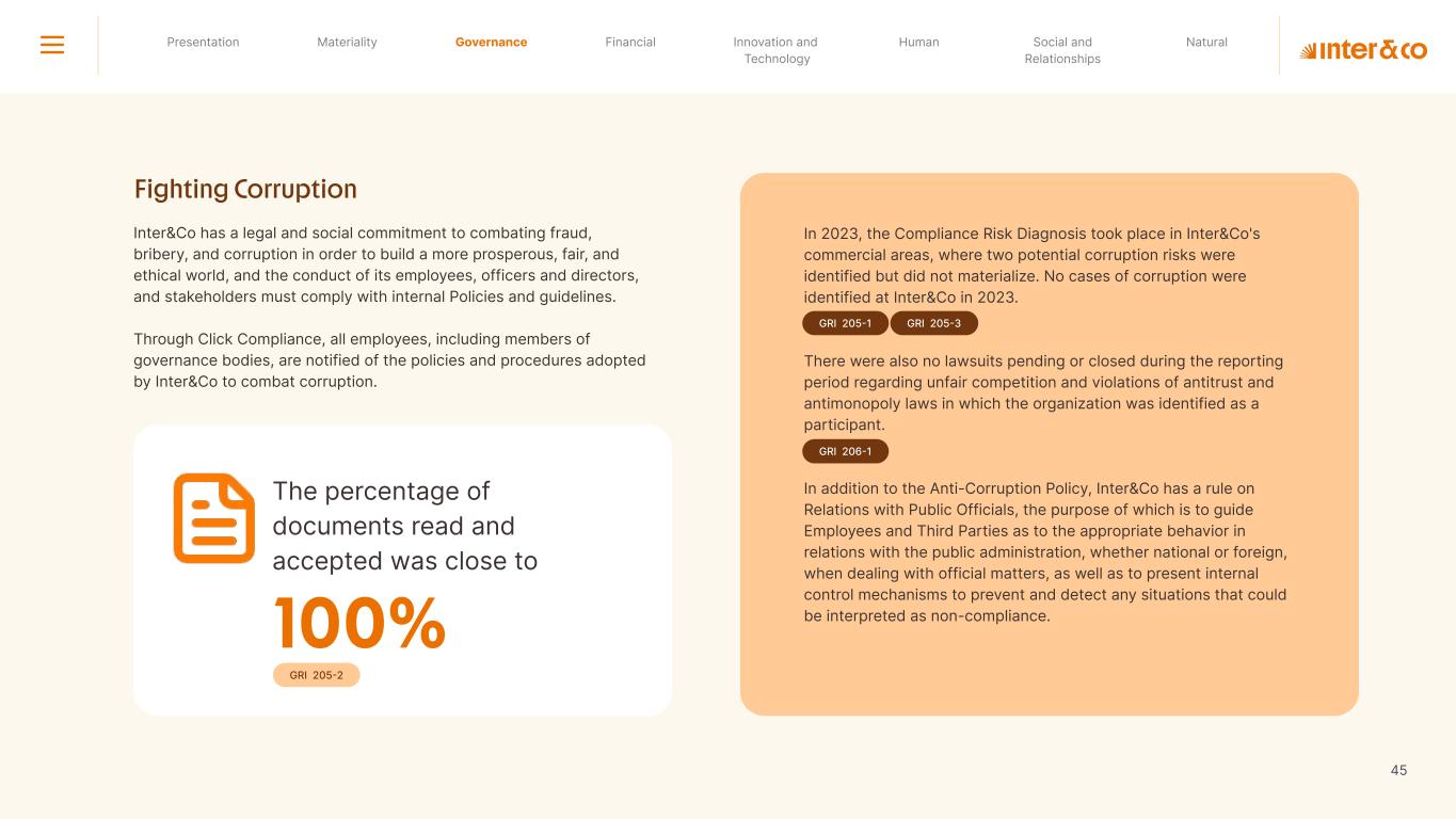 1.200 #SangueLaranjas (internal stakeholders) 3rd Round of Feedback from Stakeholders billion 54.5% 30 million54% 8.1 5% Activation rate (+300bps YoY) Total Gross Revenue (+35% YoY) (-18p.p YoY) Efficiency Index Total number of Customers (+19% YoY) (+5,1 p.p YoY) ROE billion points generated 3.4 5.4 active customers million +Internal workshops +Interviews with stakeholders Alignment with the SDGs The SDG Radar reflects deployment of the priorities identified in the development of Double Materiality in the vision and language of the 2030 Agenda. The more relevant it is to Inter&Co, the more space the SDG has on the Radar. 8.261 stakeholders responded to the online survey 7.061 outside stakeholders The year 2023 was the starting point for the 60-30-30 Plan* and exceptional financial results have already been achieved. The gateway for customers into the world of investments. Inter&Co's points program that provides access to multiple benefits. Meu Porquinho (“My Piggybank”) Loop 1.333.345 customers used the product 44% of customers used Meu Porquinho (“My Piggybank”) as their first investment with Inter&Co. A compass of impact for the company, it defines the main financial, environmental, social, and governance risks and opportunities. 02 2023 *It is a five-year strategic plan that guides the entire company in its quest to reach 60 million customers, achieve an efficiency rate of 30%, and deliver a return on equity (ROE) of 30% by 2027. Launched with success and high customer adoption New products Finance Materiality 2023 Annual Report | Pocket Version Download the full report 10 material topics structured in the Double Materiality Matrix