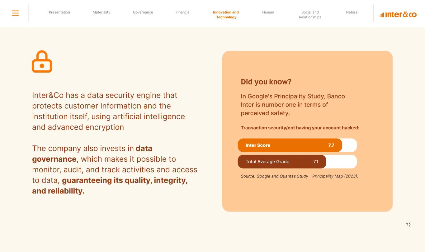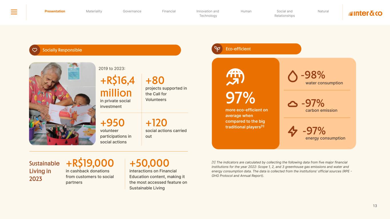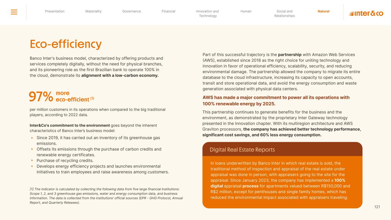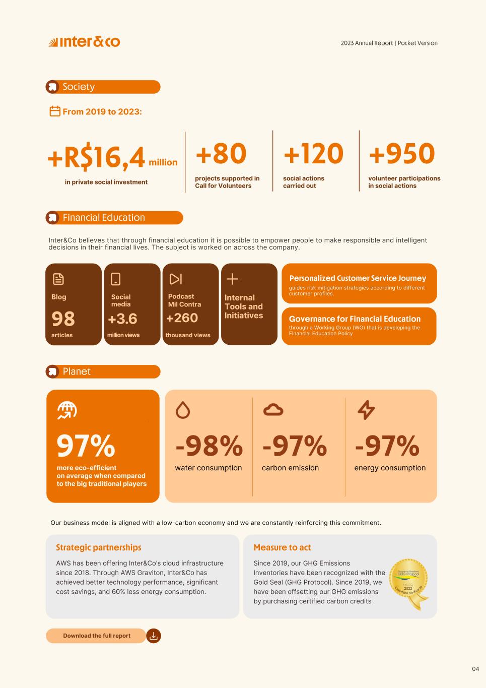 +R$16,4 in private social investment +80 projects supported in Call for Volunteers +120 social actions carried out +950 volunteer participations in social actions From 2019 to 2023: 98 articles Blog Podcast Mil Contra +260 thousand views +3.6 million views Social media Personalized Customer Service Journey Internal Tools and Initiatives Inter&Co believes that through financial education it is possible to empower people to make responsible and intelligent decisions in their financial lives. The subject is worked on across the company. through a Working Group (WG) that is developing the Financial Education Policy Governance for Financial Education + guides risk mitigation strategies according to different customer profiles. Financial Education Society 04 97% more eco-efficient on average when compared to the big traditional players energy consumption 97% -98% carbon emissionwater consumption -97% -97% Planet AWS has been offering Inter&Co's cloud infrastructure since 2018. Through AWS Graviton, Inter&Co has achieved better technology performance, significant cost savings, and 60% less energy consumption. Strategic partnerships Our business model is aligned with a low-carbon economy and we are constantly reinforcing this commitment. Since 2019, our GHG Emissions Inventories have been recognized with the Gold Seal (GHG Protocol). Since 2019, we have been offsetting our GHG emissions by purchasing certified carbon credits Measure to act 2023 Annual Report | Pocket Version million Download the full report