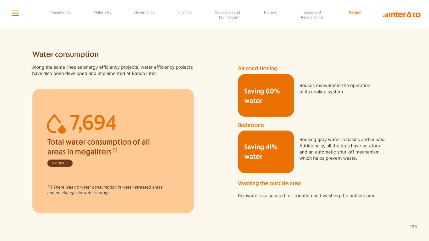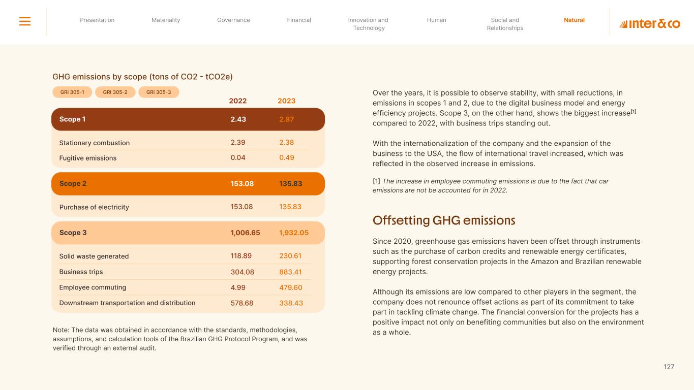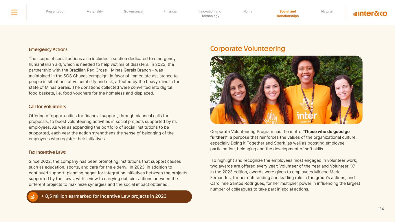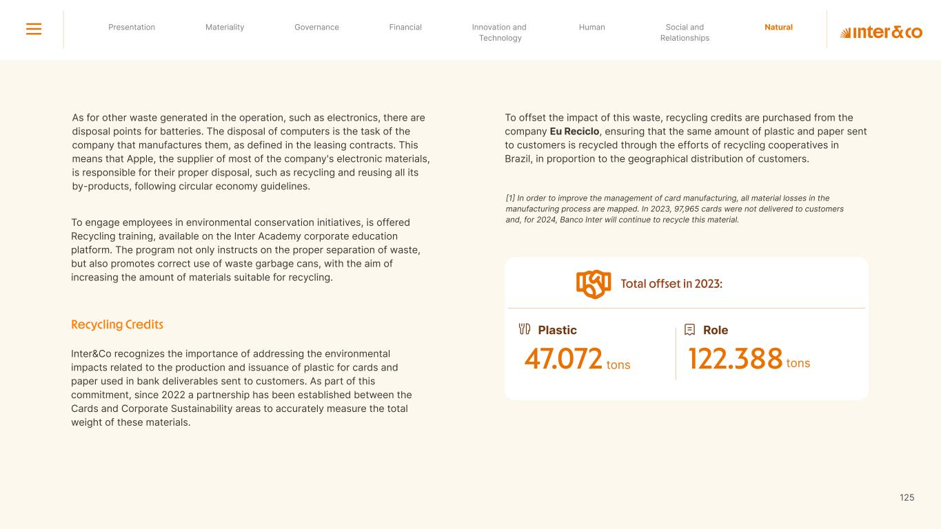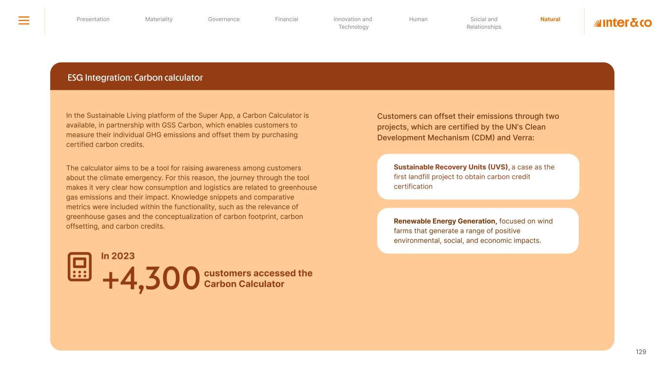 +R$16,4 in private social investment +80 projects supported in Call for Volunteers +120 social actions carried out +950 volunteer participations in social actions From 2019 to 2023: 98 articles Blog Podcast Mil Contra +260 thousand views +3.6 million views Social media Personalized Customer Service Journey Internal Tools and Initiatives Inter&Co believes that through financial education it is possible to empower people to make responsible and intelligent decisions in their financial lives. The subject is worked on across the company. through a Working Group (WG) that is developing the Financial Education Policy Governance for Financial Education + guides risk mitigation strategies according to different customer profiles. Financial Education Society 04 97% more eco-efficient on average when compared to the big traditional players energy consumption 97% -98% carbon emissionwater consumption -97% -97% Planet AWS has been offering Inter&Co's cloud infrastructure since 2018. Through AWS Graviton, Inter&Co has achieved better technology performance, significant cost savings, and 60% less energy consumption. Strategic partnerships Our business model is aligned with a low-carbon economy and we are constantly reinforcing this commitment. Since 2019, our GHG Emissions Inventories have been recognized with the Gold Seal (GHG Protocol). Since 2019, we have been offsetting our GHG emissions by purchasing certified carbon credits Measure to act 2023 Annual Report | Pocket Version million Download the full report