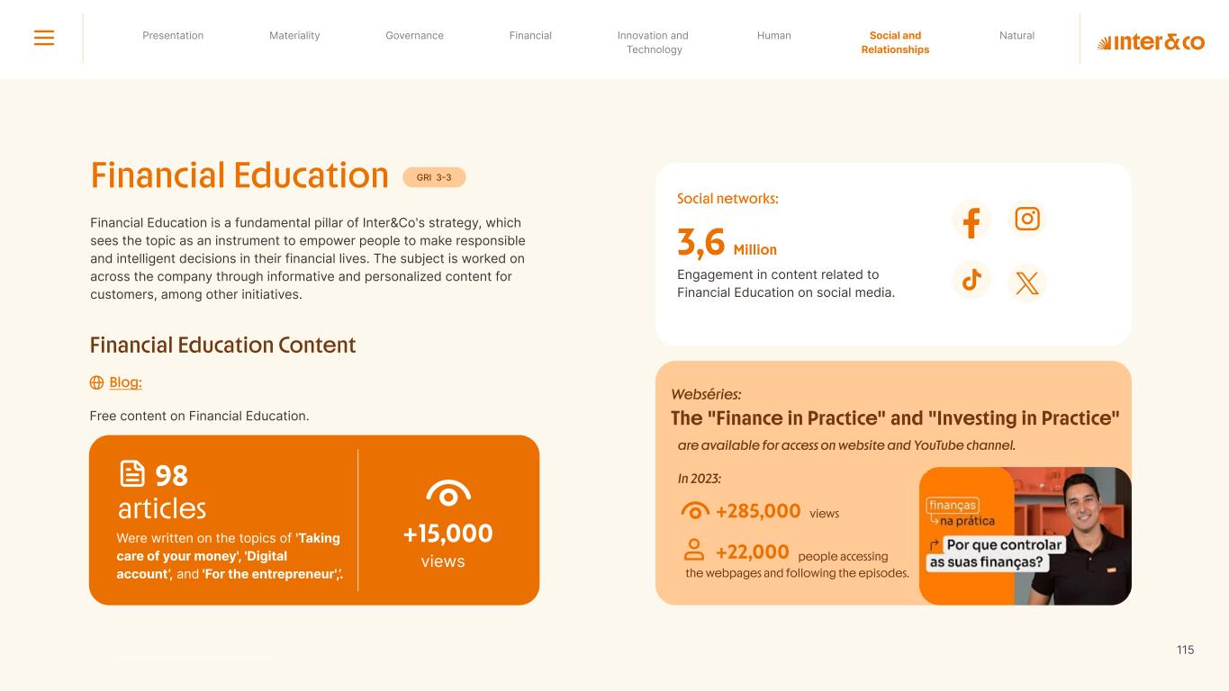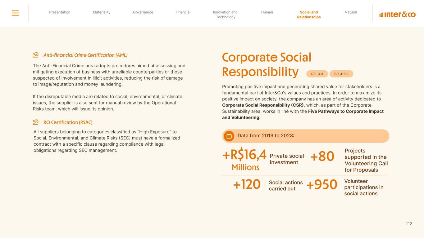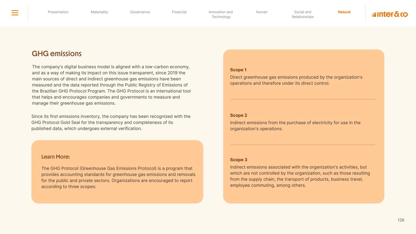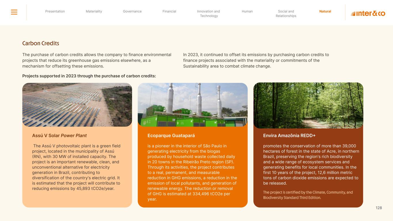 +R$16,4 in private social investment +80 projects supported in Call for Volunteers +120 social actions carried out +950 volunteer participations in social actions From 2019 to 2023: 98 articles Blog Podcast Mil Contra +260 thousand views +3.6 million views Social media Personalized Customer Service Journey Internal Tools and Initiatives Inter&Co believes that through financial education it is possible to empower people to make responsible and intelligent decisions in their financial lives. The subject is worked on across the company. through a Working Group (WG) that is developing the Financial Education Policy Governance for Financial Education + guides risk mitigation strategies according to different customer profiles. Financial Education Society 04 97% more eco-efficient on average when compared to the big traditional players energy consumption 97% -98% carbon emissionwater consumption -97% -97% Planet AWS has been offering Inter&Co's cloud infrastructure since 2018. Through AWS Graviton, Inter&Co has achieved better technology performance, significant cost savings, and 60% less energy consumption. Strategic partnerships Our business model is aligned with a low-carbon economy and we are constantly reinforcing this commitment. Since 2019, our GHG Emissions Inventories have been recognized with the Gold Seal (GHG Protocol). Since 2019, we have been offsetting our GHG emissions by purchasing certified carbon credits Measure to act 2023 Annual Report | Pocket Version million Download the full report