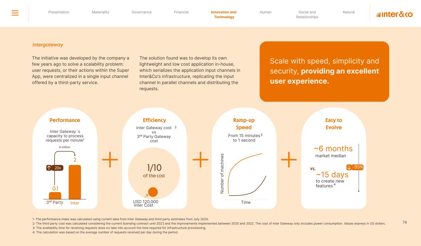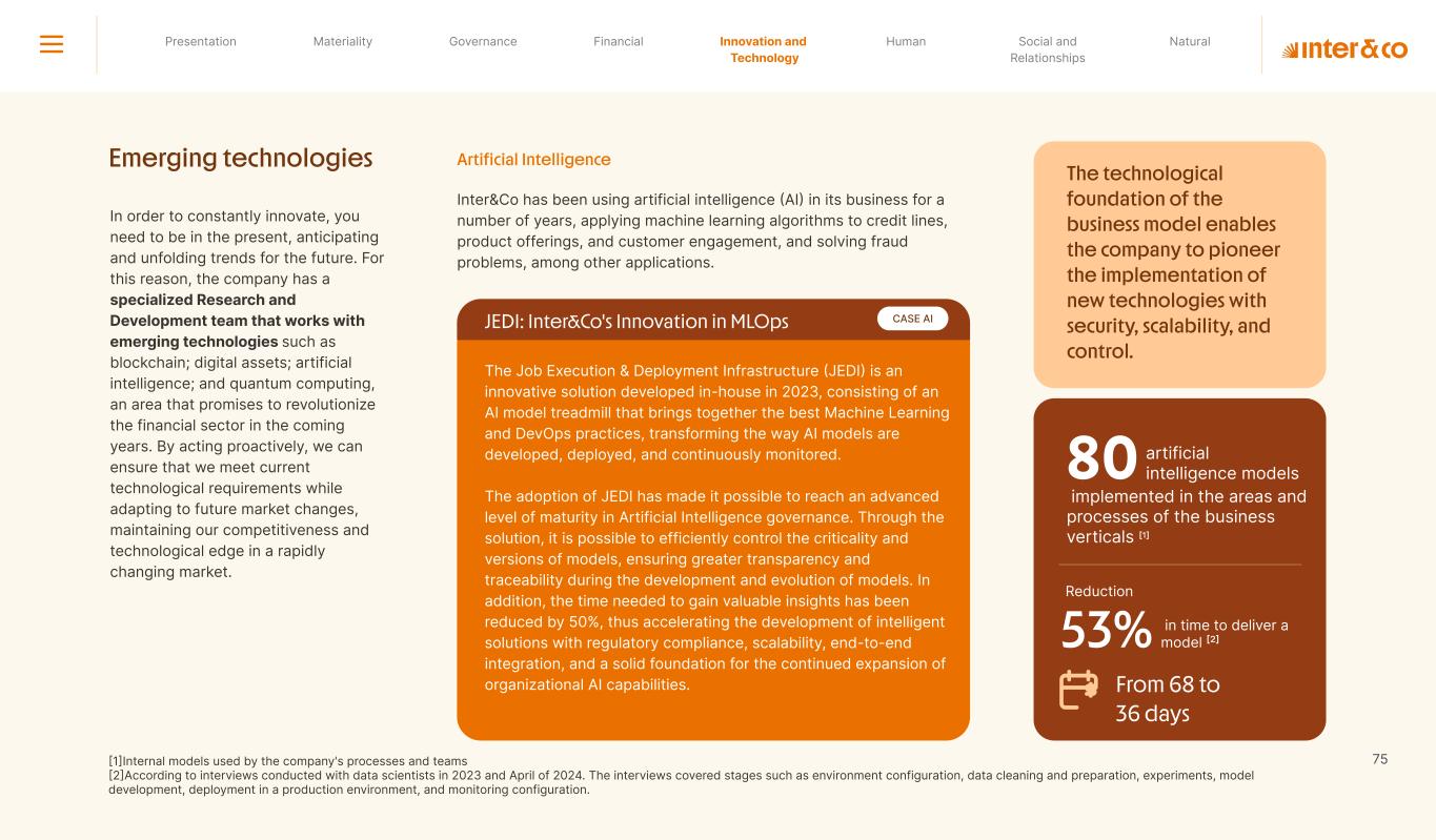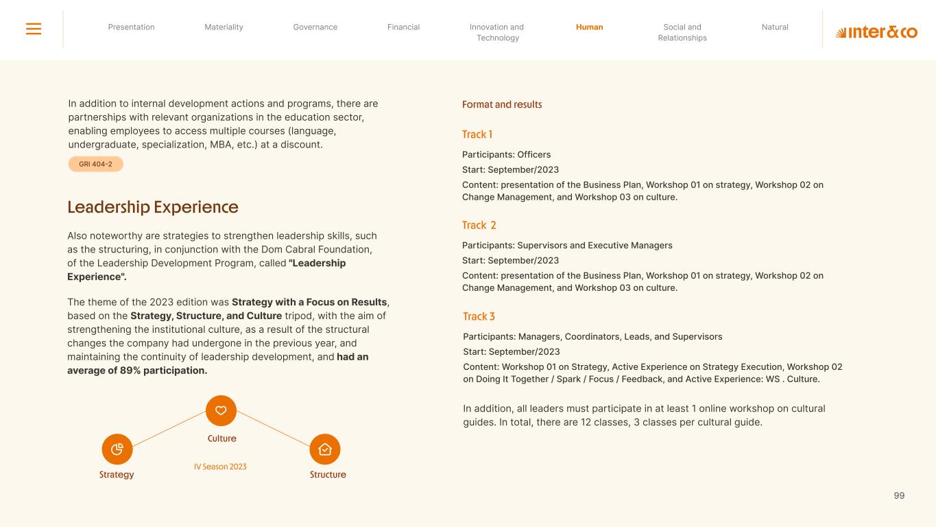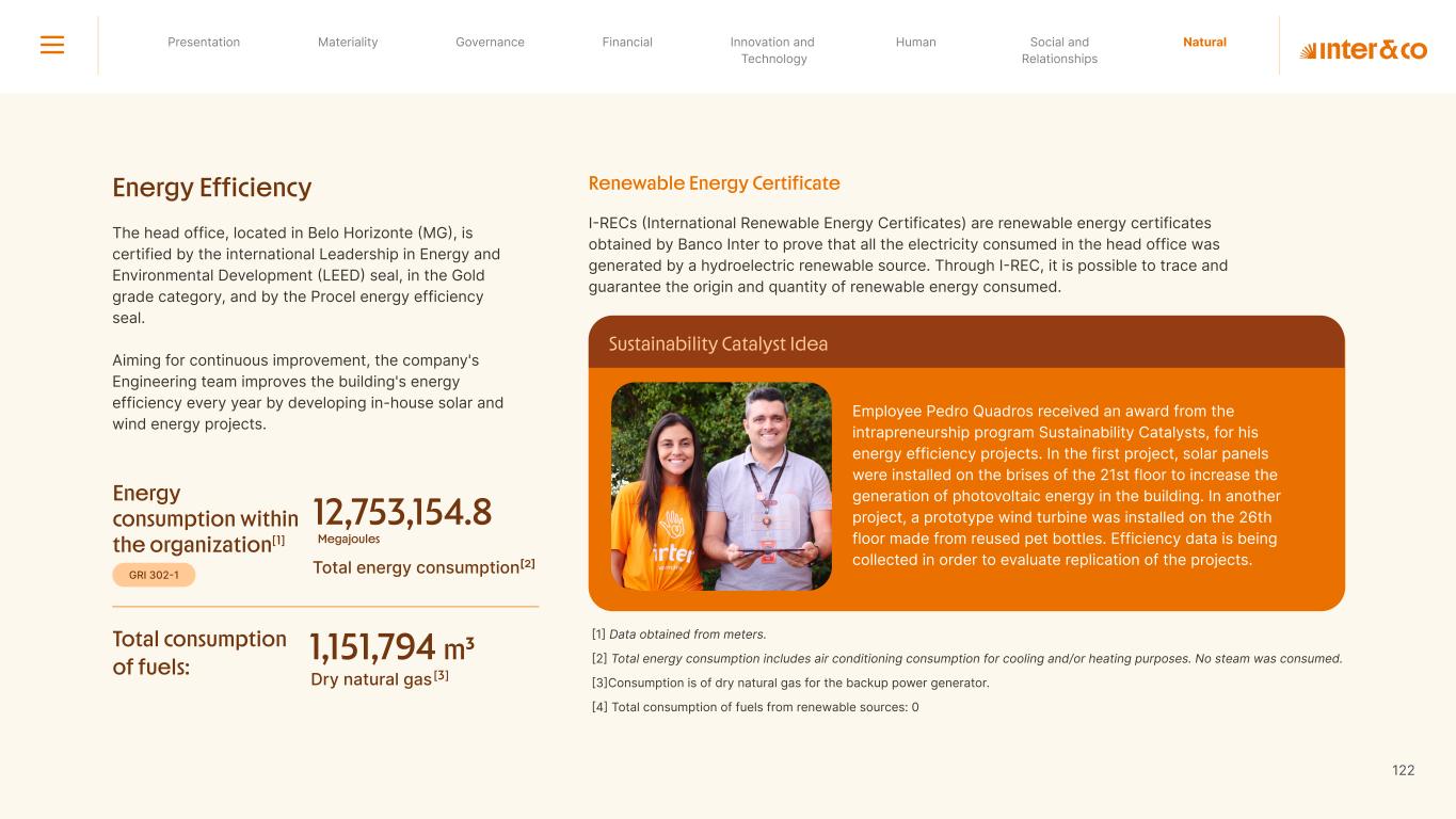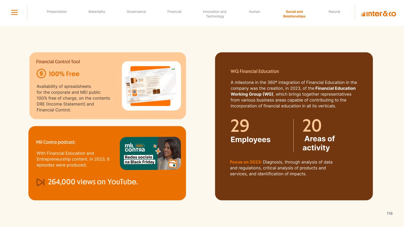 +R$16,4 in private social investment +80 projects supported in Call for Volunteers +120 social actions carried out +950 volunteer participations in social actions From 2019 to 2023: 98 articles Blog Podcast Mil Contra +260 thousand views +3.6 million views Social media Personalized Customer Service Journey Internal Tools and Initiatives Inter&Co believes that through financial education it is possible to empower people to make responsible and intelligent decisions in their financial lives. The subject is worked on across the company. through a Working Group (WG) that is developing the Financial Education Policy Governance for Financial Education + guides risk mitigation strategies according to different customer profiles. Financial Education Society 04 97% more eco-efficient on average when compared to the big traditional players energy consumption 97% -98% carbon emissionwater consumption -97% -97% Planet AWS has been offering Inter&Co's cloud infrastructure since 2018. Through AWS Graviton, Inter&Co has achieved better technology performance, significant cost savings, and 60% less energy consumption. Strategic partnerships Our business model is aligned with a low-carbon economy and we are constantly reinforcing this commitment. Since 2019, our GHG Emissions Inventories have been recognized with the Gold Seal (GHG Protocol). Since 2019, we have been offsetting our GHG emissions by purchasing certified carbon credits Measure to act 2023 Annual Report | Pocket Version million Download the full report