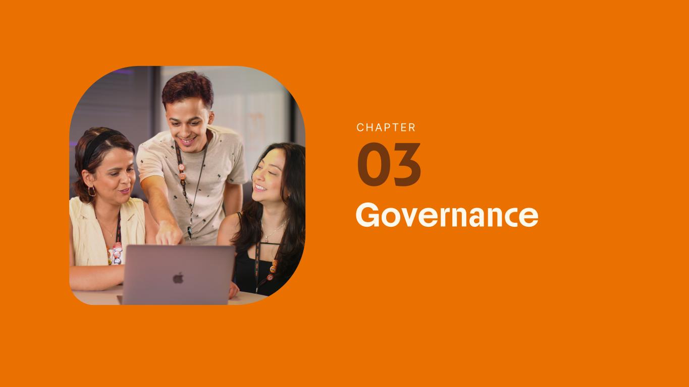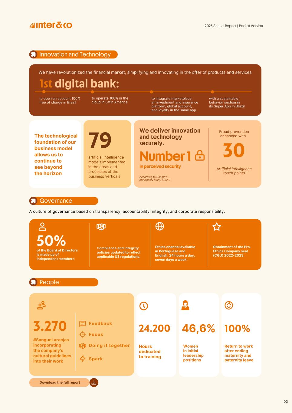 to open an account 100% free of charge in Brazil 1st digital bank: to integrate marketplace, an investment and insurance platform, global account, and loyalty in the same app 79 The technological foundation of our business model allows us to continue to see beyond the horizon We have revolutionized the financial market, simplifying and innovating in the offer of products and services to operate 100% in the cloud in Latin America 79 We deliver innovation and technology securely. According to Google's principality study (2023) Number 1 in perceived security 03 with a sustainable behavior section in its Super App in Brazil A culture of governance based on transparency, accountability, integrity, and corporate responsibility. of the Board of Directors is made up of independent members 50% Ethics channel available in Portuguese and English, 24 hours a day, seven days a week. Compliance and Integrity policies updated to reflect applicable US regulations. Obtainment of the Pro- Ethics Company seal (CGU) 2022-2023. Innovation and Technology Governance artificial intelligence models implemented in the areas and processes of the business verticals Fraud prevention enhanced with 30 Artificial Intelligence touch points 3.270 Feedback Focus Doing it together Spark #SangueLaranjas incorporating the company's cultural guidelines into their work People 24.200 100% Hours dedicated to training Women in initial leadership positions 46,6% Return to work after ending maternity and paternity leave 2023 Annual Report | Pocket Version Download the full report