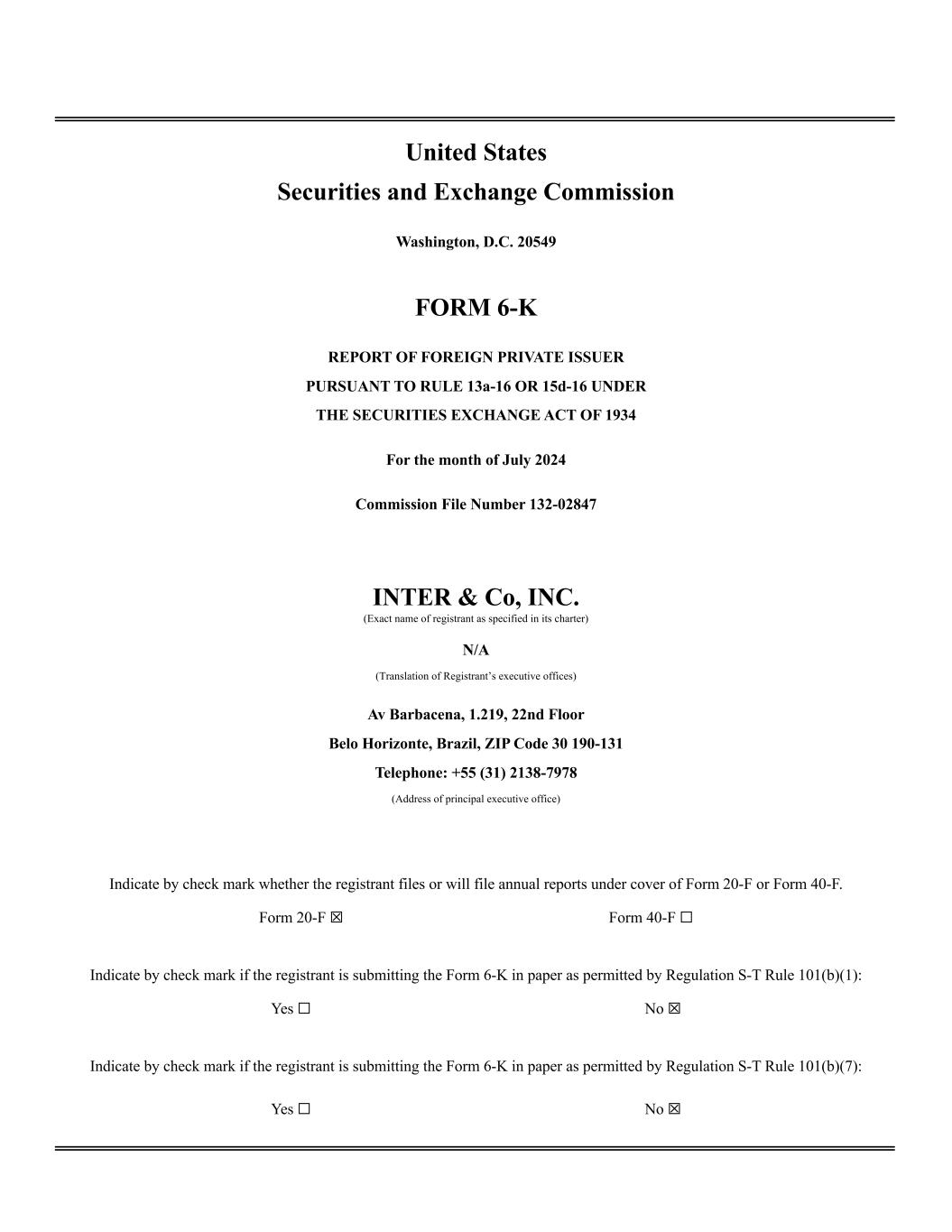 United States Securities and Exchange Commission Washington, D.C. 20549 FORM 6-K REPORT OF FOREIGN PRIVATE ISSUER PURSUANT TO RULE 13a-16 OR 15d-16 UNDER THE SECURITIES EXCHANGE ACT OF 1934 For the month of July 2024 Commission File Number 132-02847 INTER & Co, INC. (Exact name of registrant as specified in its charter) N/A (Translation of Registrant’s executive offices) Av Barbacena, 1.219, 22nd Floor Belo Horizonte, Brazil, ZIP Code 30 190-131 Telephone: +55 (31) 2138-7978 (Address of principal executive office) Indicate by check mark whether the registrant files or will file annual reports under cover of Form 20-F or Form 40-F. Form 20-F ☒ Form 40-F ☐ Indicate by check mark if the registrant is submitting the Form 6-K in paper as permitted by Regulation S-T Rule 101(b)(1): Yes ☐ No ☒ Indicate by check mark if the registrant is submitting the Form 6-K in paper as permitted by Regulation S-T Rule 101(b)(7): Yes ☐ No ☒