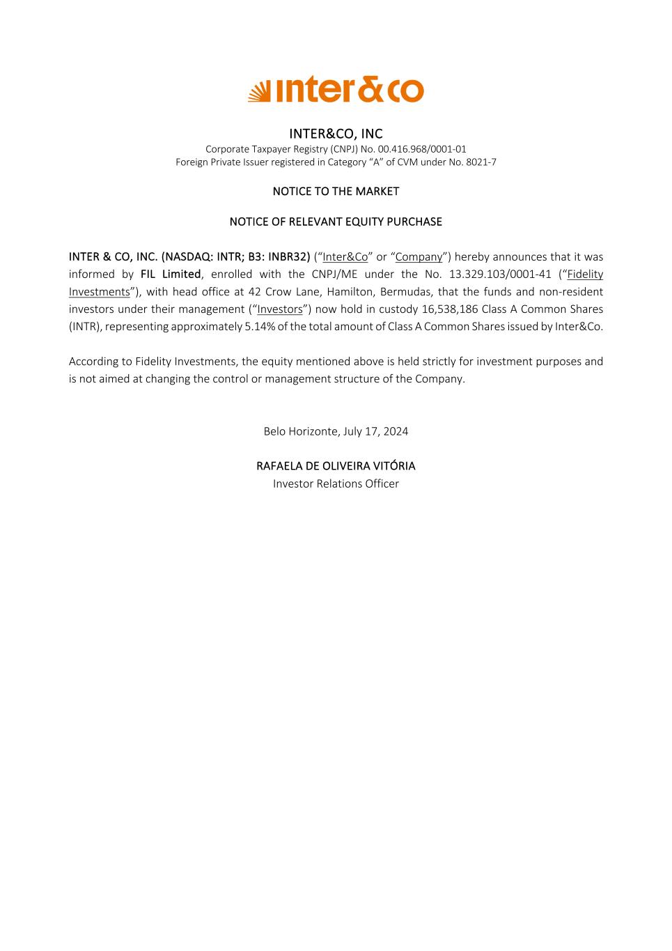 INTER&CO, INC Corporate Taxpayer Registry (CNPJ) No. 00.416.968/0001-01 Foreign Private Issuer registered in Category “A” of CVM under No. 8021-7 NOTICE TO THE MARKET NOTICE OF RELEVANT EQUITY PURCHASE INTER & CO, INC. (NASDAQ: INTR; B3: INBR32) (“Inter&Co” or “Company”) hereby announces that it was informed by FIL Limited, enrolled with the CNPJ/ME under the No. 13.329.103/0001-41 (“Fidelity Investments”), with head office at 42 Crow Lane, Hamilton, Bermudas, that the funds and non-resident investors under their management (“Investors”) now hold in custody 16,538,186 Class A Common Shares (INTR), representing approximately 5.14% of the total amount of Class A Common Shares issued by Inter&Co. According to Fidelity Investments, the equity mentioned above is held strictly for investment purposes and is not aimed at changing the control or management structure of the Company. Belo Horizonte, July 17, 2024 RAFAELA DE OLIVEIRA VITÓRIA Investor Relations Officer