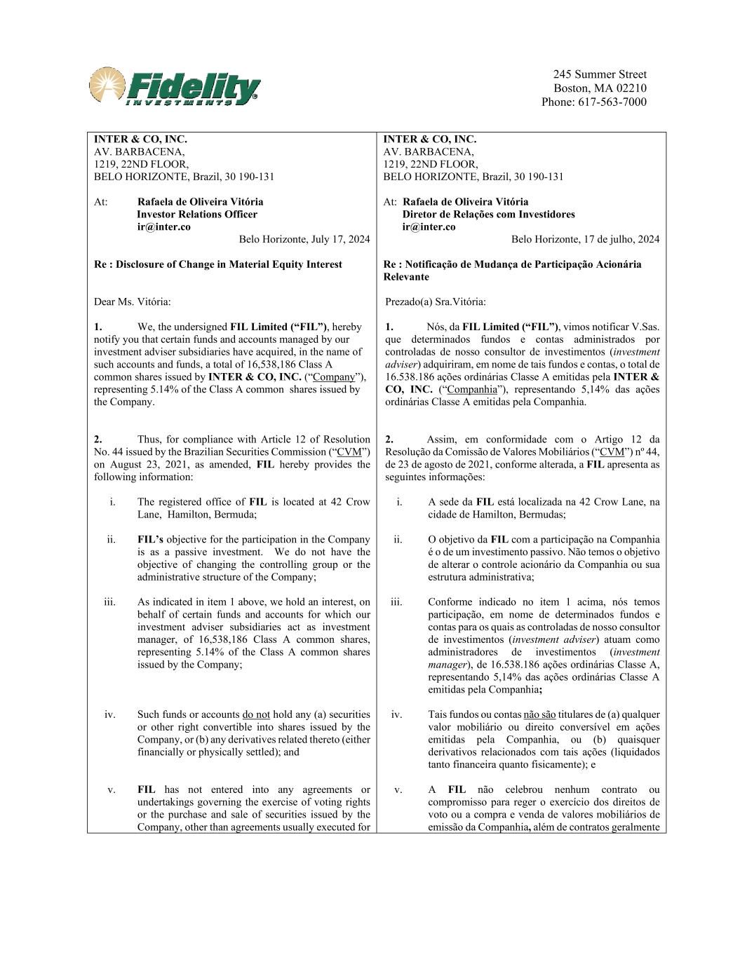 245 Summer Street Boston, MA 02210 Phone: 617-563-7000 INTER & CO, INC. AV. BARBACENA, 1219, 22ND FLOOR, BELO HORIZONTE, Brazil, 30 190-131 At: Rafaela de Oliveira Vitória Investor Relations Officer ir@inter.co Belo Horizonte, July 17, 2024 Re : Disclosure of Change in Material Equity Interest Dear Ms. Vitória: 1. We, the undersigned FIL Limited (“FIL”), hereby notify you that certain funds and accounts managed by our investment adviser subsidiaries have acquired, in the name of such accounts and funds, a total of 16,538,186 Class A common shares issued by INTER & CO, INC. (“Company”), representing 5.14% of the Class A common shares issued by the Company. 2. Thus, for compliance with Article 12 of Resolution No. 44 issued by the Brazilian Securities Commission (“CVM”) on August 23, 2021, as amended, FIL hereby provides the following information: i. The registered office of FIL is located at 42 Crow Lane, Hamilton, Bermuda; ii. FIL’s objective for the participation in the Company is as a passive investment. We do not have the objective of changing the controlling group or the administrative structure of the Company; iii. As indicated in item 1 above, we hold an interest, on behalf of certain funds and accounts for which our investment adviser subsidiaries act as investment manager, of 16,538,186 Class A common shares, representing 5.14% of the Class A common shares issued by the Company; iv. Such funds or accounts do not hold any (a) securities or other right convertible into shares issued by the Company, or (b) any derivatives related thereto (either financially or physically settled); and v. FIL has not entered into any agreements or undertakings governing the exercise of voting rights or the purchase and sale of securities issued by the Company, other than agreements usually executed for INTER & CO, INC. AV. BARBACENA, 1219, 22ND FLOOR, BELO HORIZONTE, Brazil, 30 190-131 At: Rafaela de Oliveira Vitória Diretor de Relações com Investidores ir@inter.co Belo Horizonte, 17 de julho, 2024 Re : Notificação de Mudança de Participação Acionária Relevante Prezado(a) Sra.Vitória: 1. Nós, da FIL Limited (“FIL”), vimos notificar V.Sas. que determinados fundos e contas administrados por controladas de nosso consultor de investimentos (investment adviser) adquiriram, em nome de tais fundos e contas, o total de 16.538.186 ações ordinárias Classe A emitidas pela INTER & CO, INC. (“Companhia”), representando 5,14% das ações ordinárias Classe A emitidas pela Companhia. 2. Assim, em conformidade com o Artigo 12 da Resolução da Comissão de Valores Mobiliários (“CVM”) nº 44, de 23 de agosto de 2021, conforme alterada, a FIL apresenta as seguintes informações: i. A sede da FIL está localizada na 42 Crow Lane, na cidade de Hamilton, Bermudas; ii. O objetivo da FIL com a participação na Companhia é o de um investimento passivo. Não temos o objetivo de alterar o controle acionário da Companhia ou sua estrutura administrativa; iii. Conforme indicado no item 1 acima, nós temos participação, em nome de determinados fundos e contas para os quais as controladas de nosso consultor de investimentos (investment adviser) atuam como administradores de investimentos (investment manager), de 16.538.186 ações ordinárias Classe A, representando 5,14% das ações ordinárias Classe A emitidas pela Companhia; iv. Tais fundos ou contas não são titulares de (a) qualquer valor mobiliário ou direito conversível em ações emitidas pela Companhia, ou (b) quaisquer derivativos relacionados com tais ações (liquidados tanto financeira quanto fisicamente); e v. A FIL não celebrou nenhum contrato ou compromisso para reger o exercício dos direitos de voto ou a compra e venda de valores mobiliários de emissão da Companhia, além de contratos geralmente