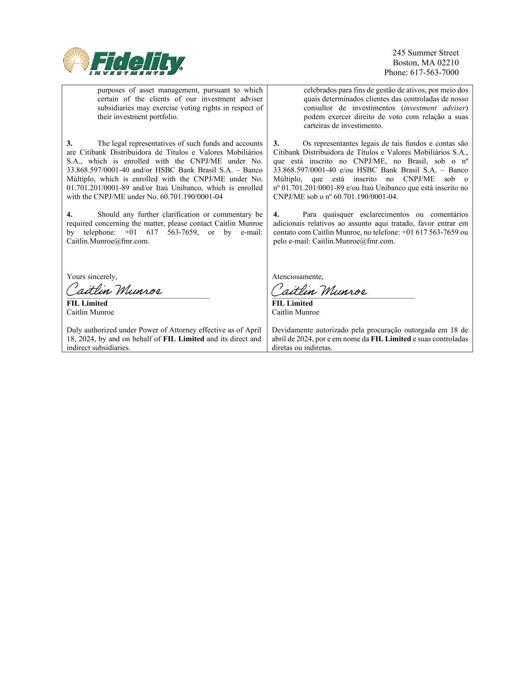 245 Summer Street Boston, MA 02210 Phone: 617-563-7000 purposes of asset management, pursuant to which certain of the clients of our investment adviser subsidiaries may exercise voting rights in respect of their investment portfolio. 3. The legal representatives of such funds and accounts are Citibank Distribuidora de Títulos e Valores Mobiliários S.A., which is enrolled with the CNPJ/ME under No. 33.868.597/0001-40 and/or HSBC Bank Brasil S.A. – Banco Múltiplo, which is enrolled with the CNPJ/ME under No. 01.701.201/0001-89 and/or Itaú Unibanco, which is enrolled with the CNPJ/ME under No. 60.701.190/0001-04 4. Should any further clarification or commentary be required concerning the matter, please contact Caitlin Munroe by telephone: +01 617 563-7659, or by e-mail: Caitlin.Munroe@fmr.com. Yours sincerely, _____________________________________ FIL Limited Caitlin Munroe Duly authorized under Power of Attorney effective as of April 18, 2024, by and on behalf of FIL Limited and its direct and indirect subsidiaries. celebrados para fins de gestão de ativos, por meio dos quais determinados clientes das controladas de nosso consultor de investimentos (investment adviser) podem exercer direito de voto com relação a suas carteiras de investimento. 3. Os representantes legais de tais fundos e contas são Citibank Distribuidora de Títulos e Valores Mobiliários S.A., que está inscrito no CNPJ/ME, no Brasil, sob o nº 33.868.597/0001-40 e/ou HSBC Bank Brasil S.A. – Banco Múltiplo, que está inscrito no CNPJ/ME sob o nº 01.701.201/0001-89 e/ou Itaú Unibanco que está inscrito no CNPJ/ME sob o nº 60.701.190/0001-04. 4. Para quaisquer esclarecimentos ou comentários adicionais relativos ao assunto aqui tratado, favor entrar em contato com Caitlin Munroe, no telefone: +01 617 563-7659 ou pelo e-mail: Caitlin.Munroe@fmr.com. Atenciosamente, _____________________________________ FIL Limited Caitlin Munroe Devidamente autorizado pela procuração outorgada em 18 de abril de 2024, por e em nome da FIL Limited e suas controladas diretas ou indiretas.