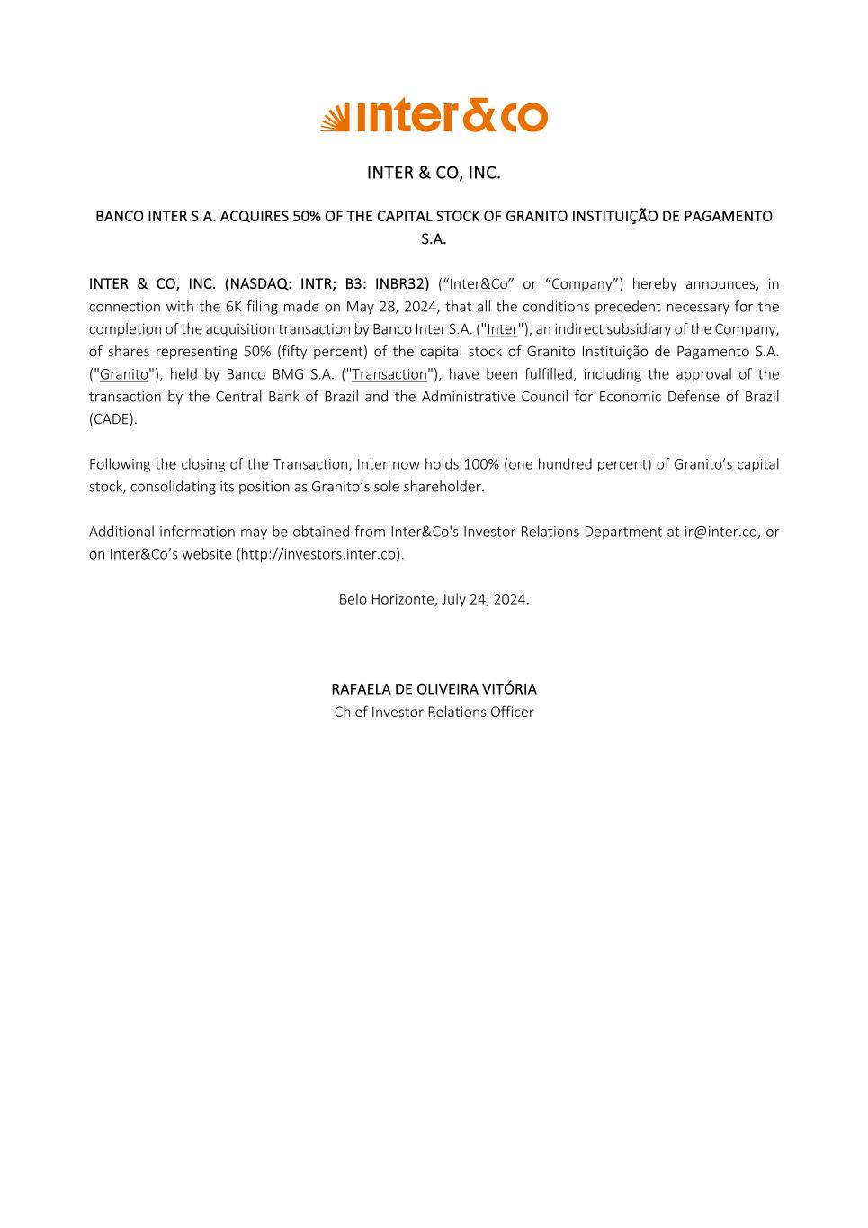 INTER & CO, INC. BANCO INTER S.A. ACQUIRES 50% OF THE CAPITAL STOCK OF GRANITO INSTITUIÇÃO DE PAGAMENTO S.A. INTER & CO, INC. (NASDAQ: INTR; B3: INBR32) (“Inter&Co” or “Company”) hereby announces, in connection with the 6K filing made on May 28, 2024, that all the conditions precedent necessary for the completion of the acquisition transaction by Banco Inter S.A. ("Inter"), an indirect subsidiary of the Company, of shares representing 50% (fifty percent) of the capital stock of Granito Instituição de Pagamento S.A. ("Granito"), held by Banco BMG S.A. ("Transaction"), have been fulfilled, including the approval of the transaction by the Central Bank of Brazil and the Administrative Council for Economic Defense of Brazil (CADE). Following the closing of the Transaction, Inter now holds 100% (one hundred percent) of Granito’s capital stock, consolidating its position as Granito’s sole shareholder. Additional information may be obtained from Inter&Co's Investor Relations Department at ir@inter.co, or on Inter&Co’s website (http://investors.inter.co). Belo Horizonte, July 24, 2024. RAFAELA DE OLIVEIRA VITÓRIA Chief Investor Relations Officer