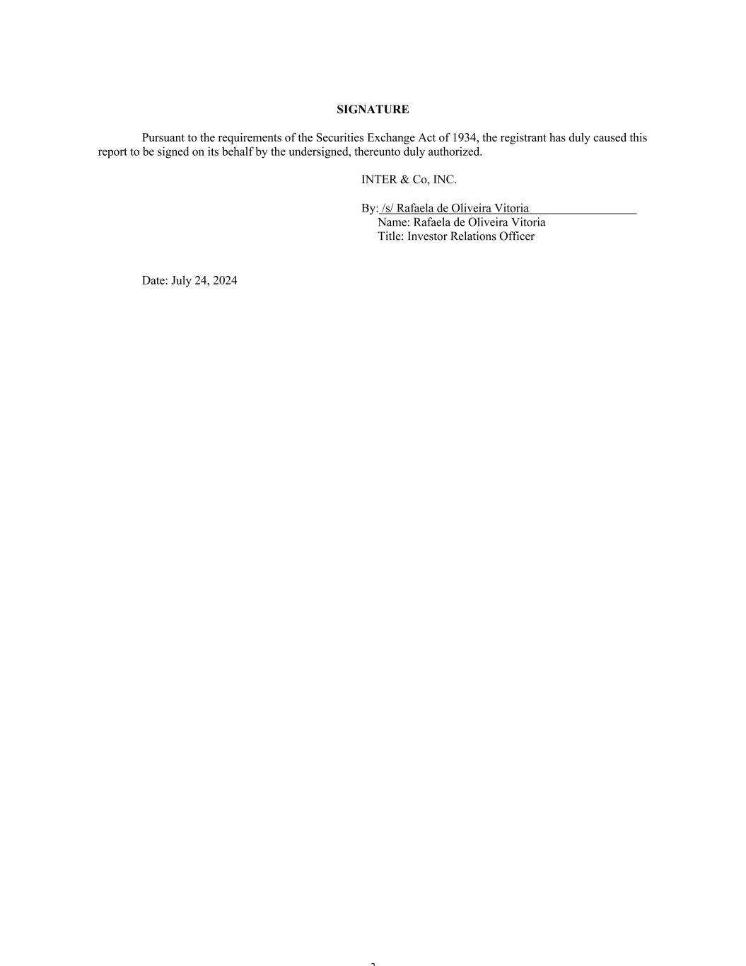 2 SIGNATURE Pursuant to the requirements of the Securities Exchange Act of 1934, the registrant has duly caused this report to be signed on its behalf by the undersigned, thereunto duly authorized. INTER & Co, INC. By: /s/ Rafaela de Oliveira Vitoria Name: Rafaela de Oliveira Vitoria Title: Investor Relations Officer Date: July 24, 2024
