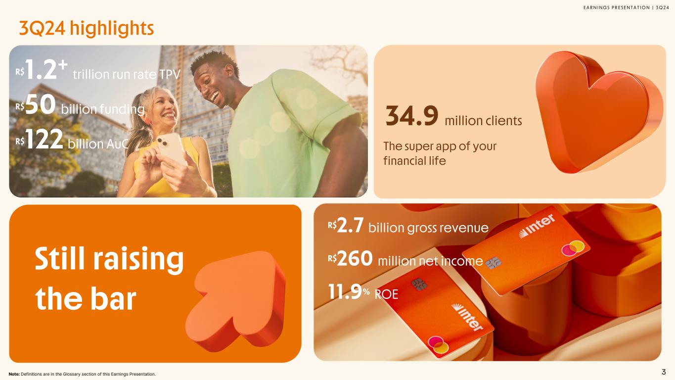 E A R N I N G S P R E S E N T A T I O N | 3 Q 2 4 Disclaimer This report may contain forward-looking statements regarding Inter, anticipated synergies, growth plans, projected results and future strategies. While these forward-looking statements reflect our Management’s good faith beliefs, they involve known and unknown risks and uncertainties that could cause the company’s results or accrued results to differ materially from those anticipated and discussed herein. These statements are not guarantees of future performance. These risks and uncertainties include, but are not limited to, our ability to realize the amount of projected synergies and the projected schedule, in addition to economic, competitive, governmental and technological factors affecting Inter, the markets, products and prices and other factors. In addition, this presentation contains managerial numbers that may differ from those presented in our financial statements. The calculation methodology for these managerial numbers is presented in Inter’s quarterly earnings release. Statements contained in this report that are not fact or historical information may be forward-looking statements under the terms of the Private Securities Litigation Reform Act of 1995. These forward- looking statements may, among other things, beliefs related to the creation of value and any other statements regarding Inter. In some cases, terms such as “estimate”, “project”, “predict”, “plan”, “believe”, “can”, “expectation”, “anticipate”, “intend”, “aimed”, “potential”, “may”, “will/shall” and similar terms, or the negative of these expressions, may identify forward looking statements. These forward-looking statements are based on Inter's expectations and beliefs about future events and involve risks and uncertainties that could cause actual results to differ materially from current ones. Any forward-looking statement made by us in this document is based only on information currently available to us and speaks only as of the date on which it is made. We undertake no obligation to publicly update any forward-looking statement, whether written or oral, that may be made from time to time, whether as a result of new information, future developments or otherwise. For additional information that about factors that may lead to results that are different from our estimates, please refer to sections “Cautionary Statement Concerning Forward-Looking Statements” and “Risk Factors” of Inter&Co Annual Report on Form 20-F. The numbers for our key metrics (Unit Economics), which include active users, as average revenue per active client (ARPAC), cost to serve (CTS), are calculated using Inter’s internal data. Although we believe these metrics are based on reasonable estimates, there are challenges inherent in measuring the use of our business. In addition, we continually seek to improve our estimates, which may change due to improvements or changes in methodology, in processes for calculating these metrics and, from time to time, we may discover inaccuracies and make adjustments to improve accuracy, including adjustments that may result in recalculating our historical metrics. About Non-IFRS Financial Measures To supplement the financial measures presented in this press release and related conference call, presentation, or webcast in accordance with IFRS, Inter&Co also presents non-IFRS measures of financial performance, as highlighted throughout the documents. The non-IFRS Financial Measures include, among others: Adjusted Net Income, Cost to Serve, Cost of Funding, Efficiency Ratio, Underwriting, NPL > 90 days, NPL 15 to 90 days, NPL and Stage 3 Formation, Cost of Risk, Coverage Ratio, Funding, All-in Cost of Funding, Gross Merchandise Volume (GMV), Premium, Net Inflows, Global Services Deposits and Investments, Fee Income Ratio, Client Acquisition Cost, Cards+PIX TPV, Gross ARPAC, Net ARPAC, Marginal NIM 1.0, Marginal NIM 2.0, Net Interest Margin IEP + Non-int. CC Receivables (1.0), Net Interest Margin IEP (2.0), Cost-to-Serve, Risk-Adjusted Net Interest Margin IEP + Non-int. CC Receivables (1.0), Risk Adjusted Net Interest Margin IEP (2.0), Risk Adjusted Efficiency Ratio. A “non-IFRS financial measure” refers to a numerical measure of Inter&Co’s historical or financial position that either excludes or includes amounts that are not normally excluded or included in the most directly comparable measure calculated and presented in accordance with IFRS in Inter&Co’s financial statements. Inter&Co provides certain non-IFRS measures as additional information relating to its operating results as a complement to results provided in accordance with IFRS. The non-IFRS financial information presented herein should be considered together with, and not as a substitute for or superior to, the financial information presented in accordance with IFRS. There are significant limitations associated with the use of non-IFRS financial measures. Further, these measures may differ from the non-IFRS information, even where similarly titled, used by other companies and therefore should not be used to compare Inter&Co’s performance to that of other companies. 2