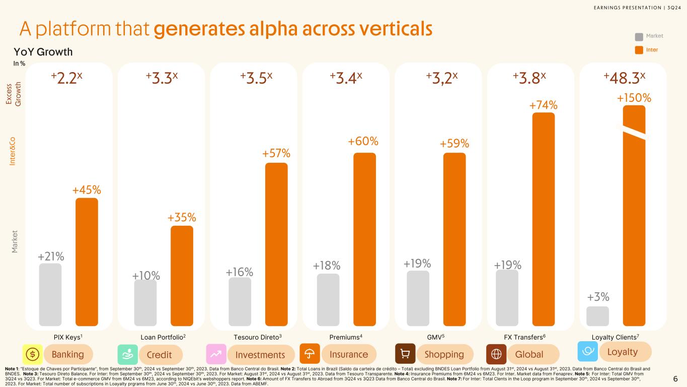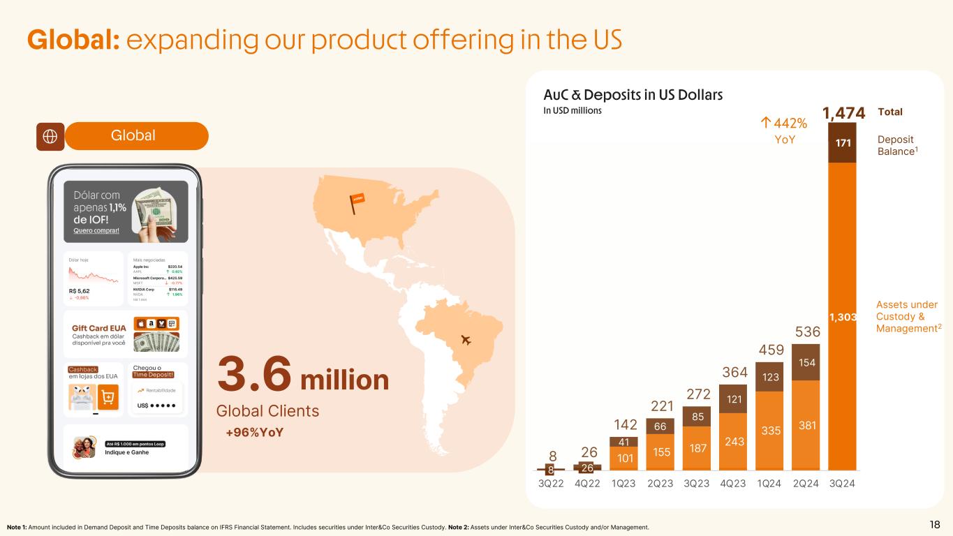 AuC & Deposits in US Dollars In USD millions Assets under Custody & Management2 Deposit Balance1 Total Global: expanding our product offering in the US million Global Clients 18 Global - - 101 155 187 243 335 381 1,303 8 26 41 66 85 121 123 154 171 8 26 142 221 272 364 459 536 1,474 - 2 0 .0 4 0 .0 6 0 .0 8 0 .0 1 ,0 0. 0 1 ,20 0. 0 1 ,40 0. 0 1 ,60 0. 0 3Q22 4Q22 1Q23 2Q23 3Q23 4Q23 1Q24 2Q24 3Q24 ↑ YoY 442% 3.6 +96%YoY Note 1: Amount included in Demand Deposit and Time Deposits balance on IFRS Financial Statement. Includes securities under Inter&Co Securities Custody. Note 2: Assets under Inter&Co Securities Custody and/or Management.