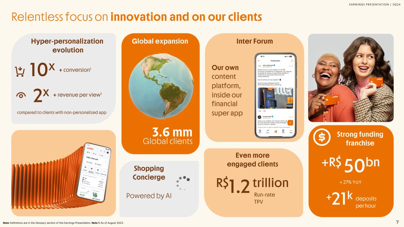 E A R N I N G S P R E S E N T A T I O N | 3 Q 2 4 A platform that generates alpha across verticals Ex ce ss G ro w th In te r& Co M ar ke t +2.2x +3.3x +3.5x +3.4x +3,2x +3.8x +48.3x +45% +35% +57% +60% +59% +74% +150% +21% +10% +16% +18% +19% +19% +3% YoY Growth In % 6 Note 1: “Estoque de Chaves por Participante”, from September 30th, 2024 vs September 30th, 2023. Data from Banco Central do Brasil. Note 2: Total Loans in Brazil (Saldo da carteira de crédito – Total) excluding BNDES Loan Portfolio from August 31st, 2024 vs August 31st, 2023. Data from Banco Central do Brasil and BNDES. Note 3: Tesouro Direto Balance. For Inter: from September 30th, 2024 vs September 30th, 2023. For Market: August 31st, 2024 vs August 31st, 2023. Data from Tesouro Transparente. Note 4: Insurance Premiums from 6M24 vs 6M23. For Inter. Market data from Fenaprev. Note 5: For Inter: Total GMV from 3Q24 vs 3Q23. For Market: Total e-commerce GMV from 6M24 vs 6M23, according to NIQEbit’s webshoppers report. Note 6: Amount of FX Transfers to Abroad from 3Q24 vs 3Q23 Data from Banco Central do Brasil. Note 7: For Inter: Total Clents in the Loop program in September 30th, 2024 vs September 30th, 2023. For Market: Total number of subscriptions in Loayalty prgrams from June 30th, 2024 vs June 30th, 2023. Data from ABEMF. Banking PIX Keys1 Loan Portfolio2 Tesouro Direto3 Insurance Premiums4 Shopping GMV5 Global FX Transfers6 Loyalty Loyalty Clients7 Credit Investments Inter Market