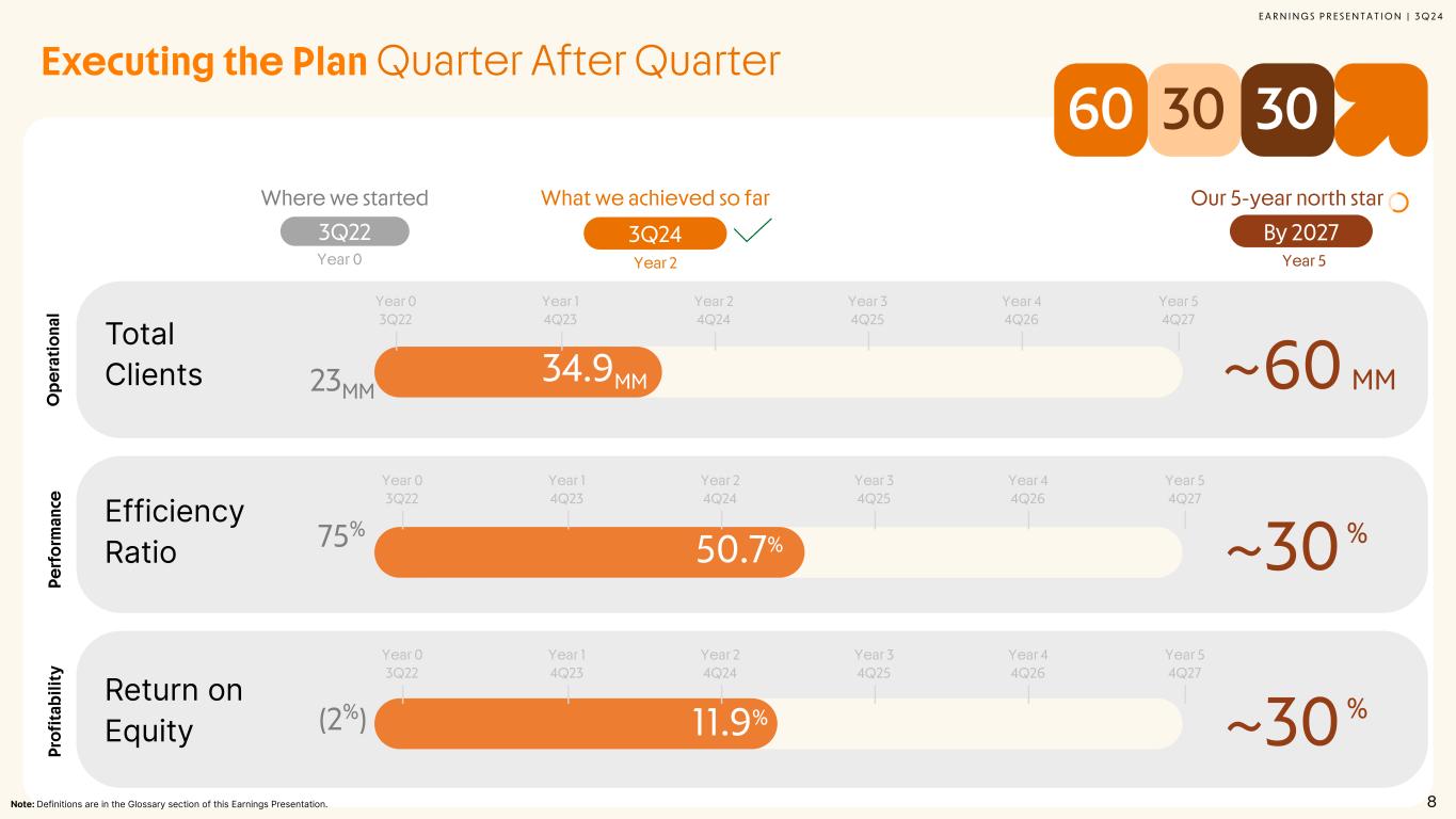 E A R N I N G S P R E S E N T A T I O N | 3 Q 2 4 Total Clients What we achieved so far 3Q24 Our 5-year north star By 2027 8 Where we started 3Q22 Year 0 Year 2 Year 5 23MMO pe ra tio na l 34.9MM Efficiency Ratio 75% Pe rf or m an ce Return on Equity (2%) Pr ofi ta bi lit y 50.7% 11.9% Year 1 4Q23 Year 2 4Q24 Year 3 4Q25 Year 4 4Q26 Year 0 3Q22 Year 5 4Q27 ~30% ~60 MM Year 1 4Q23 Year 2 4Q24 Year 3 4Q25 Year 4 4Q26 Year 0 3Q22 Year 5 4Q27 Year 1 4Q23 Year 2 4Q24 Year 3 4Q25 Year 4 4Q26 Year 0 3Q22 Year 5 4Q27 ~30% Executing the Plan Quarter After Quarter Note: Definitions are in the Glossary section of this Earnings Presentation.