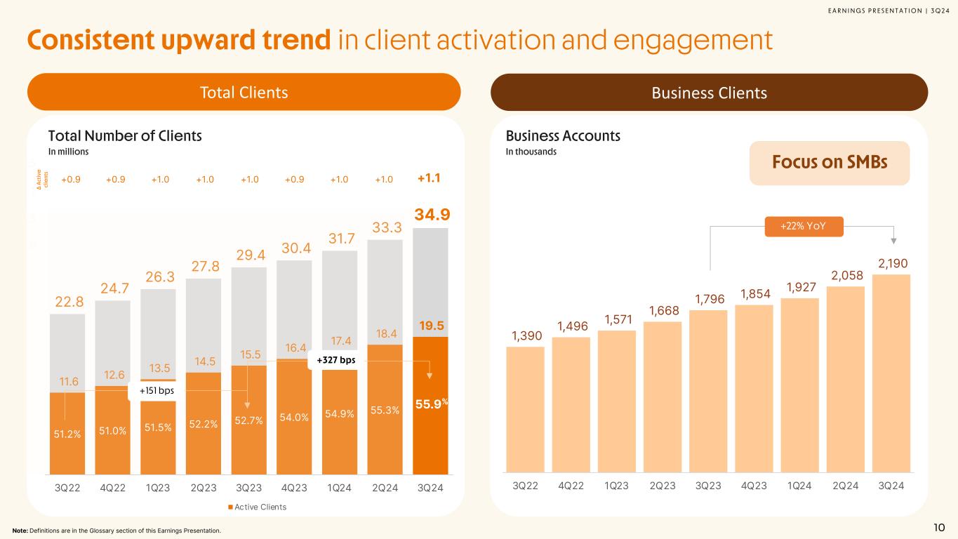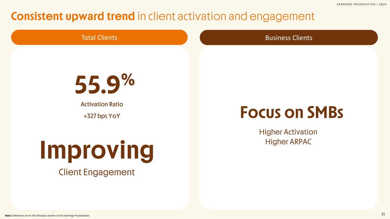 E A R N I N G S P R E S E N T A T I O N | 3 Q 2 4 +22% YoY 10 Total Clients 51.2% 51.0% 51.5% 52.2% 52.7% 54.0% 54.9% 55.3% 11.6 12.6 13.5 14.5 15.5 16.4 17.4 18.4 19.5 22.8 24.7 26.3 27.8 29.4 30.4 31.7 33.3 34.9 - 5 .0 1 0. 1 5.0 2 0. 2 5.0 3 0. 3 5.0 3Q22 4Q22 1Q23 2Q23 3Q23 4Q23 1Q24 2Q24 3Q24 Active Clients +0.9 +0.9 +1.0 +1.0 +1.0 +0.9 +1.0 +1.0 +1.1 0 0.5 1 1.5 Δ Ac tiv e cl ie nt s +151 bps +327 bps Total Number of Clients In millions Business Clients Business Accounts In thousands 1,390 1,496 1,571 1,668 1,796 1,854 1,927 2,058 2,190 1 5 0 1 1 ,0 01 1 ,5 01 2 ,0 0 1 2 ,5 01 3Q22 4Q22 1Q23 2Q23 3Q23 4Q23 1Q24 2Q24 3Q24 55.9% Focus on SMBs Consistent upward trend in client activation and engagement Note: Definitions are in the Glossary section of this Earnings Presentation.