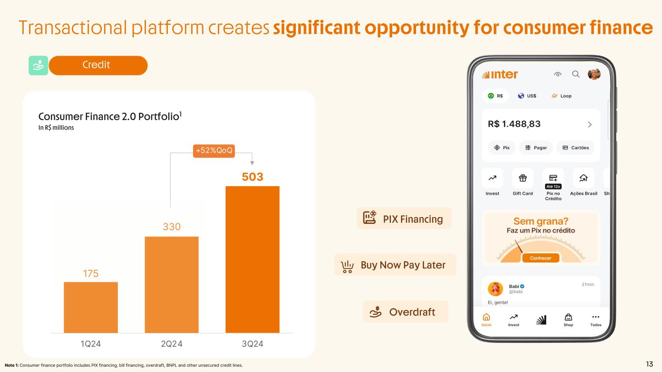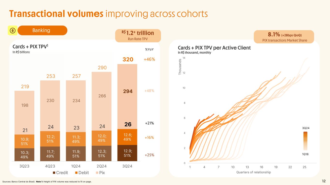 Cards + PIX TPV per Active Client In R$ thousand, monthly Cards + PIX TPV1 In R$ billions Sources: Banco Central do Brasil. Note 1: Height of PIX volume was reduced to fit on page. 12 Banking %YoY +46% +48% +21% +16% +25%10.3; 49% 11.7; 49% 11.9; 51% 12.3; 51% 12.9; 51% 10.9; 51% 12.2; 51% 11.3; 49% 12.0; 49% 12.6; 49% 21 24 23 24 26 198 230 234 266 294 219 253 257 290 320 - 1 0. 0 2 0 .0 3 0 .0 4 0 .0 5 0 .0 6 0 .0 7 0 .0 8 0 .0 3Q23 4Q23 1Q24 2Q24 3Q24 Credit Debit Pix Quarters of relationship 0 2 4 6 8 10 12 14 1 4 7 10 13 16 19 22 25 Th ou sa nd s 3Q24 1Q18 8.1% (+28bps QoQ) PIX transactions Market Share Transactional volumes improving across cohorts R$ 1.2+ trillion Run Rate TPV