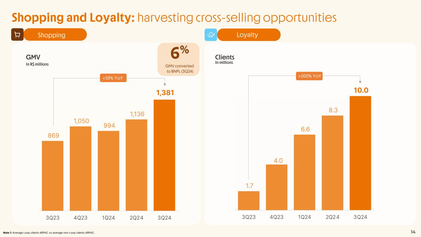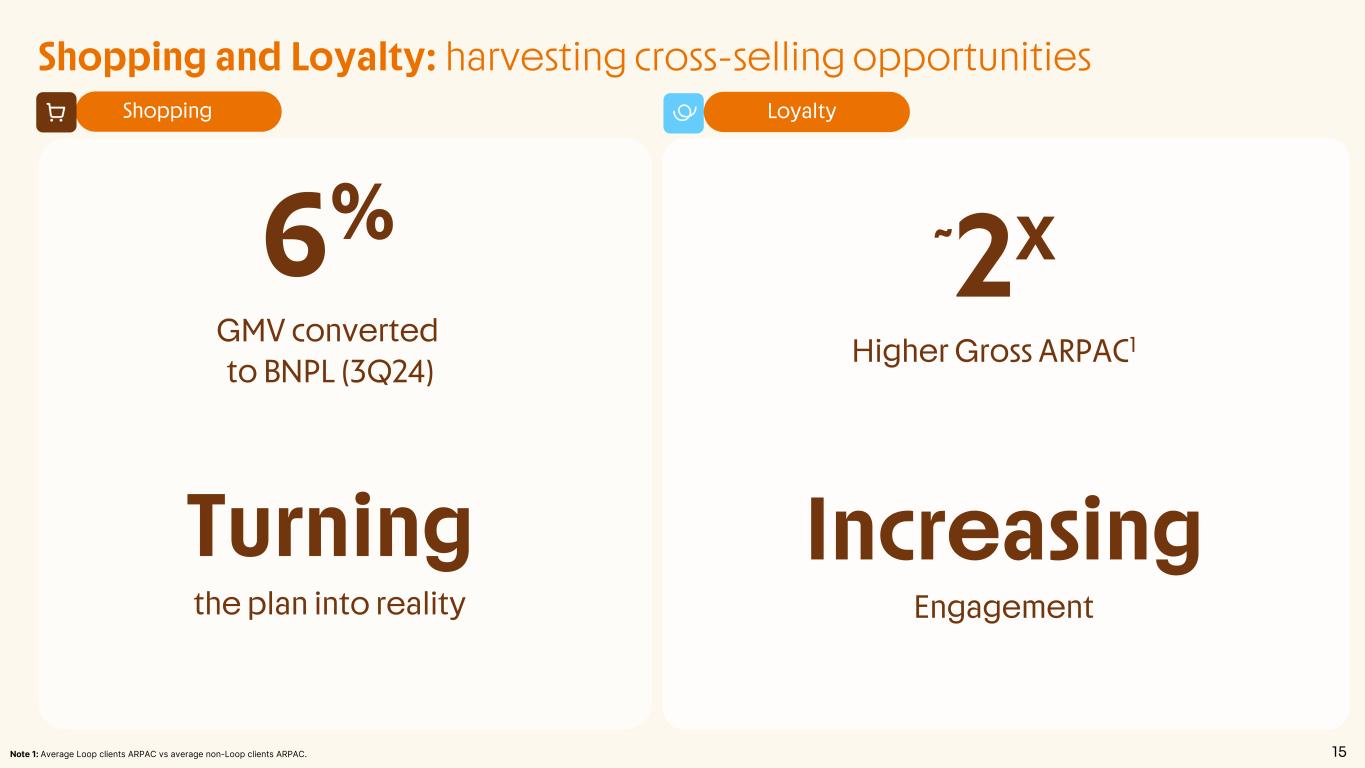 Shopping Note 1: Average Loop clients ARPAC vs average non-Loop clients ARPAC. GMV In R$ millions 869 1,050 994 1,136 1,381 3Q23 4Q23 1Q24 2Q24 3Q24 6% GMV converted to BNPL (3Q24) Shopping and Loyalty: harvesting cross-selling opportunities +59% YoY Loyalty Clients In millions 1.7 4.0 6.6 8.3 10.0 0 .0 2 .0 4 .0 6 .0 8 .0 10 .0 12 .0 3Q23 4Q23 1Q24 2Q24 3Q24 +500% YoY 14