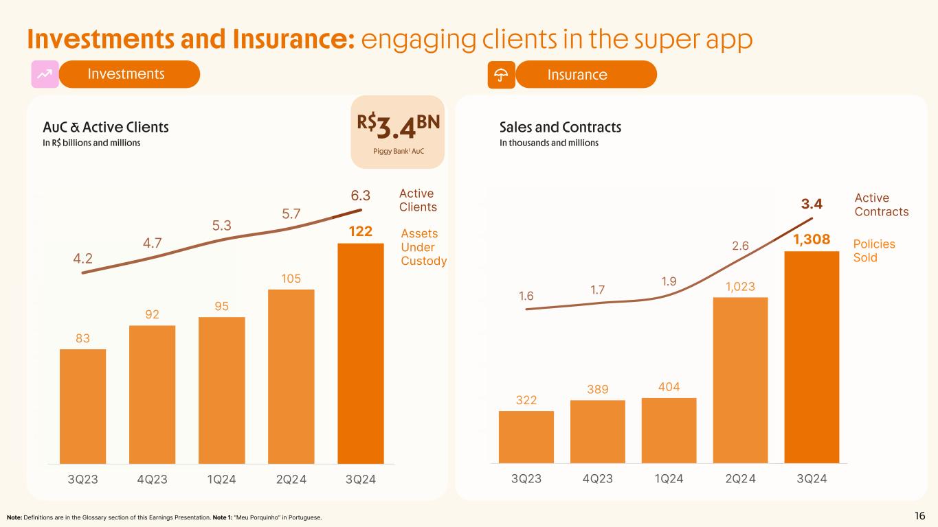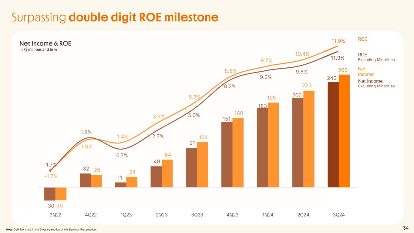 Net Income & ROE In R$ millions and in % Net Income ROE Surpassing double digit ROE milestone 34 -30 32 11 49 91 151 183 206 243 -30 29 24 64 104 160 195 223 260 -50 - 50 100 150 200 250 300 3Q22 4Q22 1Q23 2Q23 3Q23 4Q23 1Q24 2Q24 3Q24 Net Income Excluding Minorities -1.7% 1.6% 1.4% 3.6% 5.7% 8.5% 9.7% 10.4% 11.9% -1.7% 1.8% 0.7% 2.7% 5.0% 8.2% 9.2% 9.8% 11.3% ROE Excluding Minorities Note: Definitions are in the Glossary section of this Earnings Presentation.