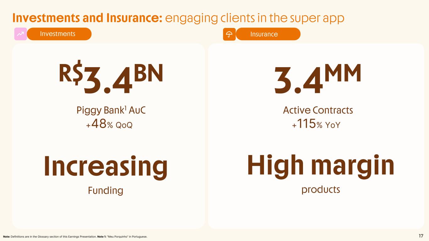 16 Insurance Policies Sold Investments Active Contracts Assets Under Custody Active Clients 322 389 404 1,023 1,308 1.6 1.7 1.9 2.6 3.4 - 1.5 - 0. 5 0 .5 1. 5 2 .5 3 .5 - 200 400 600 800 1,000 1,200 1,400 1,600 3Q23 4Q23 1Q24 2Q24 3Q24 Sales and Contracts In thousands and millions AuC & Active Clients In R$ billions and millions R$3.4BN Piggy Bank1 AuC 83 92 95 105 122 4.2 4.7 5.3 5.7 6.3 40. 0 50.0 60.0 70.0 80.0 90.0 100.0 110.0 120.0 130.0 140.0 3Q23 4Q23 1Q24 2Q24 3Q24 Investments and Insurance: engaging clients in the super app Note: Definitions are in the Glossary section of this Earnings Presentation. Note 1: “Meu Porquinho” in Portuguese.