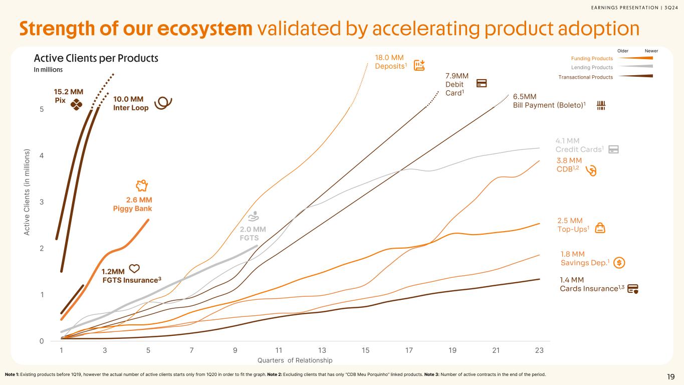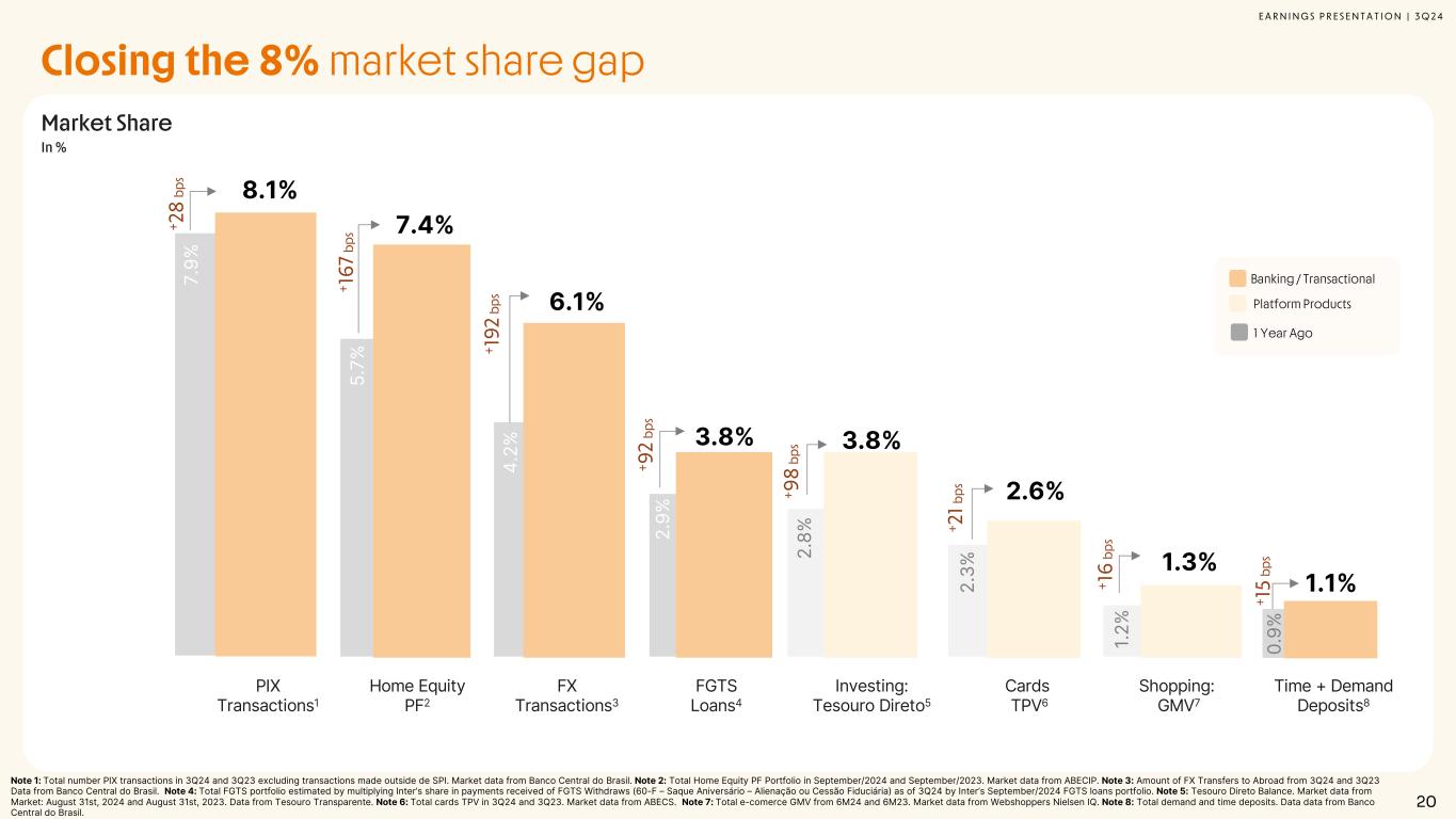 E A R N I N G S P R E S E N T A T I O N | 3 Q 2 4 Active Clients per Products In millions 19Note 1: Existing products before 1Q19, however the actual number of active clients starts only from 1Q20 in order to fit the graph. Note 2: Excluding clients that has only “CDB Meu Porquinho” linked products. Note 3: Number of active contracts in the end of the period. Older Funding Products Lending Products Newer Transactional Products Quarters of Relationship 0 1 2 3 4 5 1 3 5 7 9 11 13 15 17 19 21 23 0 1 2 3 4 5 1 3 5 7 9 11 13 15 17 19 21 23 0 1 2 3 4 5 1 3 5 7 9 11 13 15 17 19 21 23 Ac tiv e C lie nt s (in m ill io ns ) 18.0 MM Deposits1 7.9MM Debit Card1 6.5MM Bill Payment (Boleto)1 4.1 MM Credit Cards1 3.8 MM CDB1,2 2.5 MM Top-Ups1 1.8 MM Savings Dep.1 1.4 MM Cards Insurance1,3 15.2 MM Pix 2.0 MM FGTS 10.0 MM Inter Loop 2.6 MM Piggy Bank Strength of our ecosystem validated by accelerating product adoption 1.2MM FGTS Insurance3