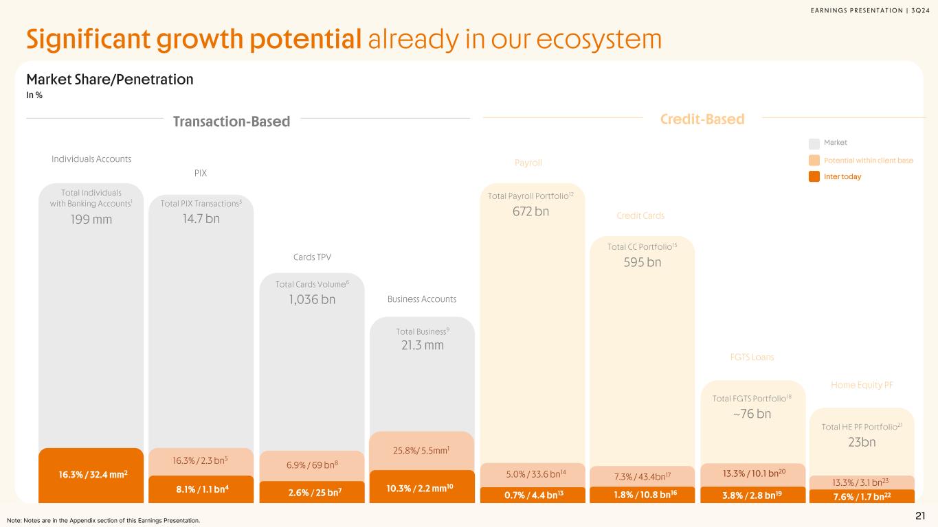 E A R N I N G S P R E S E N T A T I O N | 3 Q 2 4 Total Individuals with Banking Accounts1 199 mm Total PIX Transactions3 14.7 bn Total Cards Volume6 1,036 bn Total Business9 21.3 mm Total Payroll Portfolio12 672 bn Total CC Portfolio15 595 bn Total FGTS Portfolio18 ~76 bn Total HE PF Portfolio21 23bn Significant growth potential already in our ecosystem Market Share/Penetration In % Transaction-Based Individuals Accounts Business Accounts PIX Cards TPV Payroll Credit Cards FGTS Loans Home Equity PF Credit-Based Potential within client base Inter today Market 25.8%/ 5.5mm1 16.3% / 2.3 bn5 6.9% / 69 bn8 5.0% / 33.6 bn14 7.3% / 43.4bn17 13.3% / 10.1 bn20 13.3% / 3.1 bn23 16.3% / 32.4 mm2 8.1% / 1.1 bn4 2.6% / 25 bn7 10.3% / 2.2 mm10 0.7% / 4.4 bn13 1.8% / 10.8 bn16 3.8% / 2.8 bn19 7.6% / 1.7 bn22 21Note: Notes are in the Appendix section of this Earnings Presentation.