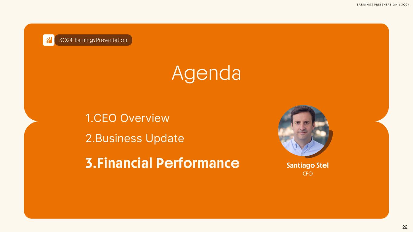 E A R N I N G S P R E S E N T A T I O N | 3 Q 2 4 22 Agenda 1.CEO Overview 2.Business Update 3.Financial Performance 3Q24 Earnings Presentation Santiago Stel CFO