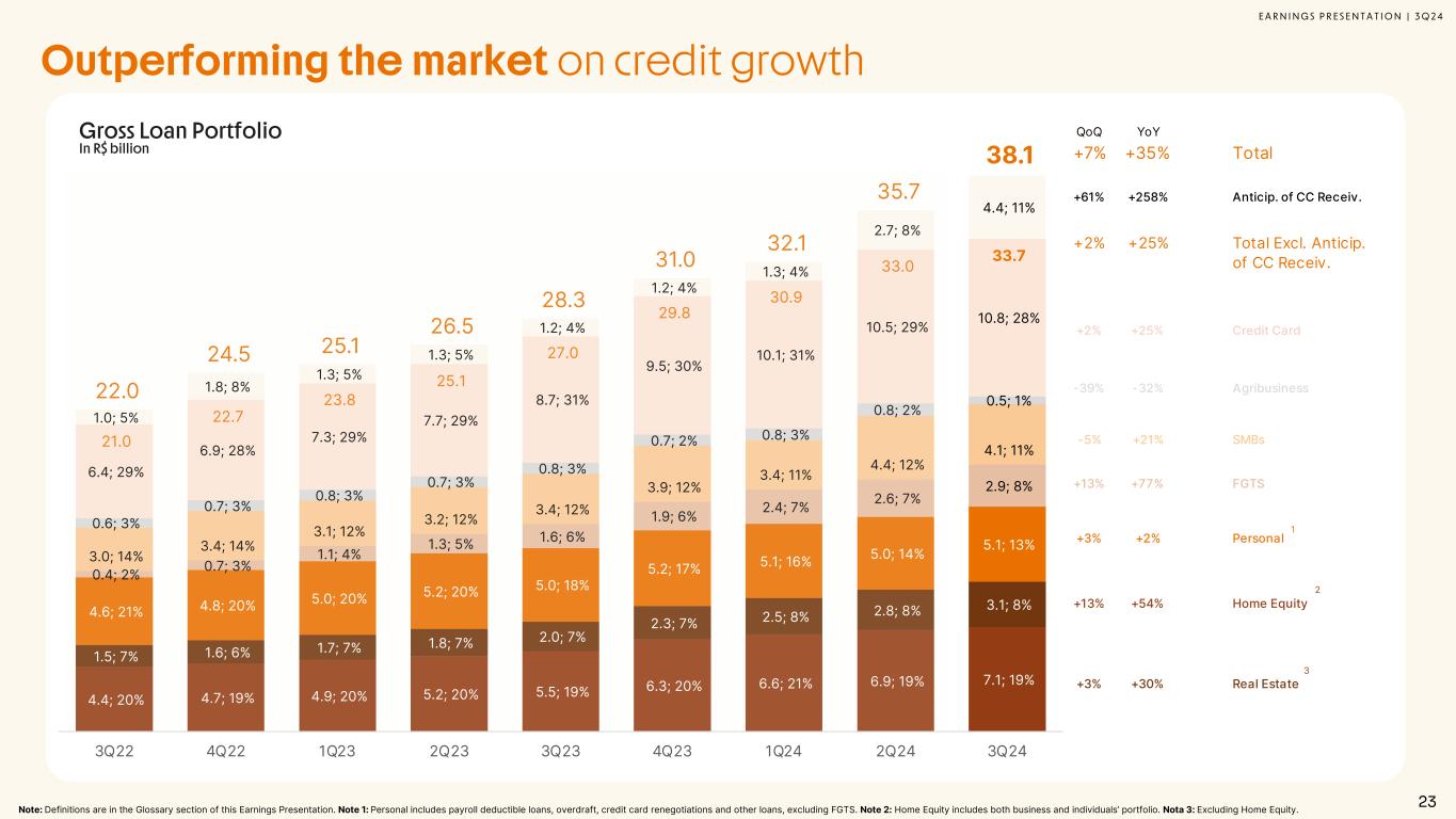 E A R N I N G S P R E S E N T A T I O N | 3 Q 2 4 23 QoQ YoY +7% +35% Total +61% +258% Anticip. of CC Receiv. +2% +25% Total Excl. Anticip. of CC Receiv. +2% +25% Credit Card -39% -32% Agribusiness -5% +21% SMBs +13% +77% FGTS +3% +2% Personal +13% +54% Home Equity +3% +30% Real Estate Note: Definitions are in the Glossary section of this Earnings Presentation. Note 1: Personal includes payroll deductible loans, overdraft, credit card renegotiations and other loans, excluding FGTS. Note 2: Home Equity includes both business and individuals’ portfolio. Nota 3: Excluding Home Equity. 1 2 3 4.4; 20% 4.7; 19% 4.9; 20% 5.2; 20% 5.5; 19% 6.3; 20% 6.6; 21% 6.9; 19% 7.1; 19% 1.5; 7% 1.6; 6% 1.7; 7% 1.8; 7% 2.0; 7% 2.3; 7% 2.5; 8% 2.8; 8% 3.1; 8% 4.6; 21% 4.8; 20% 5.0; 20% 5.2; 20% 5.0; 18% 5.2; 17% 5.1; 16% 5.0; 14% 5.1; 13% 0.4; 2% 0.7; 3% 1.1; 4% 1.3; 5% 1.6; 6% 1.9; 6% 2.4; 7% 2.6; 7% 2.9; 8% 3.0; 14% 3.4; 14% 3.1; 12% 3.2; 12% 3.4; 12% 3.9; 12% 3.4; 11% 4.4; 12% 4.1; 11% 0.6; 3% 0.7; 3% 0.8; 3% 0.7; 3% 0.8; 3% 0.7; 2% 0.8; 3% 0.8; 2% 0.5; 1% 6.4; 29% 6.9; 28% 7.3; 29% 7.7; 29% 8.7; 31% 9.5; 30% 10.1; 31% 10.5; 29% 10.8; 28% 21.0 22.7 23.8 25.1 27.0 29.8 30.9 33.0 33.7 1.0; 5% 1.8; 8% 1.3; 5% 1.3; 5% 1.2; 4% 1.2; 4% 1.3; 4% 2.7; 8% 4.4; 11% 22.0 24.5 25.1 26.5 28.3 31.0 32.1 35.7 38.1 - 5 .0 1 0. 0 1 5. 0 2 0 .0 2 5. 0 3 0 .0 3 5. 0 4 0 .0 3Q22 4Q22 1Q23 2Q23 3Q23 4Q23 1Q24 2Q24 3Q24 Gross Loan Portfolio In R$ billion Outperforming the market on credit growth