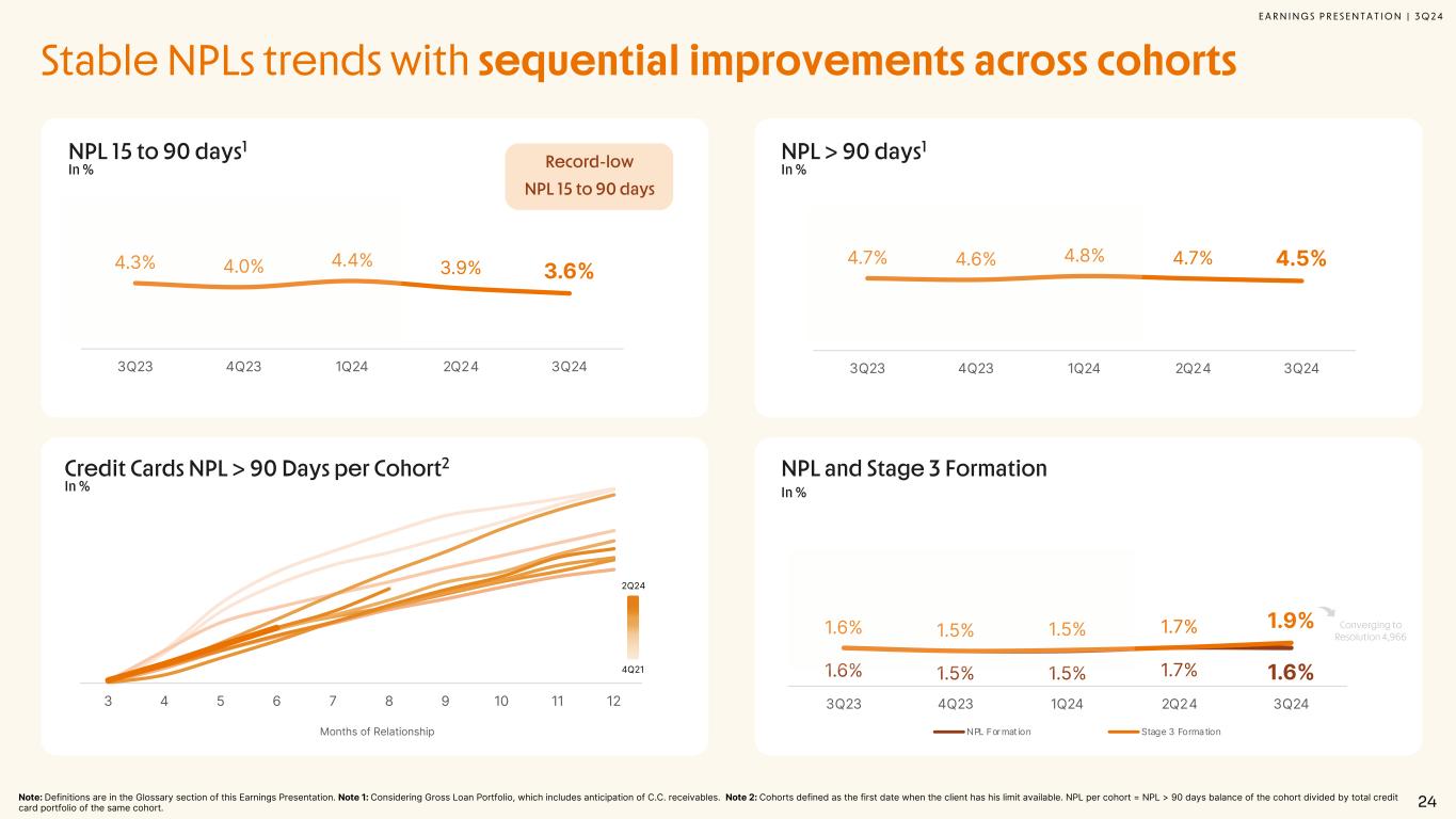 E A R N I N G S P R E S E N T A T I O N | 3 Q 2 4 3 4 5 6 7 8 9 10 11 12 NPL > 90 days1 In % Credit Cards NPL > 90 Days per Cohort2 In % NPL 15 to 90 days1 In % NPL and Stage 3 Formation In % Note: Definitions are in the Glossary section of this Earnings Presentation. Note 1: Considering Gross Loan Portfolio, which includes anticipation of C.C. receivables. Note 2: Cohorts defined as the first date when the client has his limit available. NPL per cohort = NPL > 90 days balance of the cohort divided by total credit card portfolio of the same cohort. 2Q24 4Q21 24 4.7% 4.6% 4.8% 4.7% 4.5% 0 .0 % 1. 0% 2 .0 % 3 .0 % 4 .0 % 5 .0 % 6 .0 % 7 .0 % 8 .0 % 9 .0 % 10 .0 % 3Q23 4Q23 1Q24 2Q24 3Q24 1.6% 1.5% 1.5% 1.7% 1.6% 1.6% 1.5% 1.5% 1.7% 1.9% 0 .0 % 1. 0% 2 .0 % 3 .0 % 4 .0 % 5 .0 % 6 .0 % 7 .0 % 3Q23 4Q23 1Q24 2Q24 3Q24 NPL Format ion Stage 3 Formation 4.3% 4.0% 4.4% 3.9% 3.6% 0 .0 % 1. 0% 2 .0 % 3 .0 % 4 .0 % 5 .0 % 6 .0 % 7 .0 % 8 .0 % 9 .0 % 10 .0 % 3Q23 4Q23 1Q24 2Q24 3Q24 Converging to Resolution 4,966 Months of Relationship Record-low NPL 15 to 90 days Stable NPLs trends with sequential improvements across cohorts