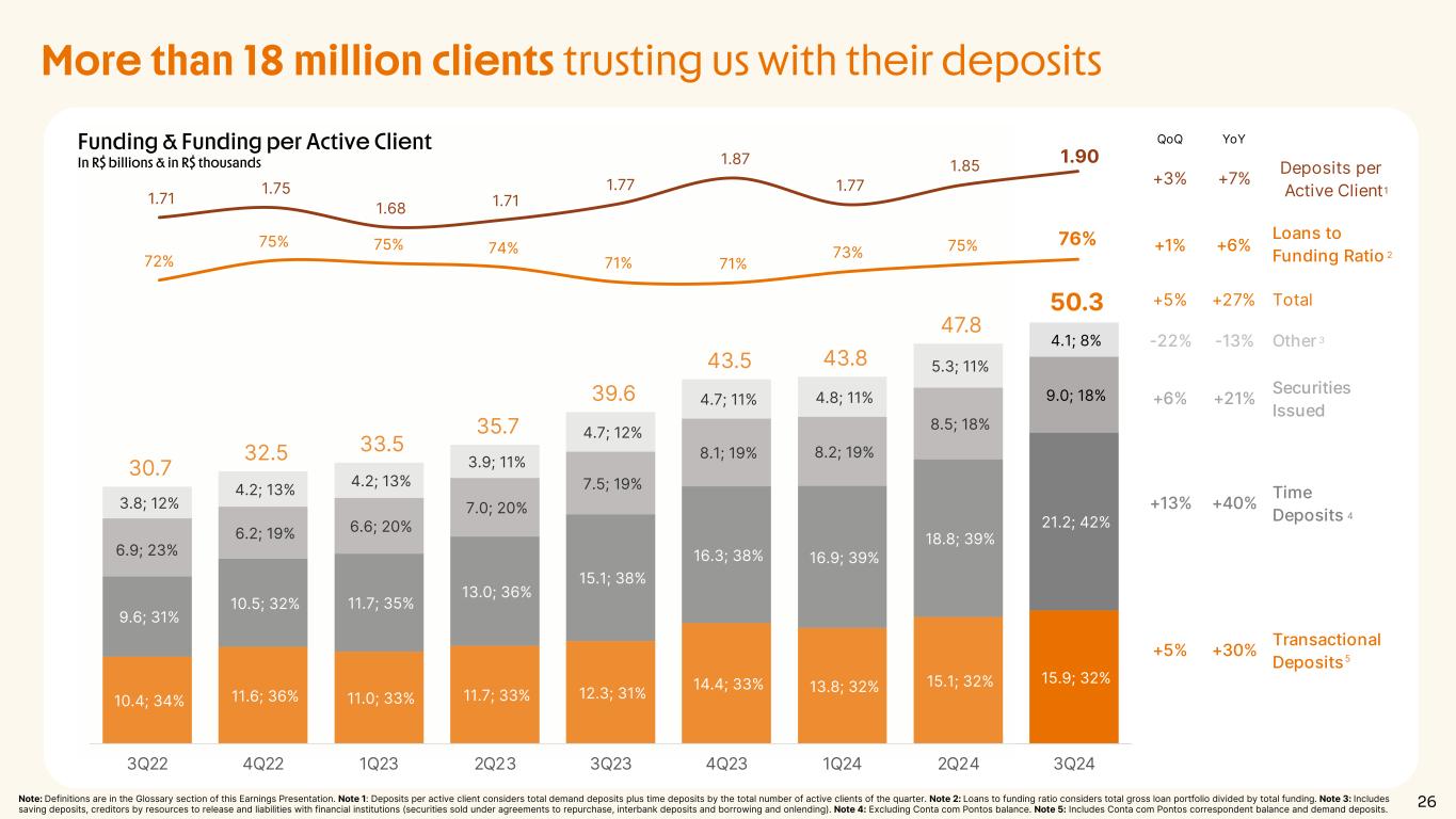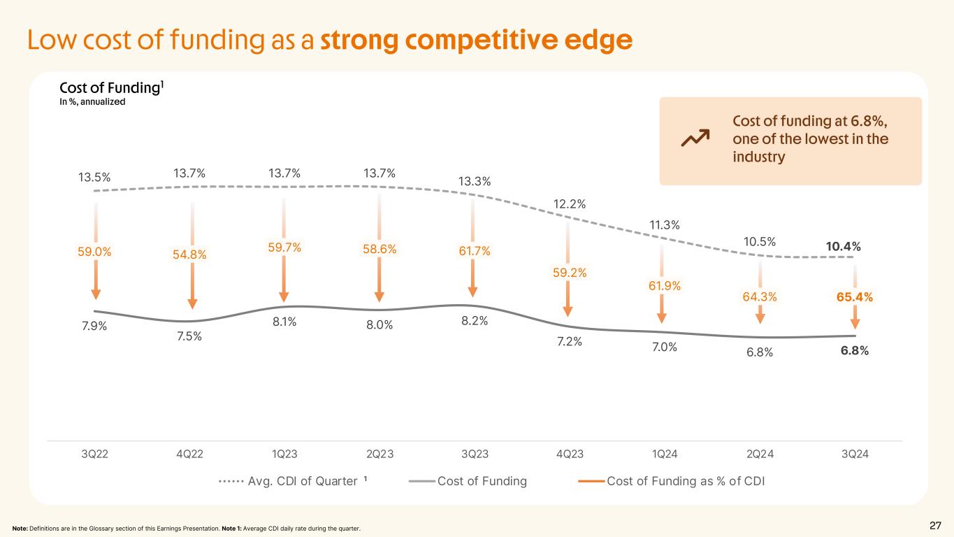 26 QoQ YoY +3% +7% Deposits per Active Client +1% +6% Loans to Funding Ratio +5% +27% Total -22% -13% Other +6% +21% Securities Issued +13% +40% Time Deposits +5% +30% Transactional Deposits 10.4; 34% 11.6; 36% 11.0; 33% 11.7; 33% 12.3; 31% 14.4; 33% 13.8; 32% 15.1; 32% 15.9; 32% 9.6; 31% 10.5; 32% 11.7; 35% 13.0; 36% 15.1; 38% 16.3; 38% 16.9; 39% 18.8; 39% 21.2; 42% 6.9; 23% 6.2; 19% 6.6; 20% 7.0; 20% 7.5; 19% 8.1; 19% 8.2; 19% 8.5; 18% 9.0; 18% 3.8; 12% 4.2; 13% 4.2; 13% 3.9; 11% 4.7; 12% 4.7; 11% 4.8; 11% 5.3; 11% 4.1; 8% 30.7 32.5 33.5 35.7 39.6 43.5 43.8 47.8 50.3 3Q22 4Q22 1Q23 2Q23 3Q23 4Q23 1Q24 2Q24 3Q24 1.71 1.75 1.68 1.71 1.77 1.87 1.77 1.85 1.90 1 .60 1 .65 1 .70 1 .75 1 .80 1 .85 1 .90 1 .95 72% 75% 75% 74% 71% 71% 73% 75% 76% 7 0% 7 2% 7 4% 7 6% 7 8% 8 0% Funding & Funding per Active Client In R$ billions & in R$ thousands Note: Definitions are in the Glossary section of this Earnings Presentation. Note 1: Deposits per active client considers total demand deposits plus time deposits by the total number of active clients of the quarter. Note 2: Loans to funding ratio considers total gross loan portfolio divided by total funding. Note 3: Includes saving deposits, creditors by resources to release and liabilities with financial institutions (securities sold under agreements to repurchase, interbank deposits and borrowing and onlending). Note 4: Excluding Conta com Pontos balance. Note 5: Includes Conta com Pontos correspondent balance and demand deposits. 3 4 5 1 2 More than 18 million clients trusting us with their deposits