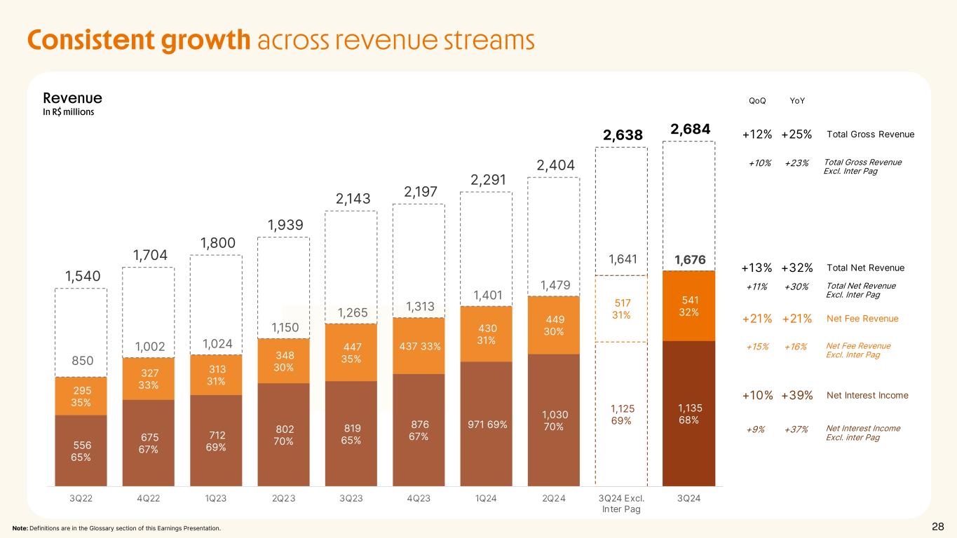 Consistent growth across revenue streams 28Note: Definitions are in the Glossary section of this Earnings Presentation. 556 65% 675 67% 712 69% 802 70% 819 65% 876 67% 971 69% 1,030 70% 1,125 69% 1,135 68% 295 35% 327 33% 313 31% 348 30% 447 35% 437 33% 430 31% 449 30% 517 31% 541 32% 850 1,002 1,024 1,150 1,265 1,313 1,401 1,479 1,641 1,676 1,540 1,704 1,800 1,939 2,143 2,197 2,291 2,404 2,638 2,684 - 5 00 1, 00 0 1, 50 0 2 ,0 00 2 ,50 0 3 ,0 00 3Q22 4Q22 1Q23 2Q23 3Q23 4Q23 1Q24 2Q24 3Q24 Excl. Inter Pag 3Q24 QoQ YoY +12% +25% Total Gross Revenue +13% +32% Total Net Revenue +21% +21% Net Fee Revenue +10% +39% Net Interest Income Revenue In R$ millions +23%+10% Total Gross Revenue Excl. Inter Pag +30%+11% Total Net Revenue Excl. Inter Pag +16%+15% Net Fee Revenue Excl. Inter Pag +37%+9% Net Interest Income Excl. inter Pag