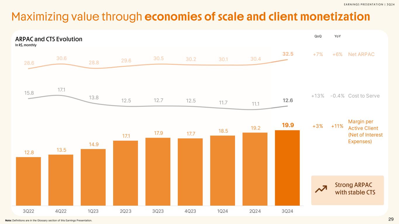 E A R N I N G S P R E S E N T A T I O N | 3 Q 2 4 ARPAC and CTS Evolution In R$, monthly Maximizing value through economies of scale and client monetization 29 Strong ARPAC with stable CTS 12.8 13.5 14.9 17.1 17.9 17.7 18.5 19.2 19.9 28.6 30.6 28.8 29.6 30.5 30.2 30.1 30.4 32.5 15.8 17.1 13.8 12.5 12.7 12.5 11.7 11.1 12.6 3Q22 4Q22 1Q23 2Q23 3Q23 4Q23 1Q24 2Q24 3Q24 QoQ YoY +7% +6% Net ARPAC +13% -0.4% Cost to Serve +3% +11% Margin per Active Client (Net of Interest Expenses) Note: Definitions are in the Glossary section of this Earnings Presentation.