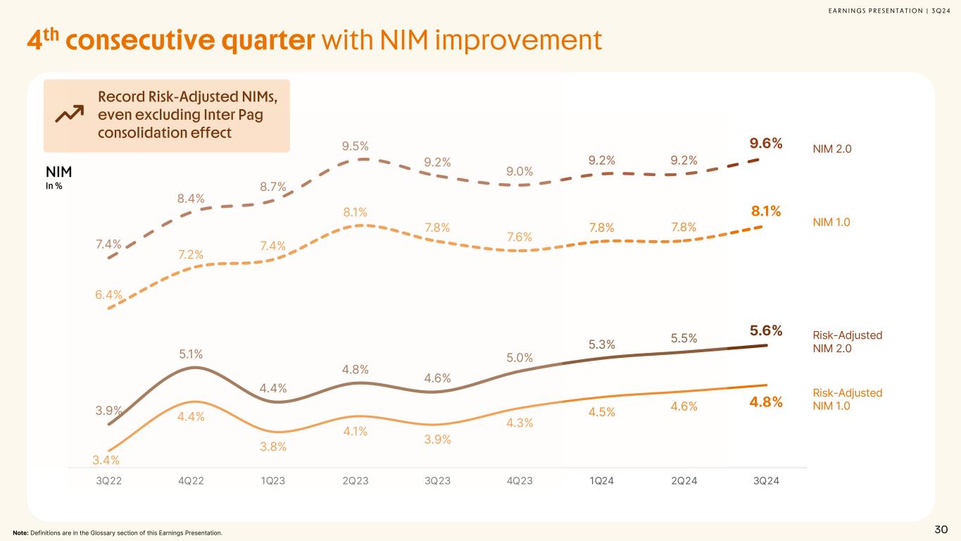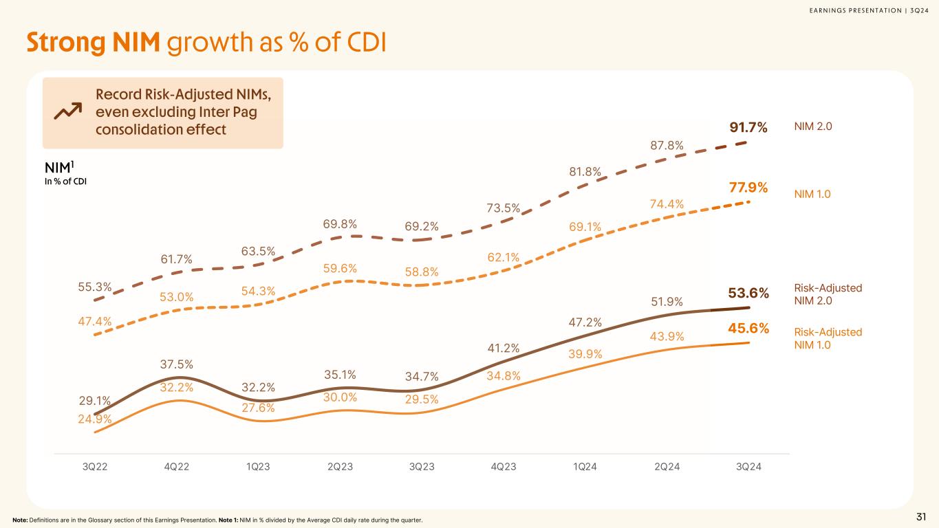 E A R N I N G S P R E S E N T A T I O N | 3 Q 2 4 4th consecutive quarter with NIM improvement Risk-Adjusted NIM 1.0 30 6.4% 7.2% 7.4% 8.1% 7.8% 7.6% 7.8% 7.8% 8.1% 7.4% 8.4% 8.7% 9.5% 9.2% 9.0% 9.2% 9.2% 9.6% 3.9% 5.1% 4.4% 4.8% 4.6% 5.0% 5.3% 5.5% 5.6% 3.4% 4.4% 3.8% 4.1% 3.9% 4.3% 4.5% 4.6% 4.8% 3. 0% 4. 0% 5. 0% 6. 0% 7. 0% 8. 0% 9. 0% 10. 0% 3Q22 4Q22 1Q23 2Q23 3Q23 4Q23 1Q24 2Q24 3Q24 Risk-Adjusted NIM 2.0 NIM 2.0 NIM 1.0 Record Risk-Adjusted NIMs, even excluding Inter Pag consolidation effect NIM In % Note: Definitions are in the Glossary section of this Earnings Presentation.