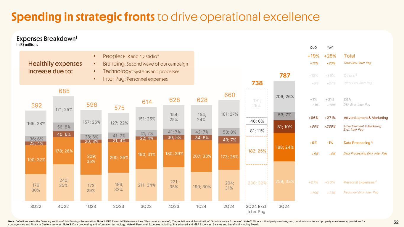 Note: Definitions are in the Glossary section of this Earnings Presentation. Note 1: IFRS Financial Statements lines: “Personnel expenses”, “Depreciation and Amortization”, “Administrative Expenses”. Note 2: Others = third party services; rent, condominium fee and property maintenance; provisions for contingencies and Financial System services. Note 3: Data processing and information technology. Note 4: Personnel Expenses including Share-based and M&A Expenses. Salaries and benefits (including Board). Expenses Breakdown1 In R$ millions 32 176; 30% 240; 35% 172; 29% 186; 32% 211; 34% 221; 35% 190; 30% 204; 31% 238; 32% 259; 33% 190; 32% 178; 26% 209; 35% 200; 35% 190; 31% 180; 29% 207; 33% 173; 26% 182; 25% 188; 24% 23; 4% 40; 6% 20; 3% 21; 4% 22; 4% 30; 5% 34; 5% 49; 7% 81; 11% 81; 10% 36; 6% 56; 8% 38; 6% 41; 7% 41; 7% 41; 7% 42; 7% 53; 8% 46; 6% 53; 7% 166; 28% 171; 25% 157; 26% 127; 22% 151; 25% 154; 25% 154; 24% 181; 27% 191; 26% 206; 26% 592 685 596 575 614 628 628 660 738 787 - 1 0 2 0 0 3 0 0 4 0 0 5 0 0 6 0 0 7 0 0 8 0 0 9 0 0 3Q22 4Q22 1Q23 2Q23 3Q23 4Q23 1Q24 2Q24 3Q24 Excl. Inter Pag 3Q24 QoQ YoY +19% +28% Total +13% +36% Others +1% +31% D&A +66% +271% Advertisement & Marketing +9% -1% Data Processing +27% +23% Personal Expenses Healthily expenses increase due to: • People: PLR and “Dissídio” • Branding: Second wave of our campaign • Technology: Systems and processes • Inter Pag: Personnel expenses 4 3 +20%+12% Total Excl. Inter Pag +27%+6% Other Excl. Inter Pag +14%-13% D&A Excl. Inter Pag +269%+65% Advertisement & Marketing Excl. Inter Pag -4%+5% Data Processing Excl. Inter Pag +13%+16% Personnel Excl. Inter Pag 2 Spending in strategic fronts to drive operational excellence